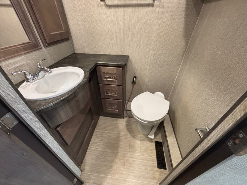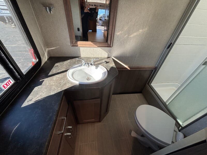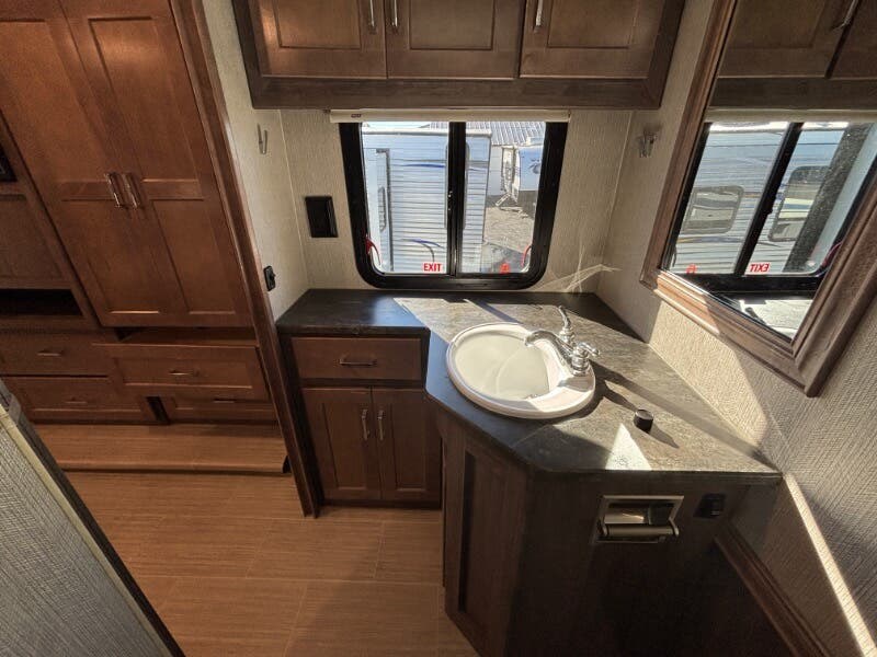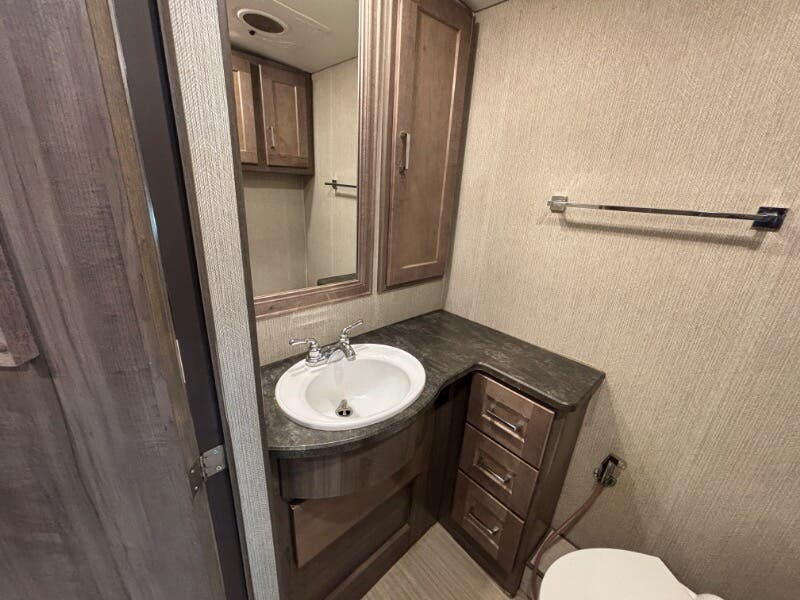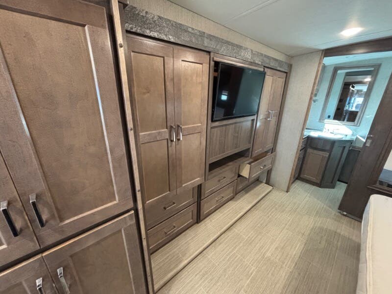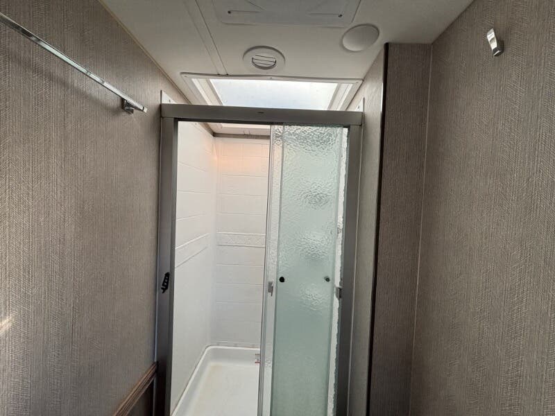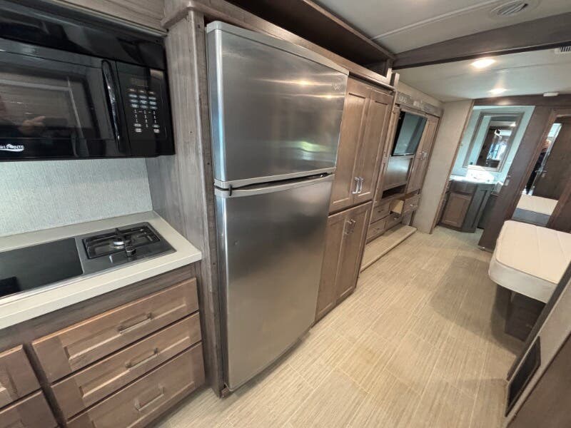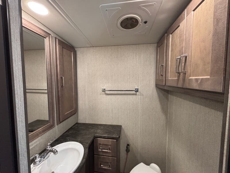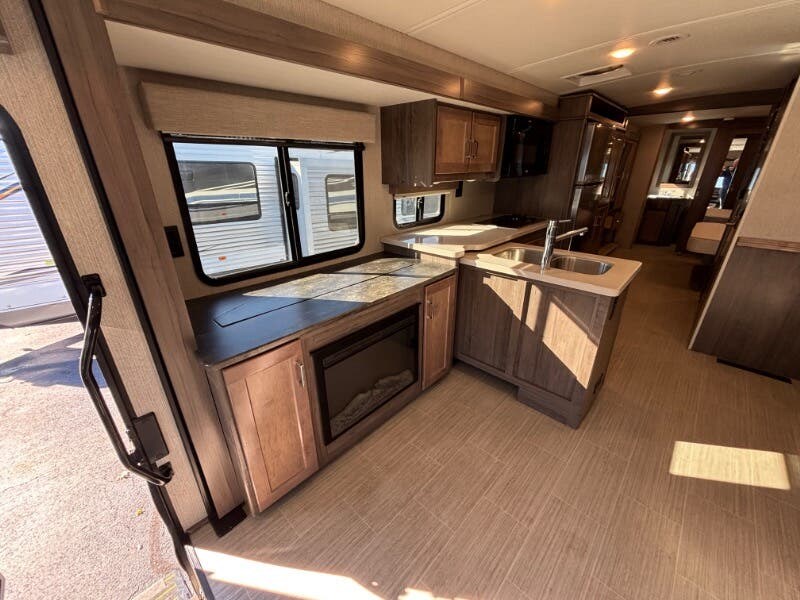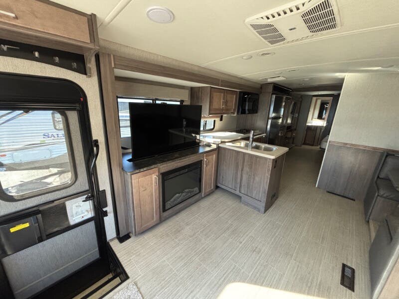 Features Include: 210-Amp Alternator, Hill Start Assist, Map Lights, Tilt Power Steering, Cruise Control, KeyOne Lock System, Entry Assist Handle, Soft Vinyl Ceiling, LED Ceiling Lighting, Sofa Sleeper Dining, Storage Drawer, Walkaround Bed, Medicine Cabinet, Wall Mirror, Linen Storage, Water Pump Switches, Flexible Showerhead, Bathroom Skylight, Solar-Prep, Generator Auto-Start, 18-Gal LP Capacity, 50-Amp Service Cord, Rear 13.5k AC, 30k or 40k Furnace, On Demand Water Pump, 10-Foot Sewer Hose, Fiberglass Roof, Rear Roof Ladder