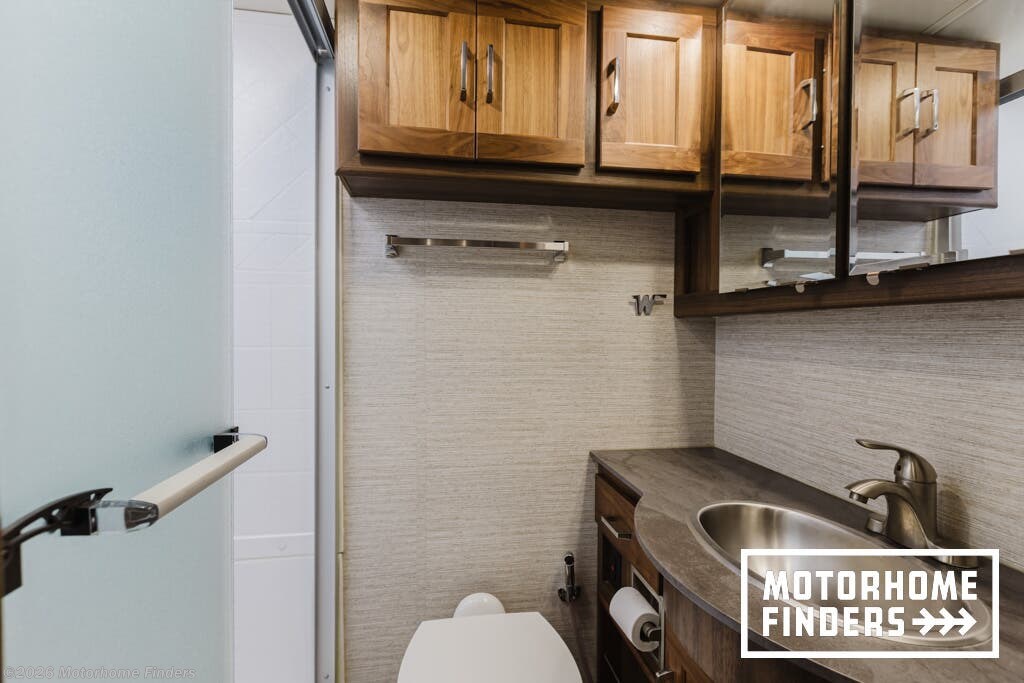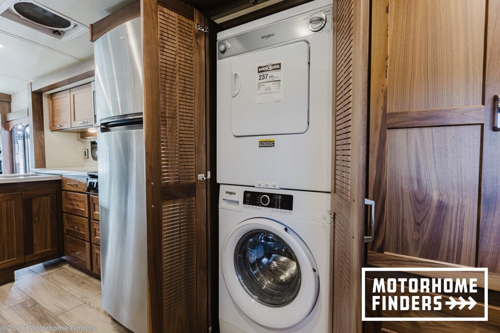 Stacked washer and dryer – Onboard laundry makes long trips and full-time travel far more convenient.