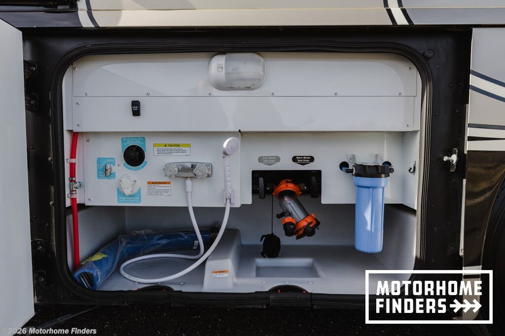 Air Assist Suspension, Automatic Leveling Jacks, Awning, Backup Monitor, Black Tank Flush, External Shower, Full Body Paint, Hitch, Leveling Jacks, Outside Entertainment Center, Pass Thru Storage, Power Awning, Roof Vent, Screen Door, Second Roof A/C, Side View Cameras, Skylight, Slideout, Slide-out Awning, SS Wheel Covers -