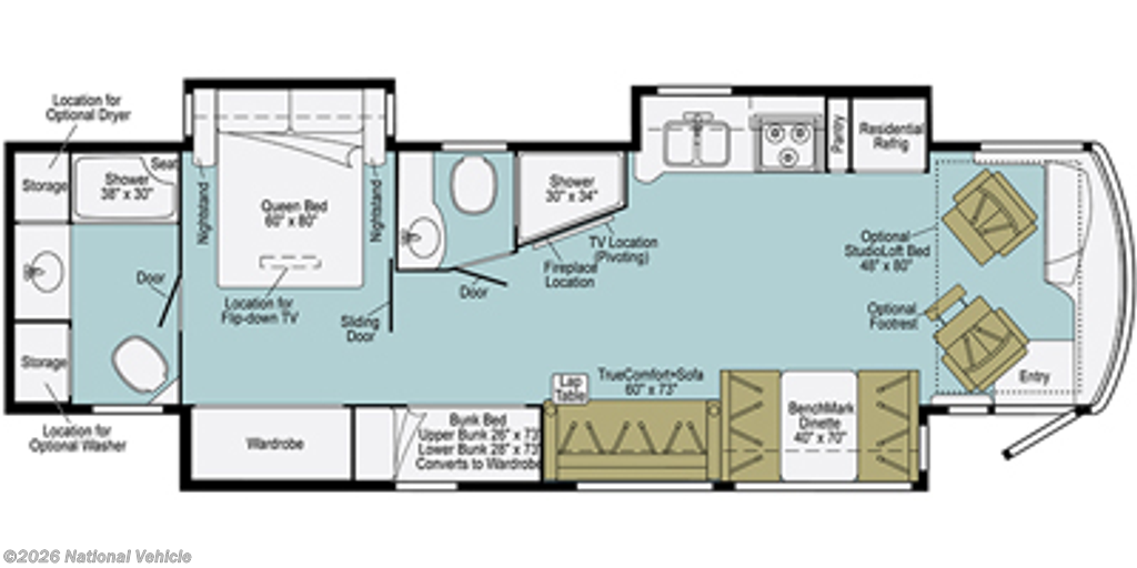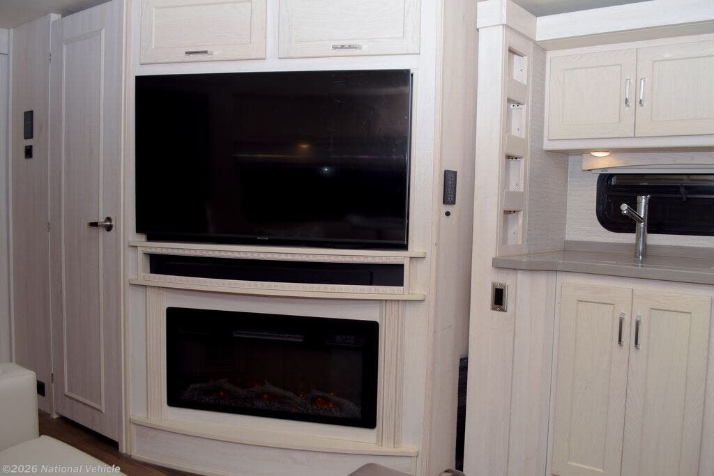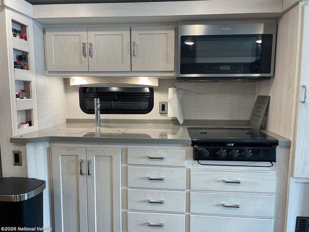 Inside, the 38W boasts a dual-slide floorplan with a four-seat folding dinette and a spacious living area featuring theater seating, a sofa sleeper, and a large entertainment center with fireplace, perfect for relaxing or entertaining guests. The gourmet kitchen includes solid-surface countertops, a residential refrigerator, convection microwave, four-burner cooktop, oven, and abundant storage, making meal preparation convenient and enjoyable on the road.