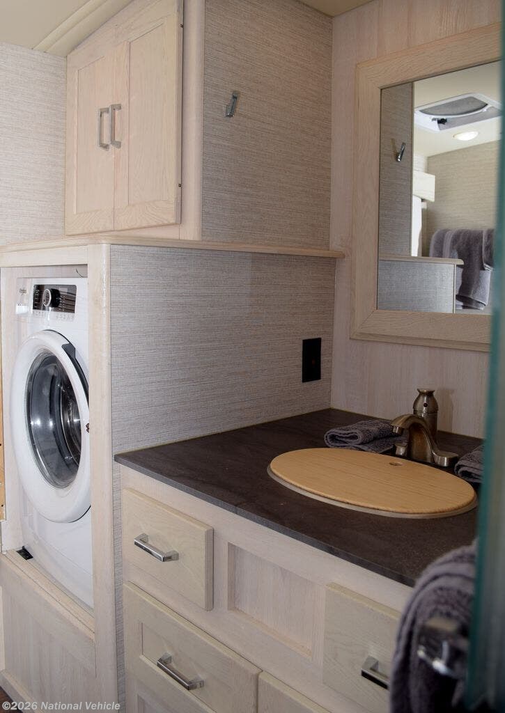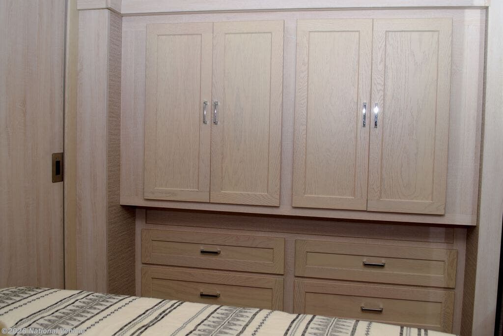 The private rear bedroom offers a king-size bed, wardrobe storage, and washer/dryer prep, while the full bathroom features a residential-style shower and modern fixtures. Exterior highlights include power awnings with LED lighting, generous basement storage, and a built-in outdoor entertainment center, enhancing both comfort and convenience.