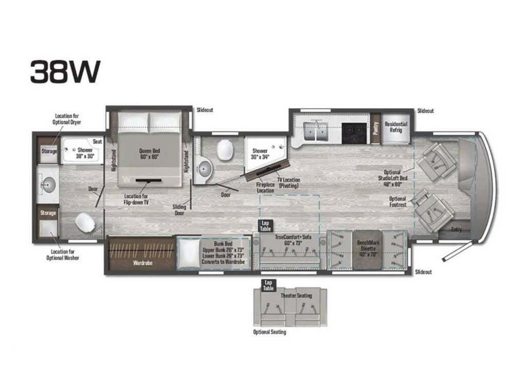 This Forza 38W is designed for maximum comfort and convenience, sleeping up to eight people with a queen-size master bed, bunk beds, and additional sleeping areas.