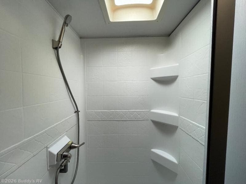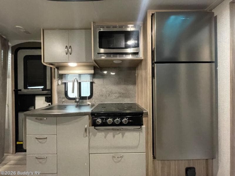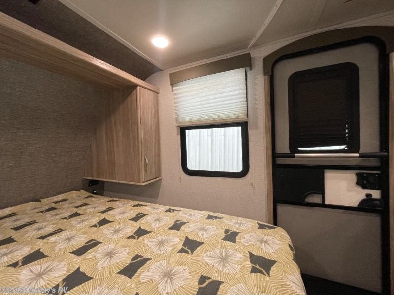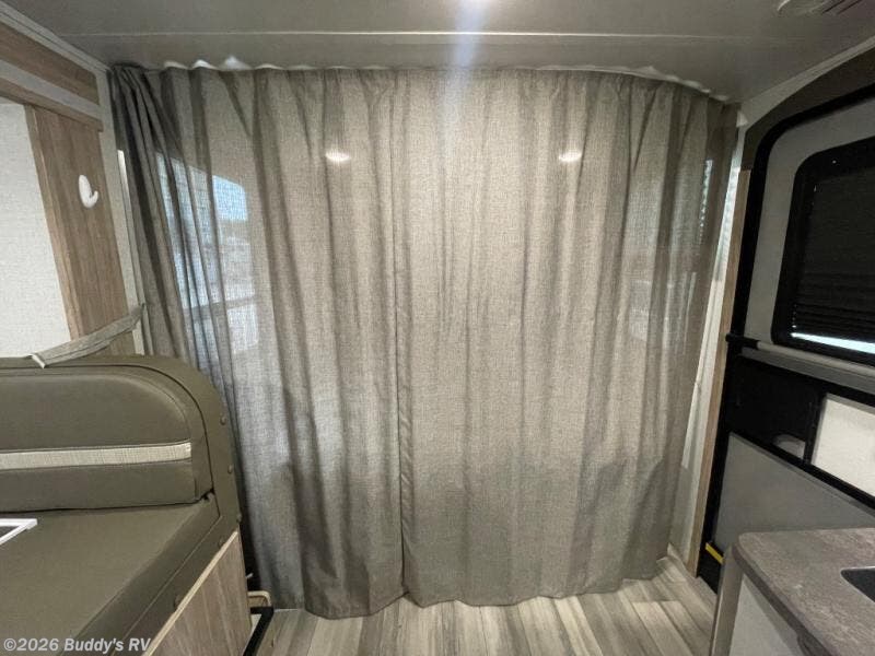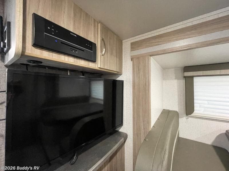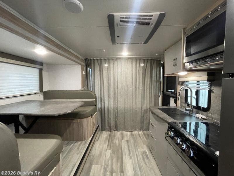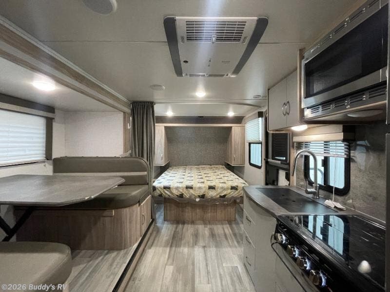 Pack your bags and head to the campground with this travel trailer! You will love all that it has to offer from the full rear bathroom with shower and a wardrobe for your clothes and linens to the front 60" x 74" RV queen bed with a wardrobe on one side, a nightstand on the other, and a privacy curtain to draw at night. The 44" x 72" booth dinette slide is not only a great place to enjoy your meals at or play card games, but it can also be transformed into an extra sleeping space if you want to bring along a guest. When you don't feel like making dinner, you can easily pop in some leftovers or a bag of popcorn into the convection microwave and relax while you watch a movie on the LED TV!