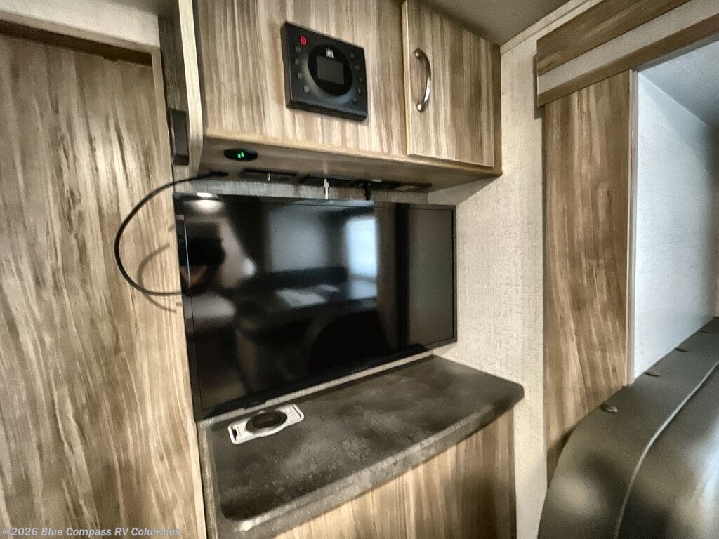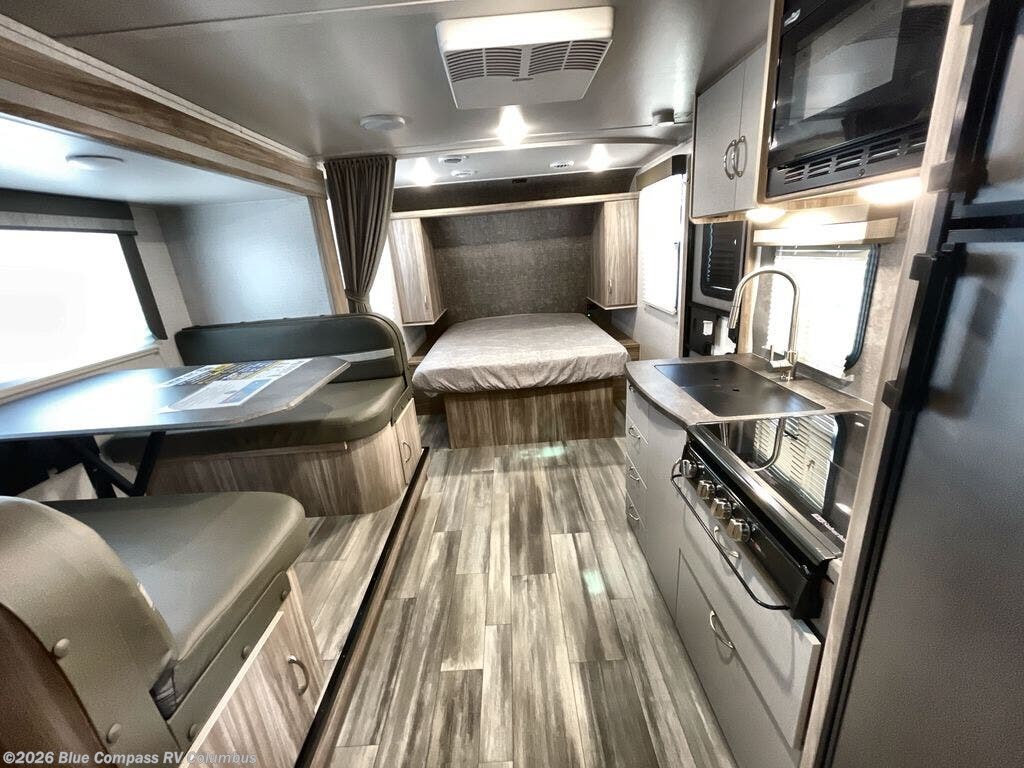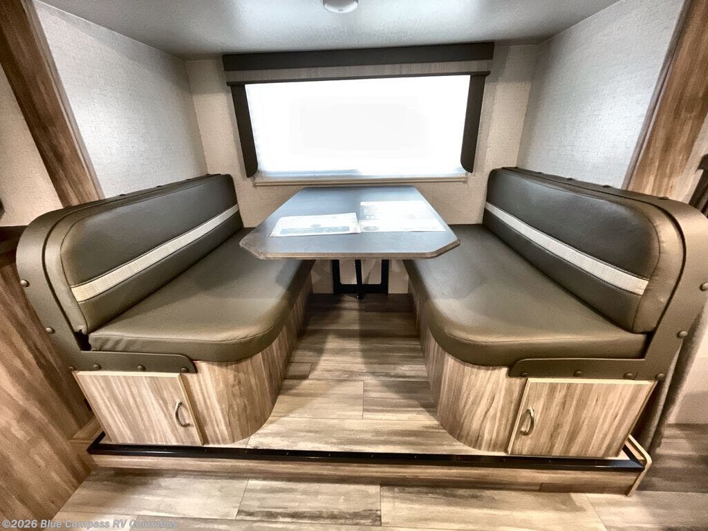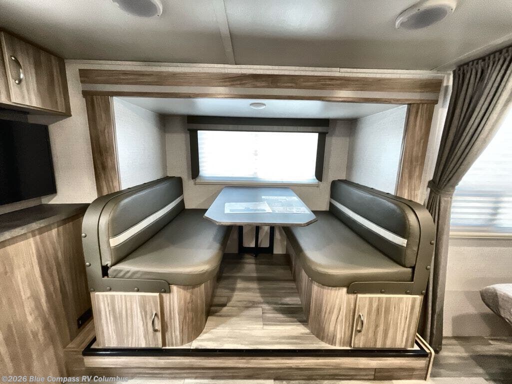 Pack your bags and head to the campground with this travel trailer! You will love all that it has to offer from the full rear bathroom with shower and a wardrobe for your clothes and linens to the front 60" x 74" RV queen bed with a wardrobe on one side, a nightstand on the other, and a privacy curtain to draw at night. The 44" x 72" booth dinette slide is not only a great place to enjoy your meals at or play card games, but it can also be transformed into an extra sleeping space if you want to bring along a guest. When you don't feel like making dinner, you can easily pop in some leftovers or a bag of popcorn into the convection microwave and relax while you watch a movie on the LED TV!