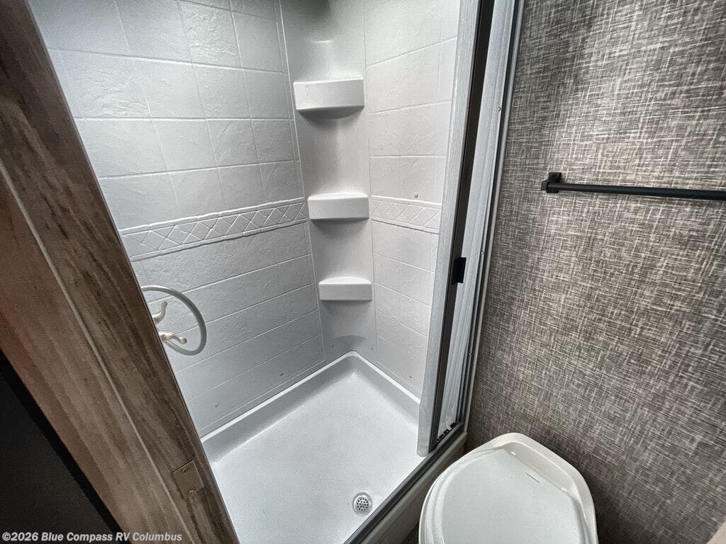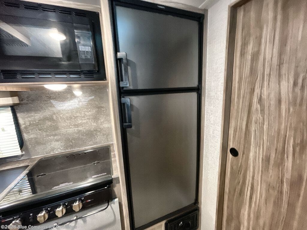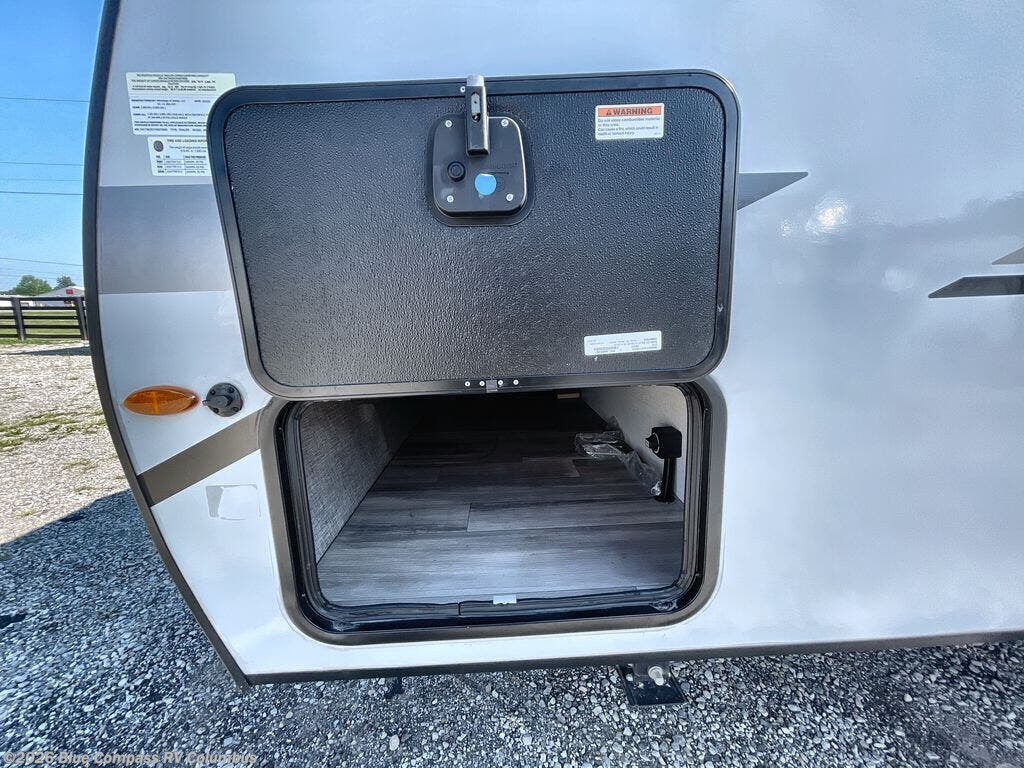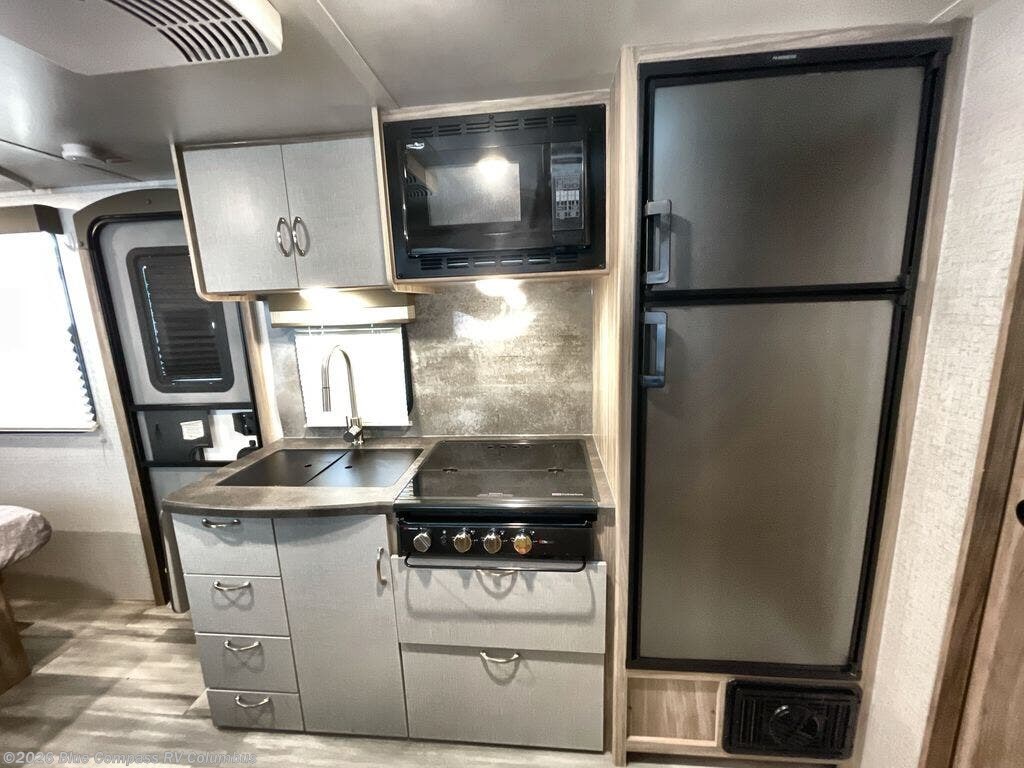 Pack your bags and head to the campground with this travel trailer! You will love all that it has to offer from the full rear bathroom with shower and a wardrobe for your clothes and linens to the front 60" x 74" RV queen bed with a wardrobe on one side, a nightstand on the other, and a privacy curtain to draw at night. The 44" x 72" booth dinette slide is not only a great place to enjoy your meals at or play card games, but it can also be transformed into an extra sleeping space if you want to bring along a guest. When you don't feel like making dinner, you can easily pop in some leftovers or a bag of popcorn into the convection microwave and relax while you watch a movie on the LED TV!