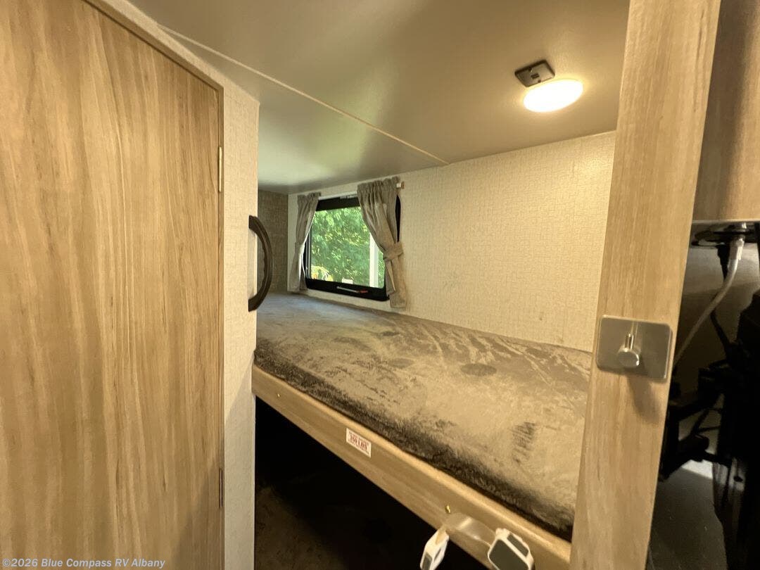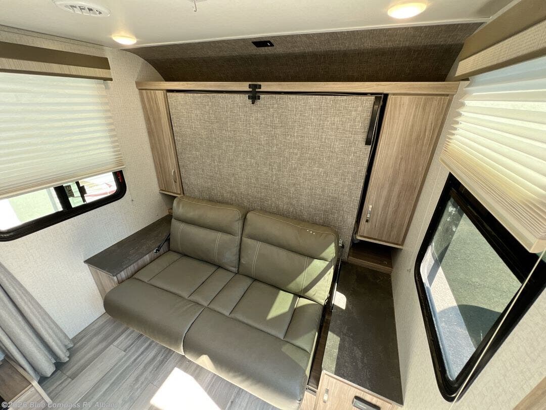 Load your kids into this travel trailer and experience a fun family getaway! The front Murphy bed offers versatile living by transforming into a 54" x 74" bed to sleep on at night and a sofa to sit on during the day. The 44" x 72" booth dinette slide is a great place to enjoy your meals at, play games as a family, and even transform into an extra sleeping space if your kids want a friend to tag along. The kids will love sleeping on the rear corner 28" x 72" bunk beds and having the rear corner bathroom right next to them. As if that wasn't enough, there is an exterior pack-n-play door, a power awning with LED lighting, and patio speakers to crank up the tunes!