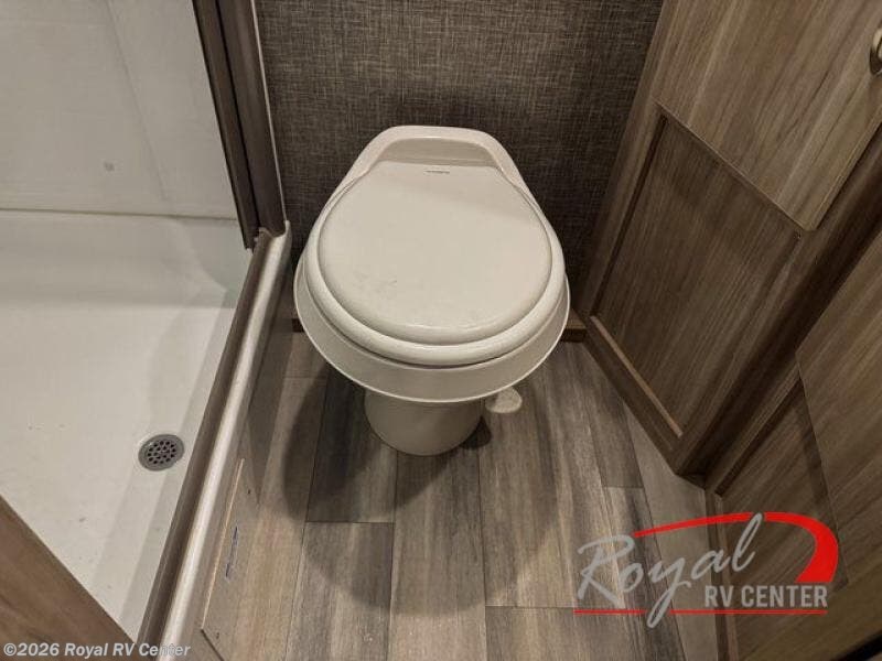 The full rear bathroom includes a 30" x 36" shower, toilet, and wardrobe for towels and storage. A pocket door helps maximize space and privacy.