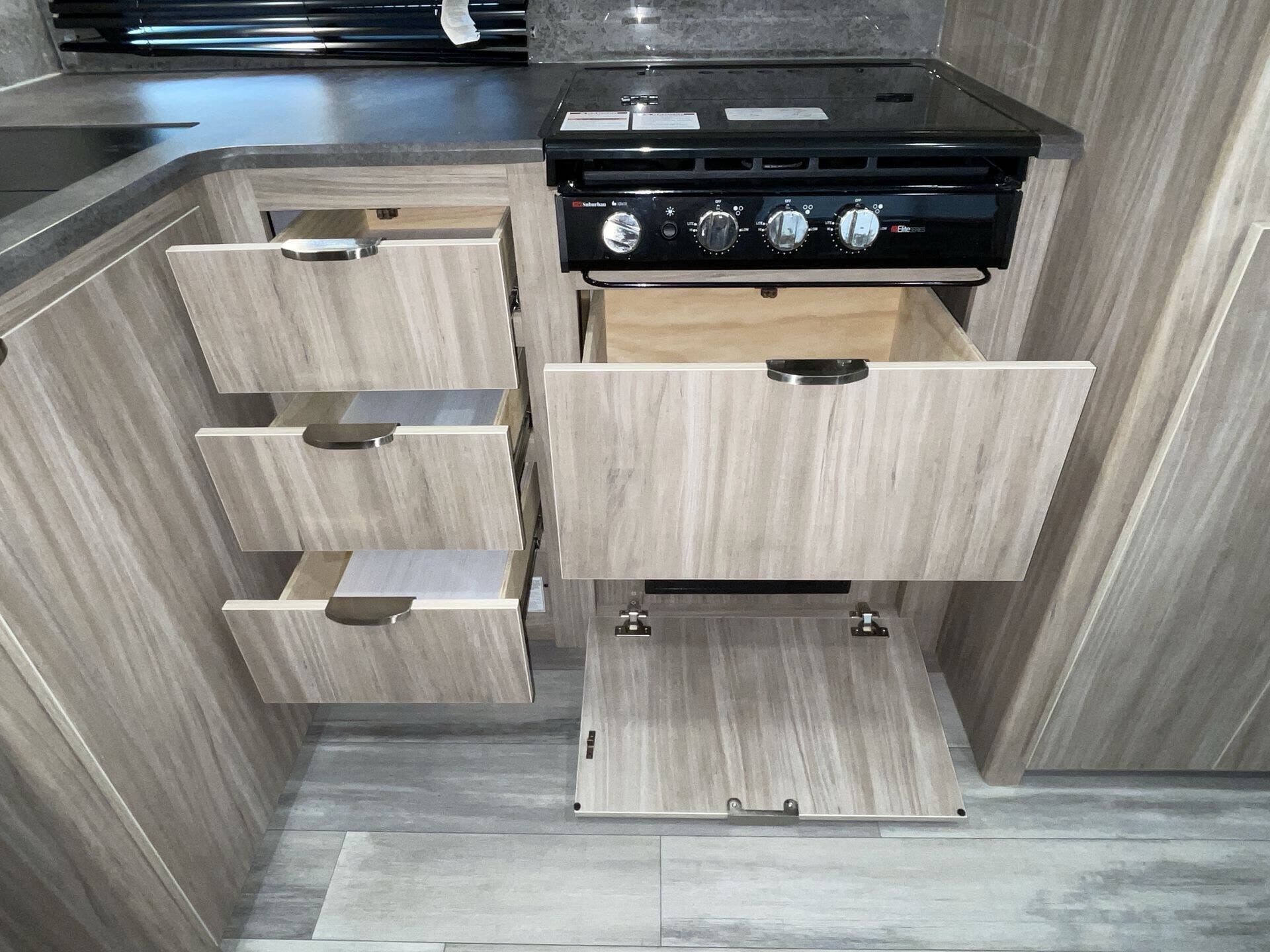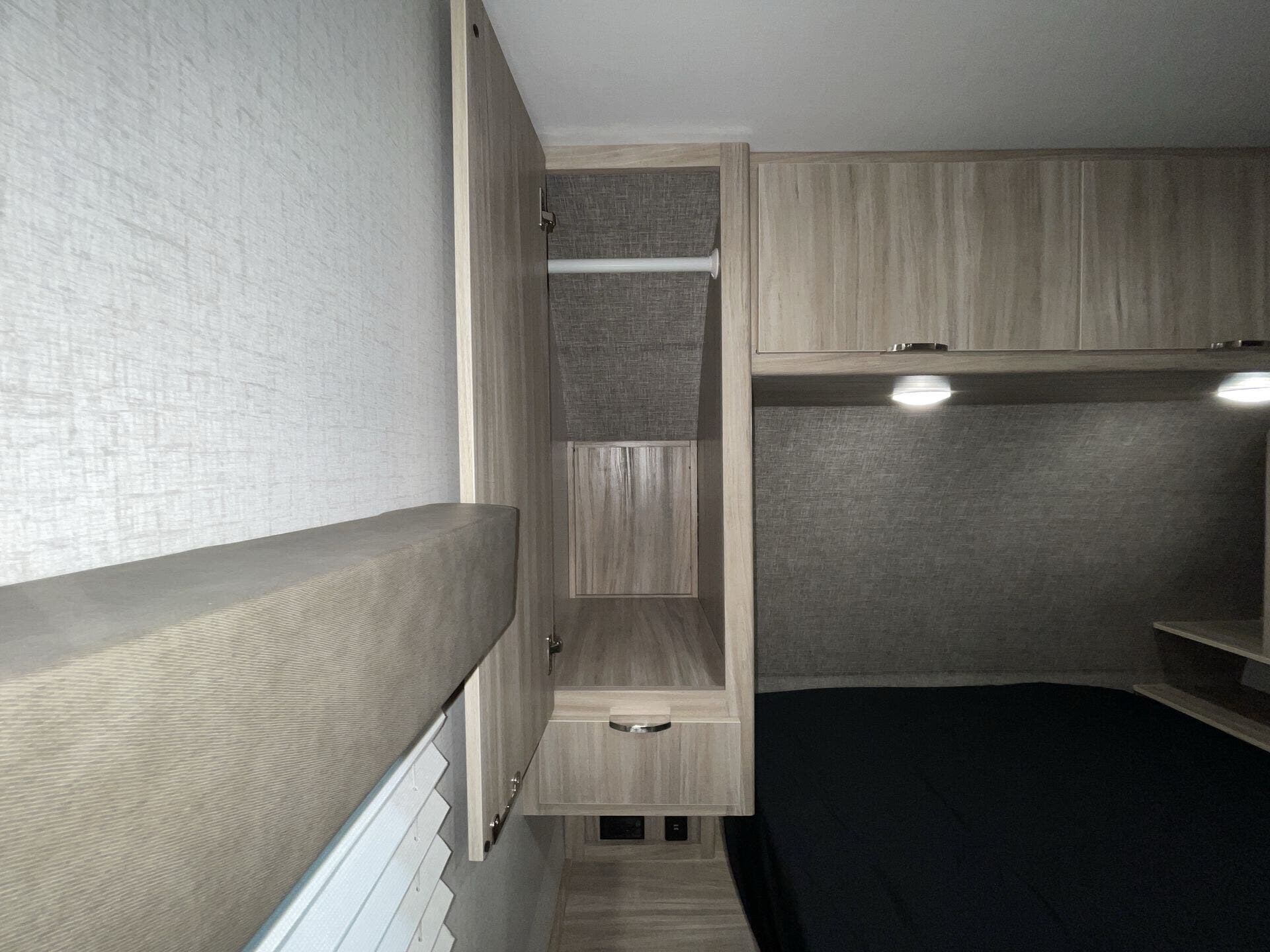 Up front you get a real queen bed, and the rear double bunks are perfect for kids, guests, or even extra storage on the road. The living area is laid out well, and the big tank sizes mean you can stay out longer without constantly worrying about water.