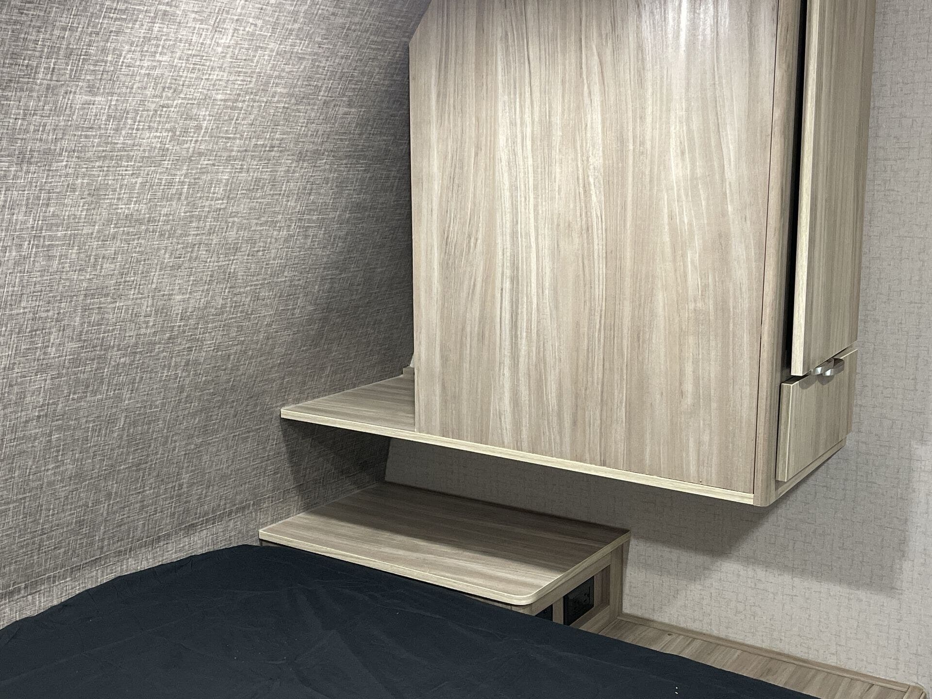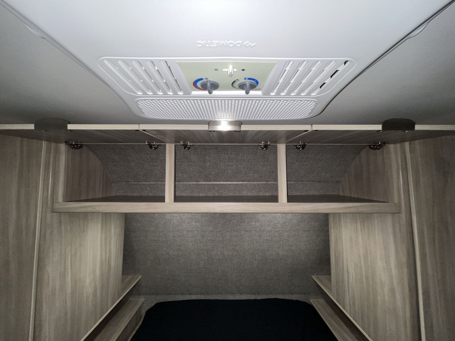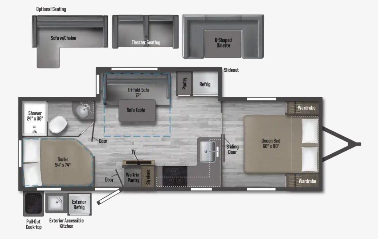 Bunk Beds, Kitchen Sink, Medicine Cabinet, Pantry, Queen Bed, Removable Table, Roof Vents, Toilet, Wardrobe(s)