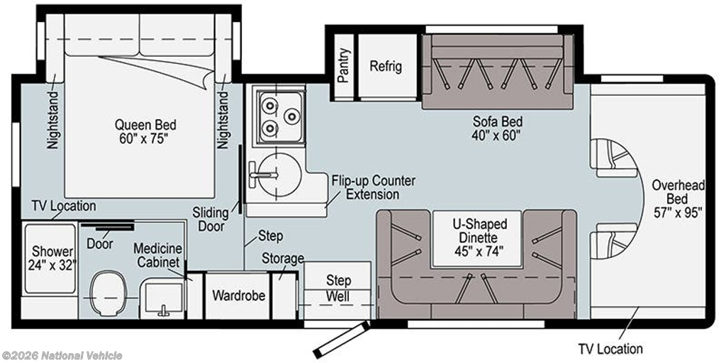 Queen bed, dinette-bed, sofa-bed, and cabover bunk for versatile sleeping arrangements