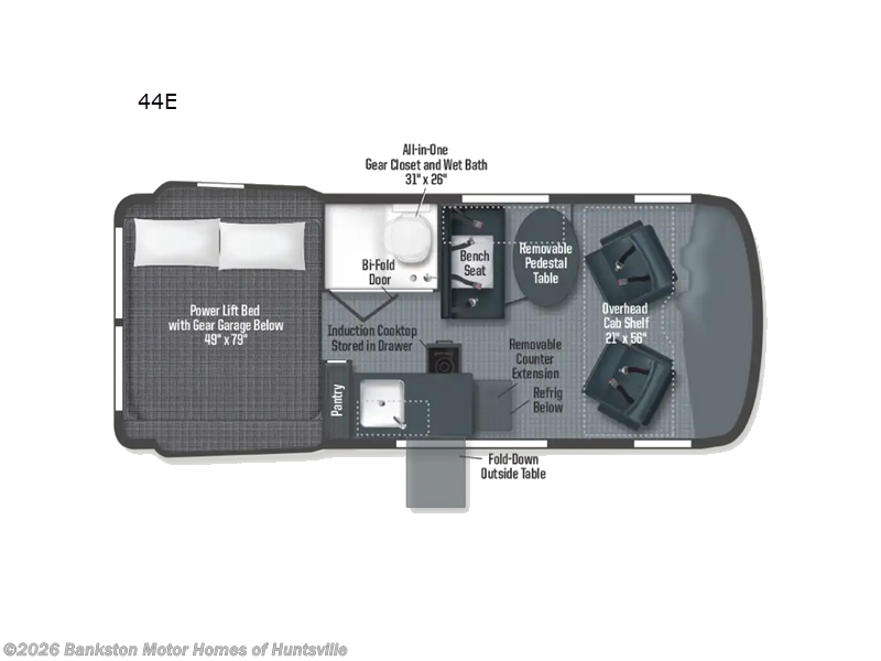 Looking for adventure yet not sure which road you will take? This camper van offers the outdoor enthusiast a way to venture the unknown with a 4-wheel drive motorhome. Once at your destination, you can easily set up the interior with the power lift bed in the rear, or relax under the power awning with LED lighting and Bluetooth control. There is even a fold-down outside table to dine outdoors if you want. You will find storage throughout including in the gear garage below the bed where you can store your hiking sticks and backpacks. The cook will have an induction cooktop, a stainless steel sink, and a removable counter extension for more prep space. There is seating on the driver and passengers seats that swivel to face the bench seat with a removable pedestal table, and there is a wet bath to keep everyone refreshed.