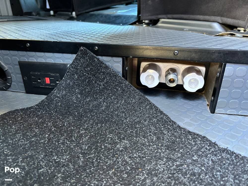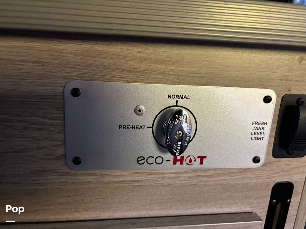 The living area includes a sofa sleeper, shower, cassette toilet, ceiling vents, control center, water heater, and skylight. Interior lighting, tinted windows, and USB charging ports support daily use, while dash air conditioning and heat help manage the climate.