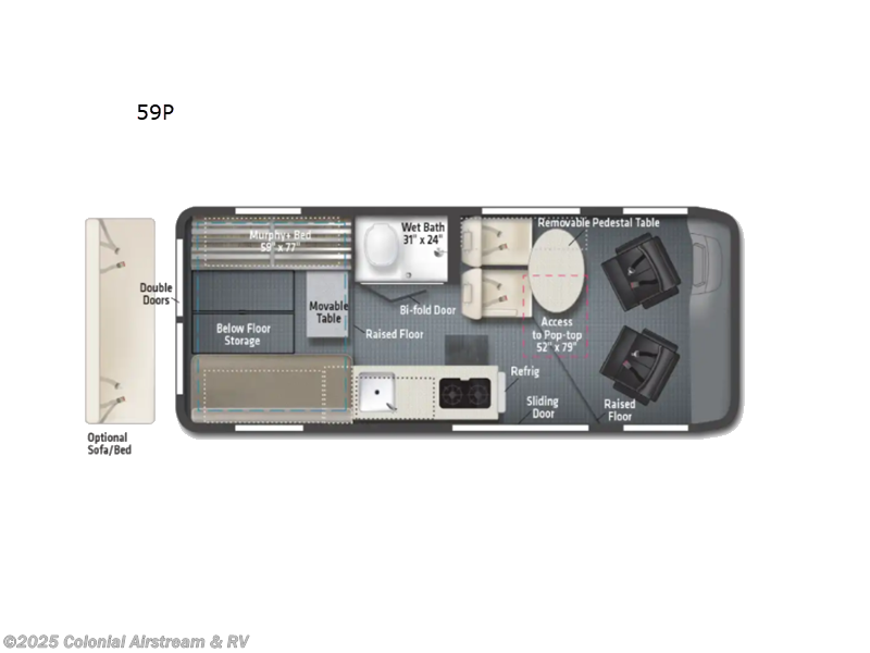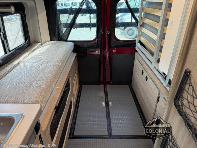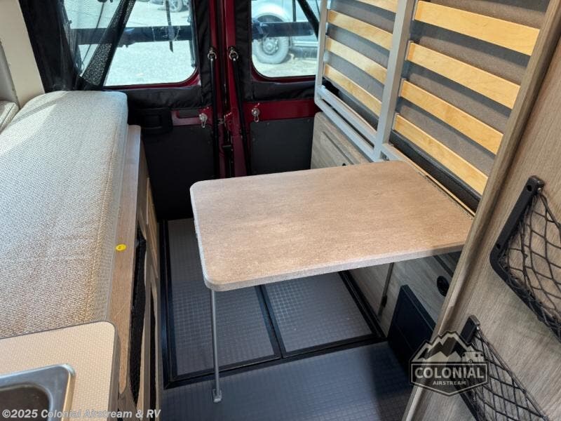 Enjoy a weekend ride in the mountains or make it an overnight stay with versatile sleeping options in this camper van. You'll find the Murphy+ bed in the back will provide a great night's rest, or you can choose the optional sofa/bed with added belted seating if you have more tag-alongs. And of course the little ones will love the pop-top sleeping area to climb into each night. After you've freshened up in the convenient wet bath, prepare breakfast on the two burner range, and the milk and eggs can go back in the 3.0 cu. ft. single door refrigerator/freezer. This model also includes rear double doors with screens to let the breeze in and keep bugs out!