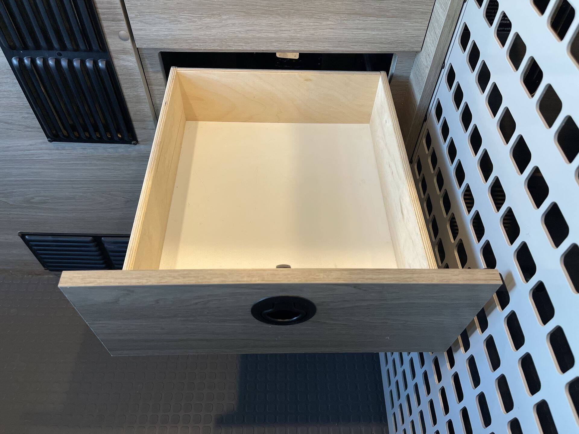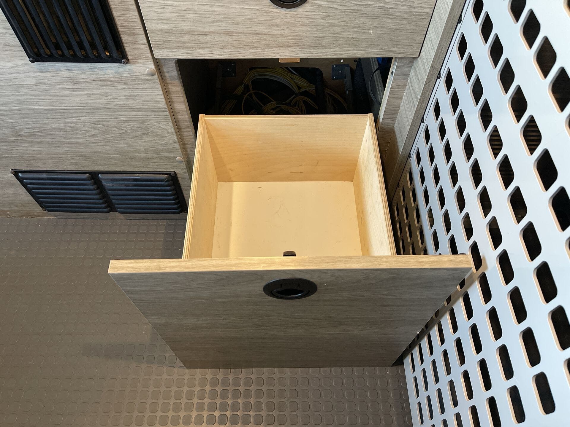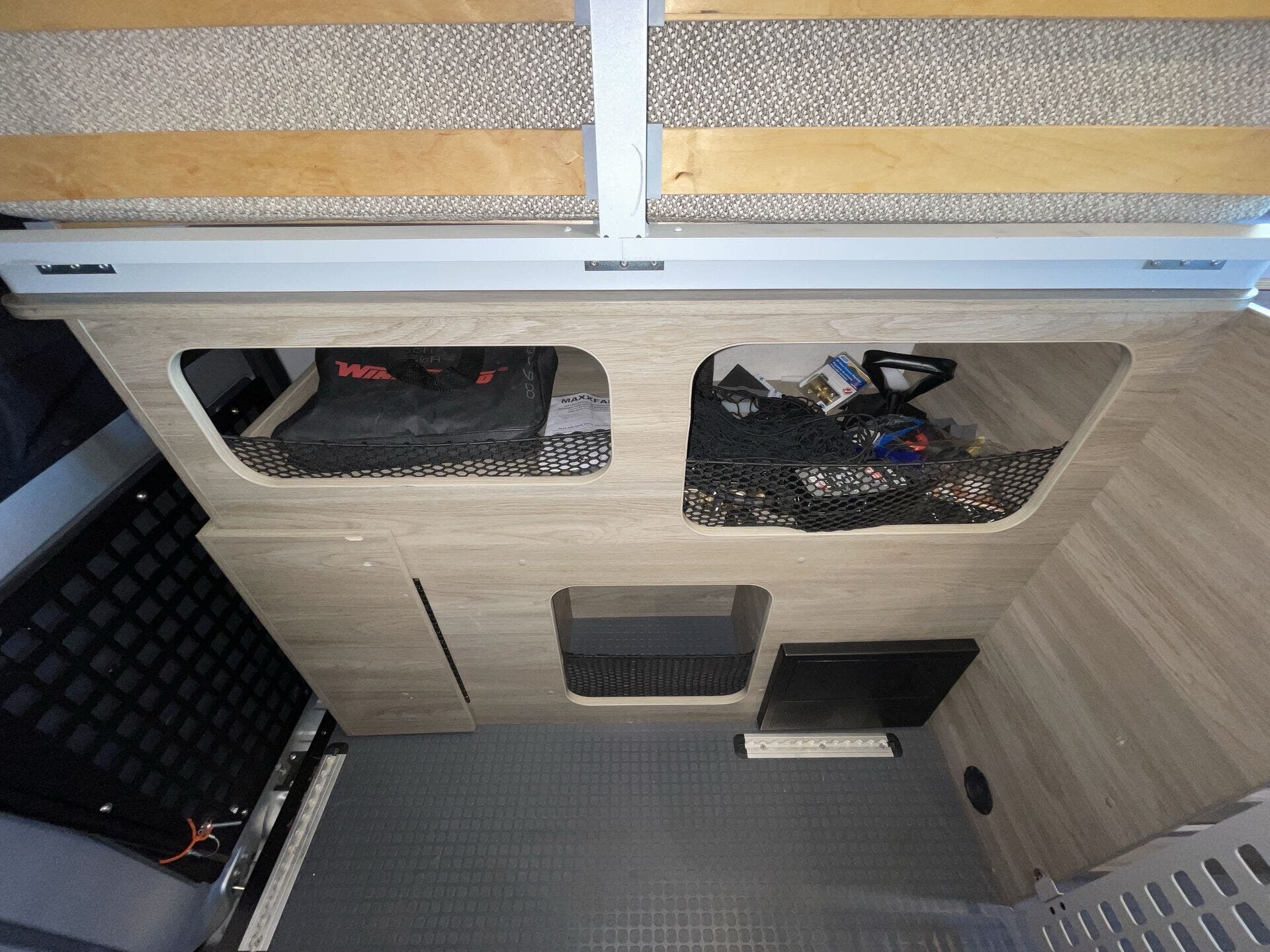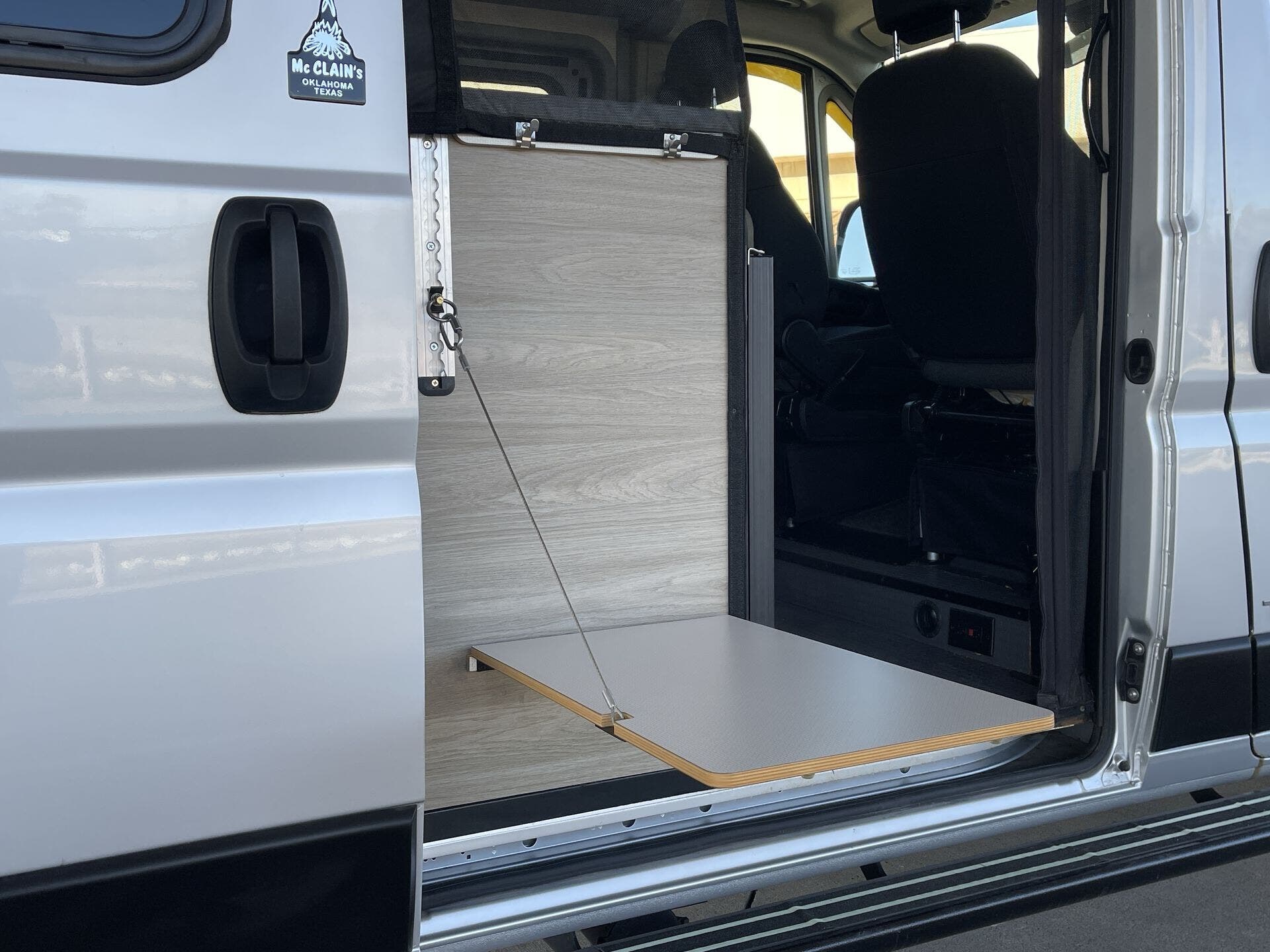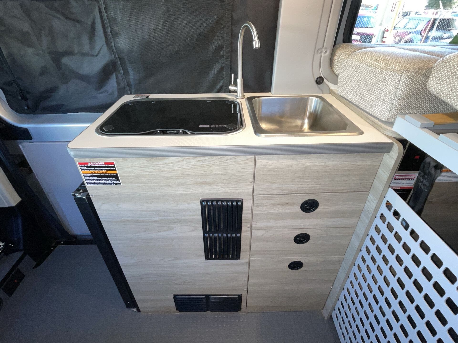The Murphy+ bed in the back is a nice touch too — you get a comfy place to sleep, and all your bikes or gear can live underneath without being in the way. The little kitchen has everything you need, and you can cook inside or outside depending on the vibe.