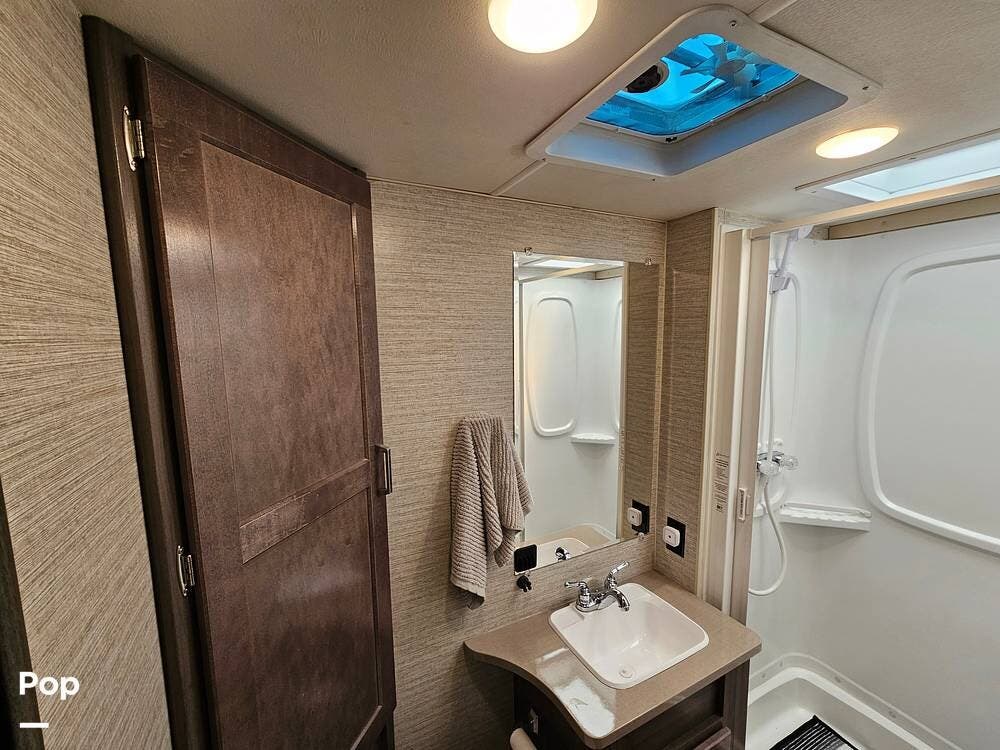 The rear bedroom offers a queen-sized bed with ample storage. The adjacent bathroom includes a 23" x 34" shower, a lavatory cabinet, and a powered roof vent, providing all the amenities needed for extended trips. β