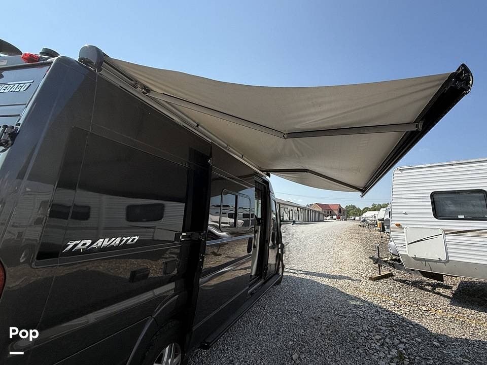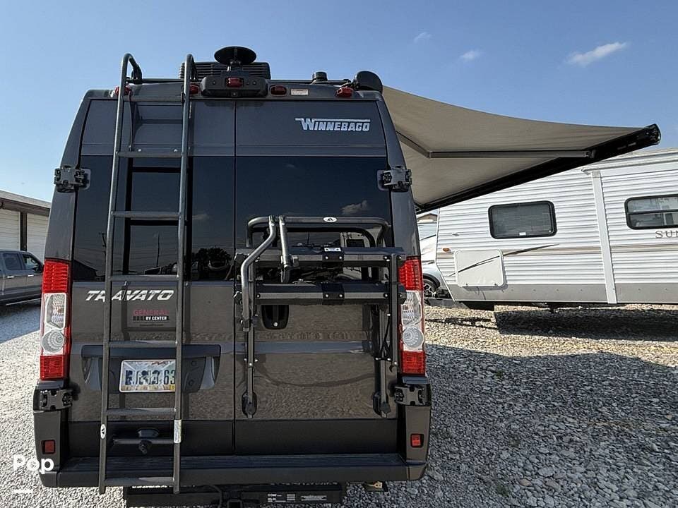 Additional amenities include a roof ladder, rear-mounted bike rack, power awning, side door screen system, and blackout rear window panels, making this Travato a smart choice for travelers seeking comfort, capability, and self-sufficiency in a compact footprint.