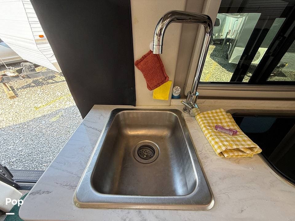 Inside the cab, you'll find a multimedia monitor system for entertainment and navigation, as well as power features and integrated camera systems for added convenience and safety. The coach features a functional galley kitchen with a microwave, propane cooktop, sink, refrigerator/freezer, and a pull-out countertop for added prep space.