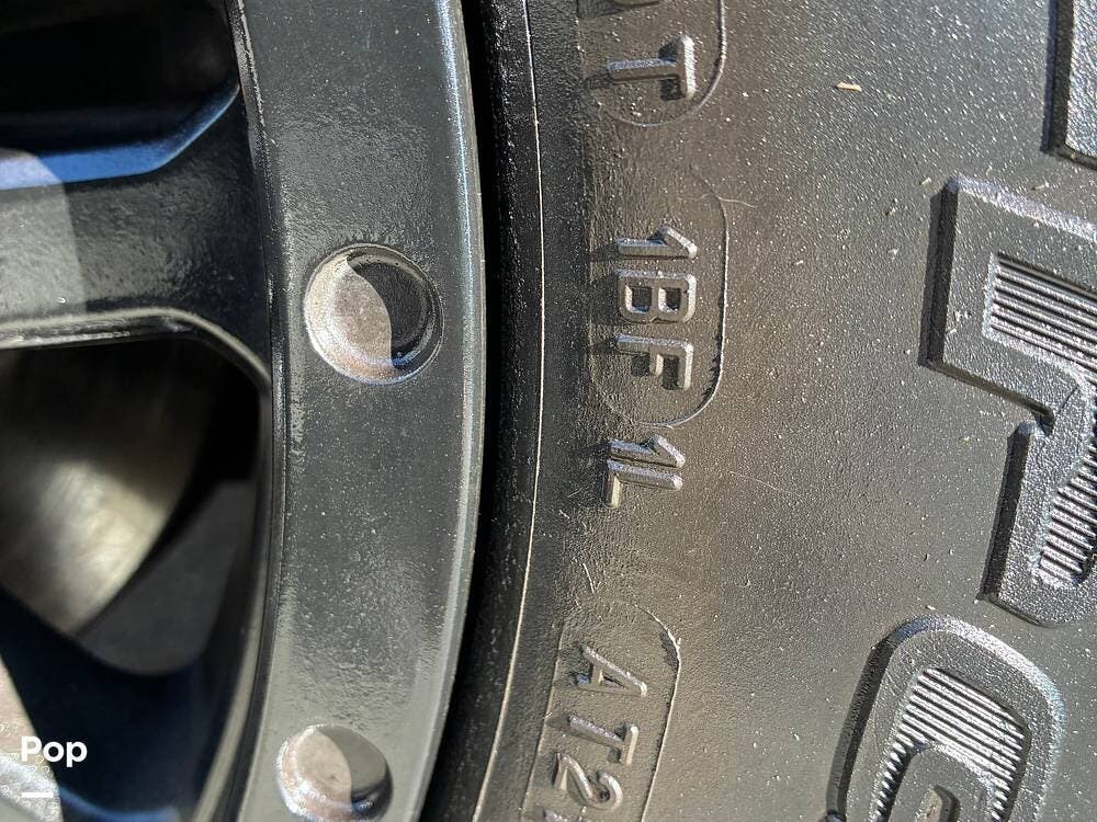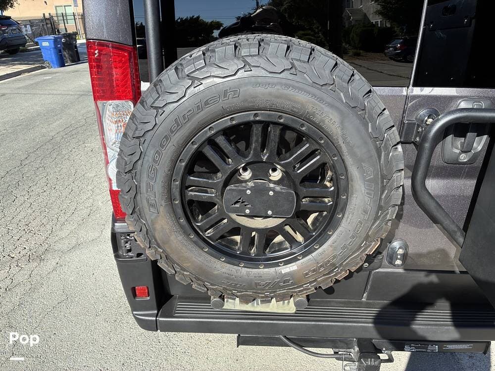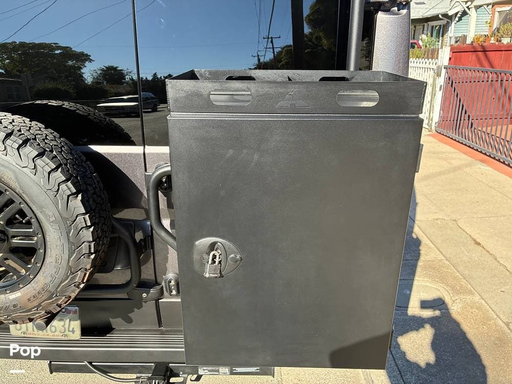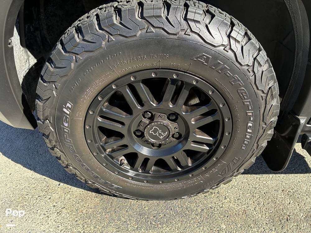 Exterior features include a roof access ladder, luggage rack, and a rear bike rack with a spare tire carrier. The RV rides on BFGoodrich All-Terrain T/A KO2 tires paired with Black Rhino Yellowstone matte black rims, adding durability and off-road confidence. Factory Koni shocks and Summo Springs also enhance the drivability.