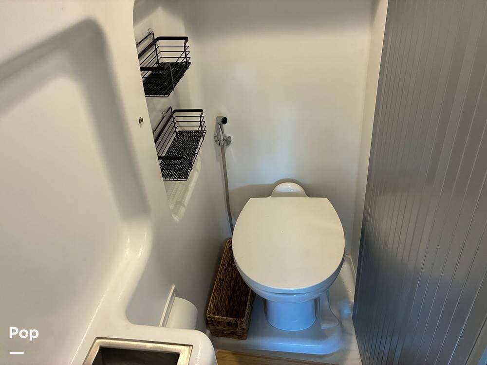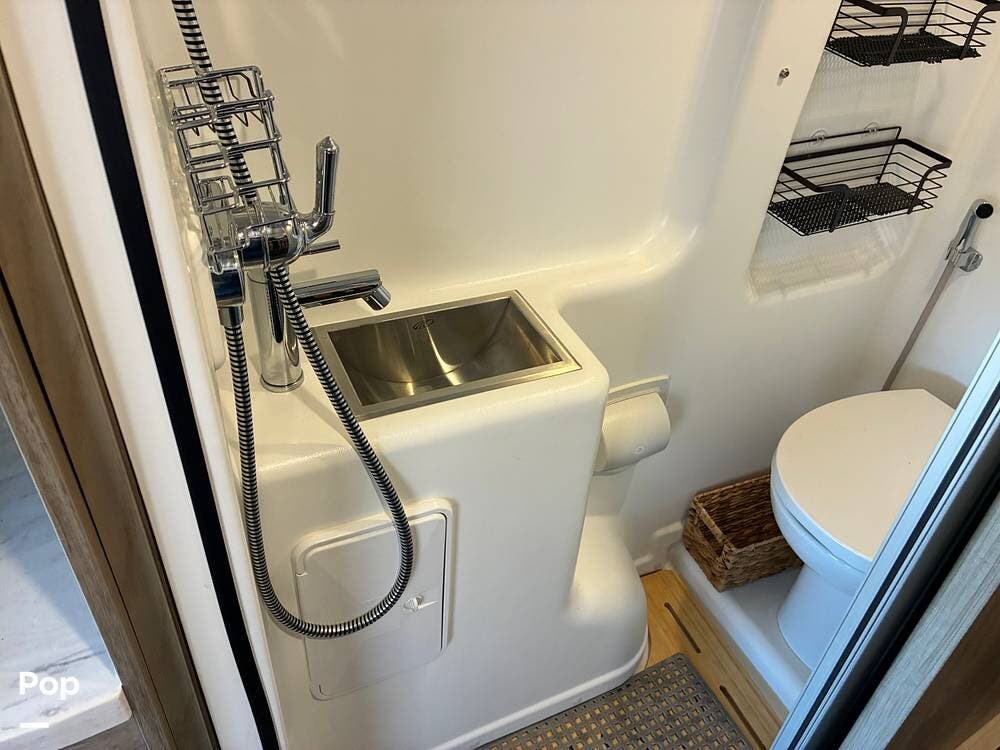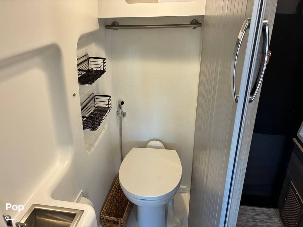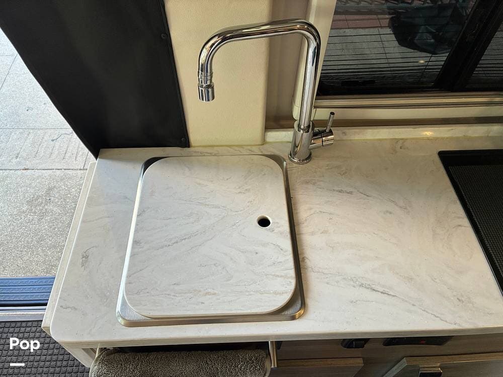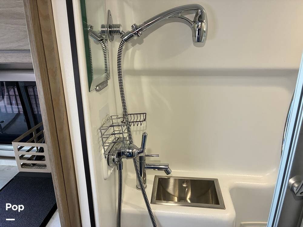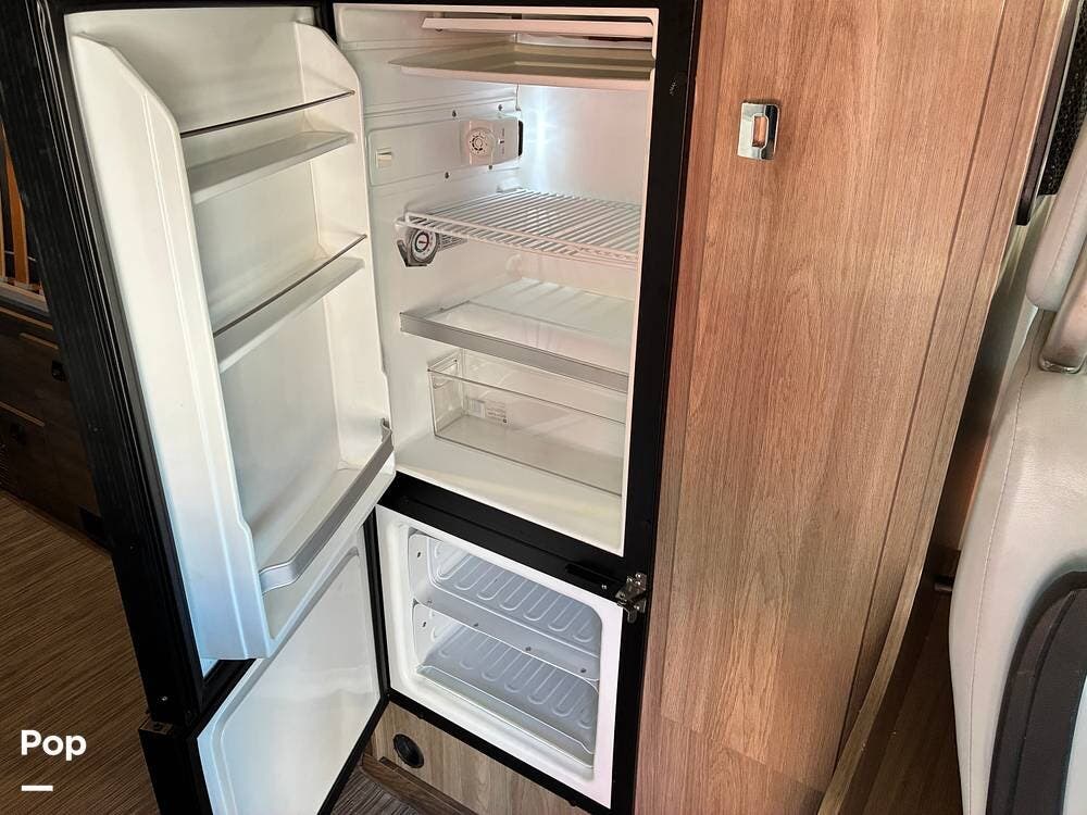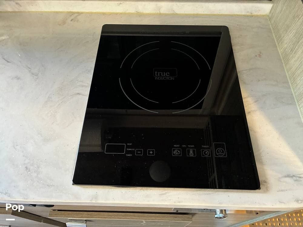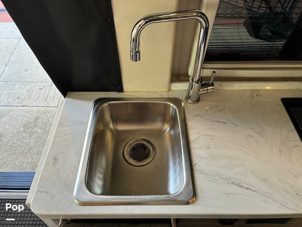 The galley is thoughtfully equipped with a stainless-steel sink, Corian countertop, microwave/convection oven, and a two-burner range top. A compressor-driven refrigerator/freezer ensures reliable cooling whether on the road or off-grid.