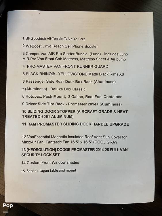 Additional owner-installed upgrades include a WeBoost Drive Reach Cell Phone Booster, Camper Van AIR Pro Starter Bundle (Luno) with air mattress and pump, Pro-Master Front Runner Guard, Aluminess rear door box rack, Rotopax 2-gallon fuel container, Aluminess driver-side tire rack, sliding door stopper, RAM ProMaster sliding door handle upgrade, VanEssential magnetic insulated roof vent sun cover, HEOSolution full van security lock set, custom front window shades, and a second Lagun table and mount.