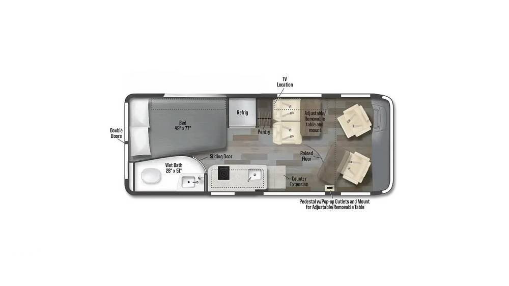 Inside, the cab area includes swivel driver and passenger seats that turn to join the living area, along with a removable pedestal table for dining or workspace use. Overhead storage and LED lighting enhance comfort and utility throughout.