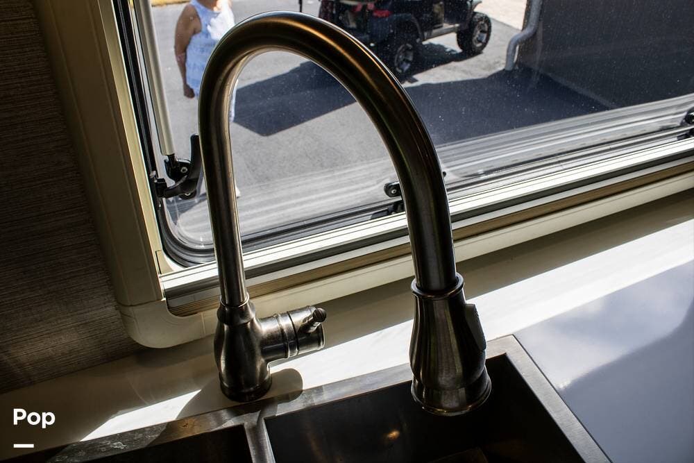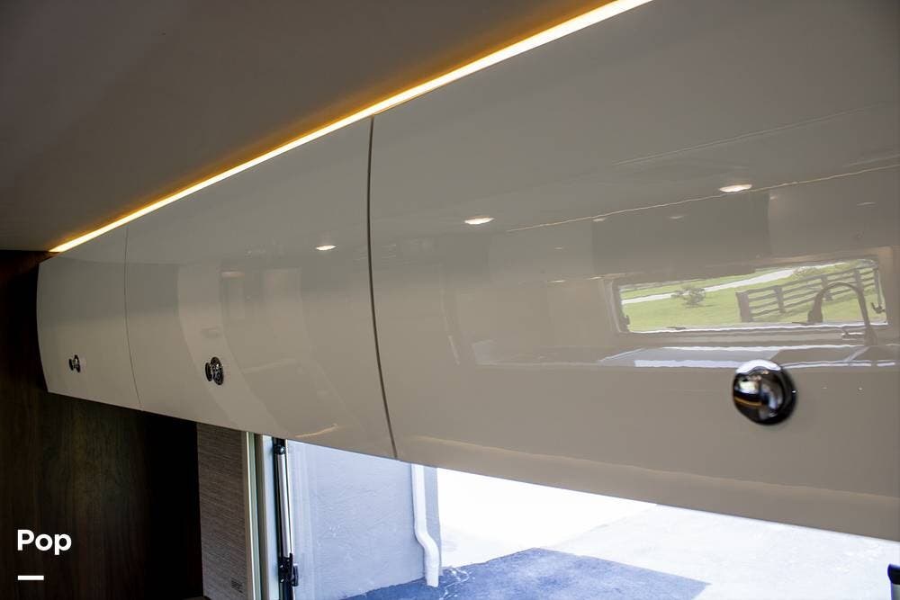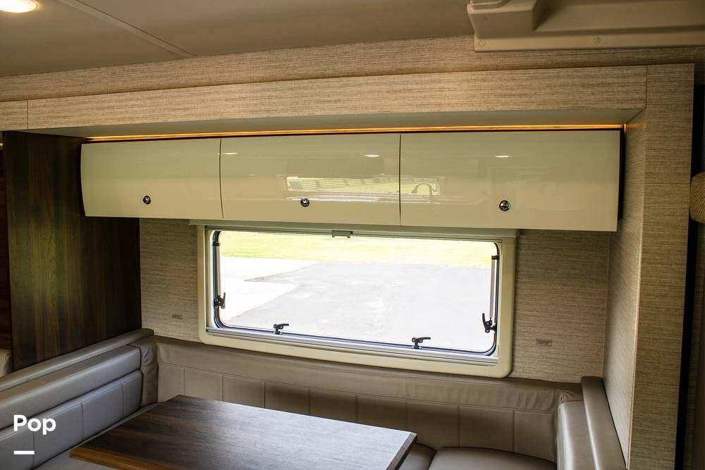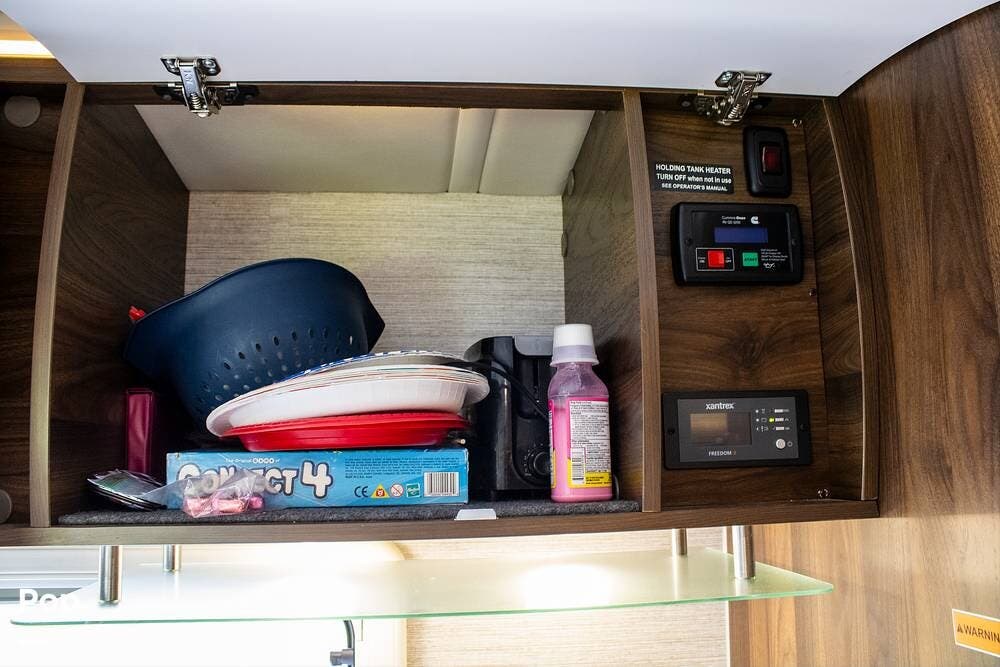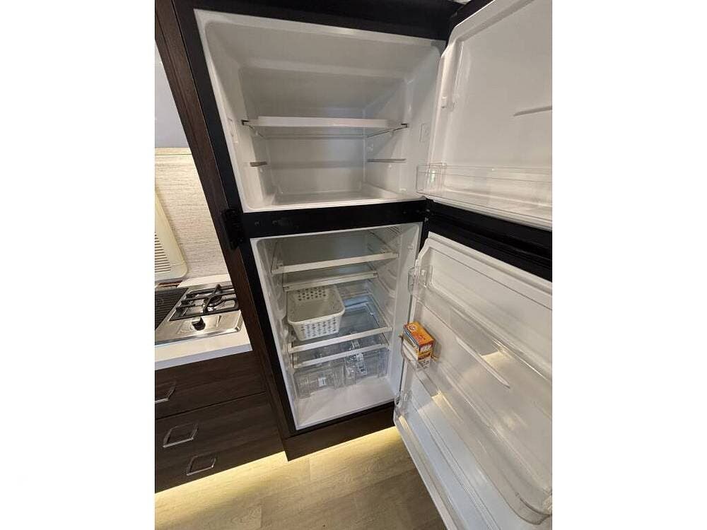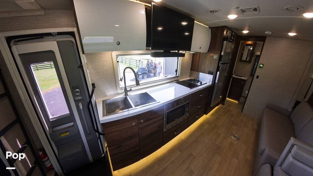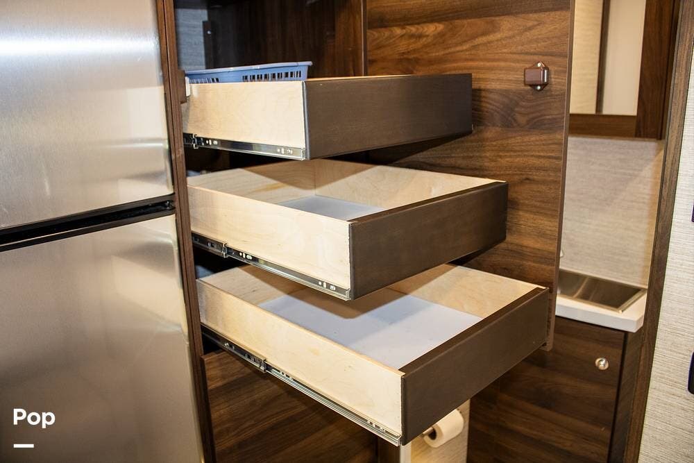 The kitchen is ideal for travelers who love to cook on the road, featuring a convection microwave, induction cooktop, pantry, and ample counter space.