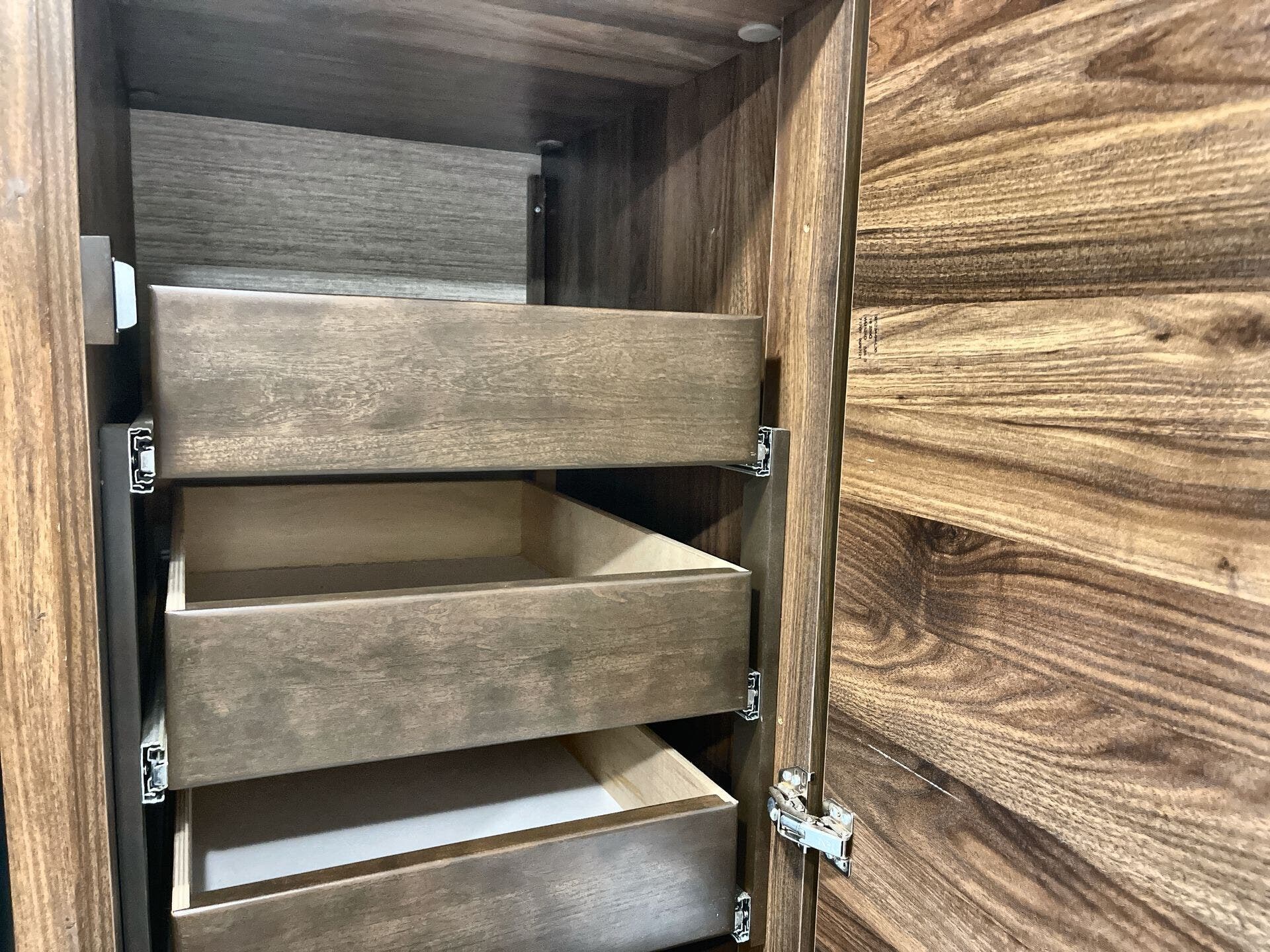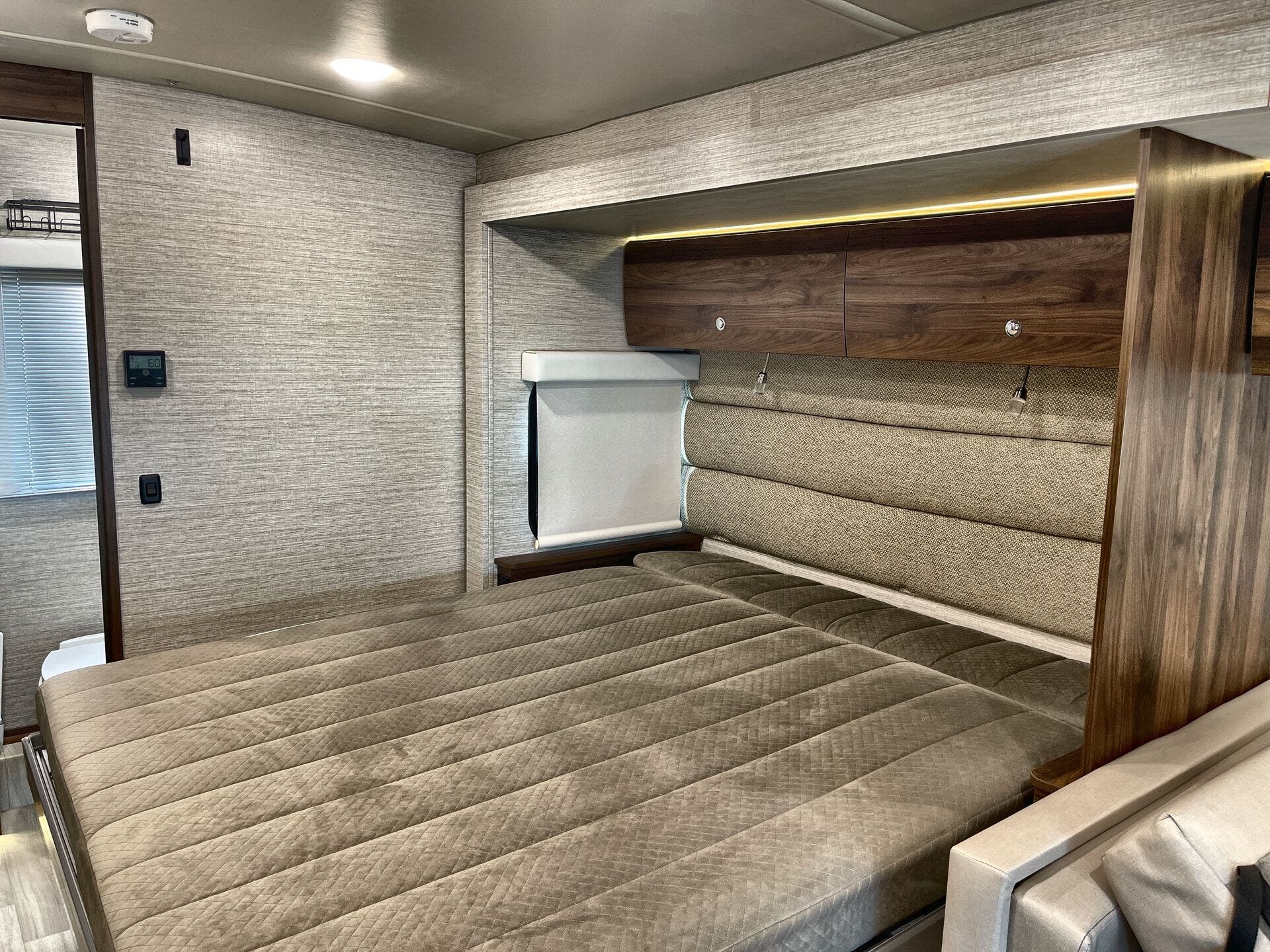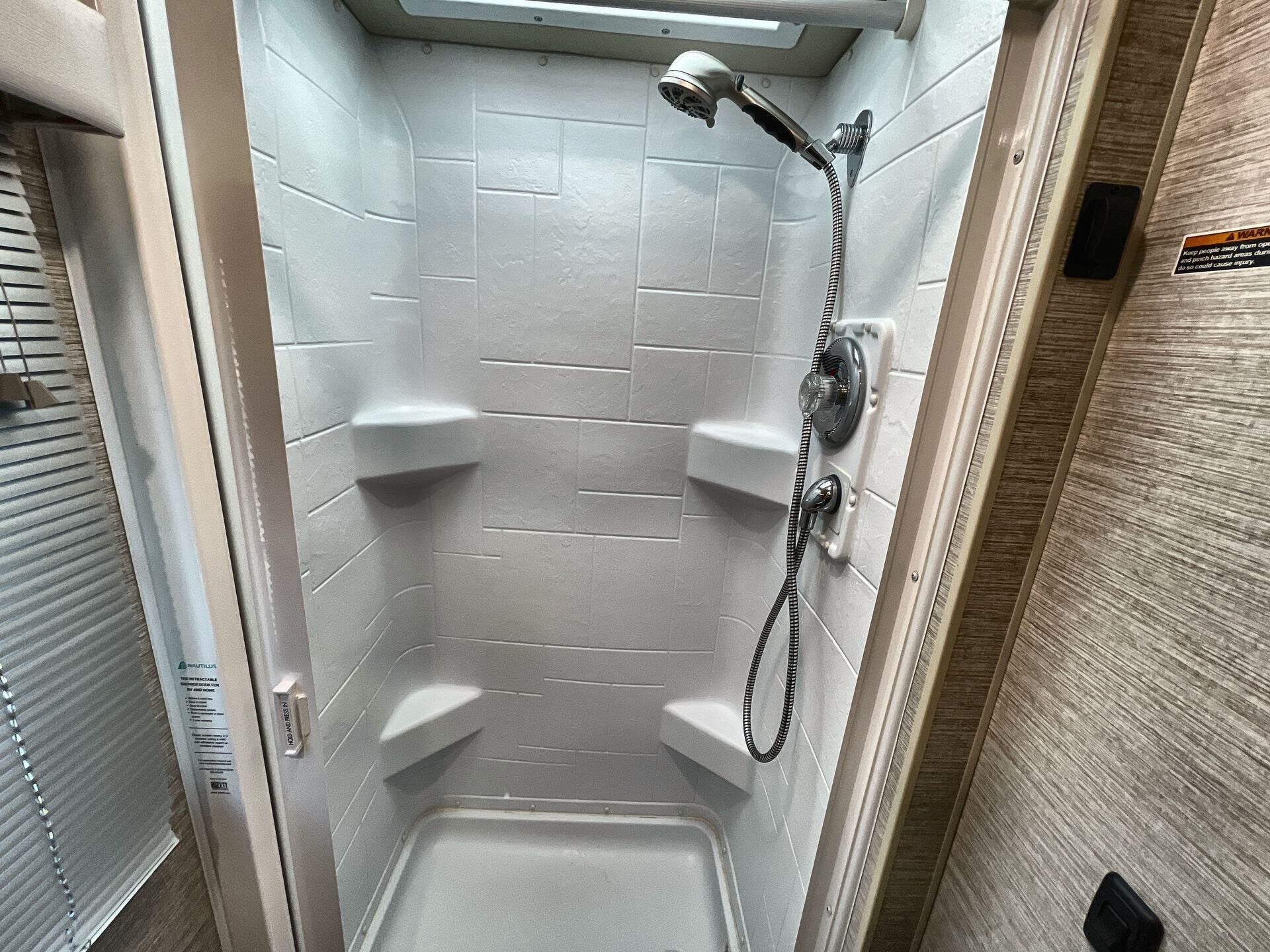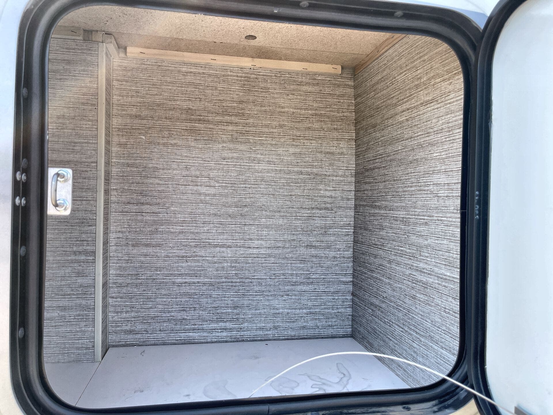 Inside, you’ll find a well-equipped galley with a convection microwave, refrigerator, stove top burner, and water heater, plus modern conveniences like air conditioning and a 15,000 BTU cooling system. Electrical and power options include an auxiliary battery, a converter, and a generator, ensuring you can camp off-grid with confidence. Safety comes first with a CO detector, LP detector, smoke detector, and a fire extinguisher. Entertainment and comfort are enhanced by a TV and well-planned storage, including a medicine cabinet and a full bath with a shower and toilet. Outdoor features like the expanding awning, automatic levelers, a ladder, hitch, screen door, and driver’s door add convenience and ease for setup and departure.