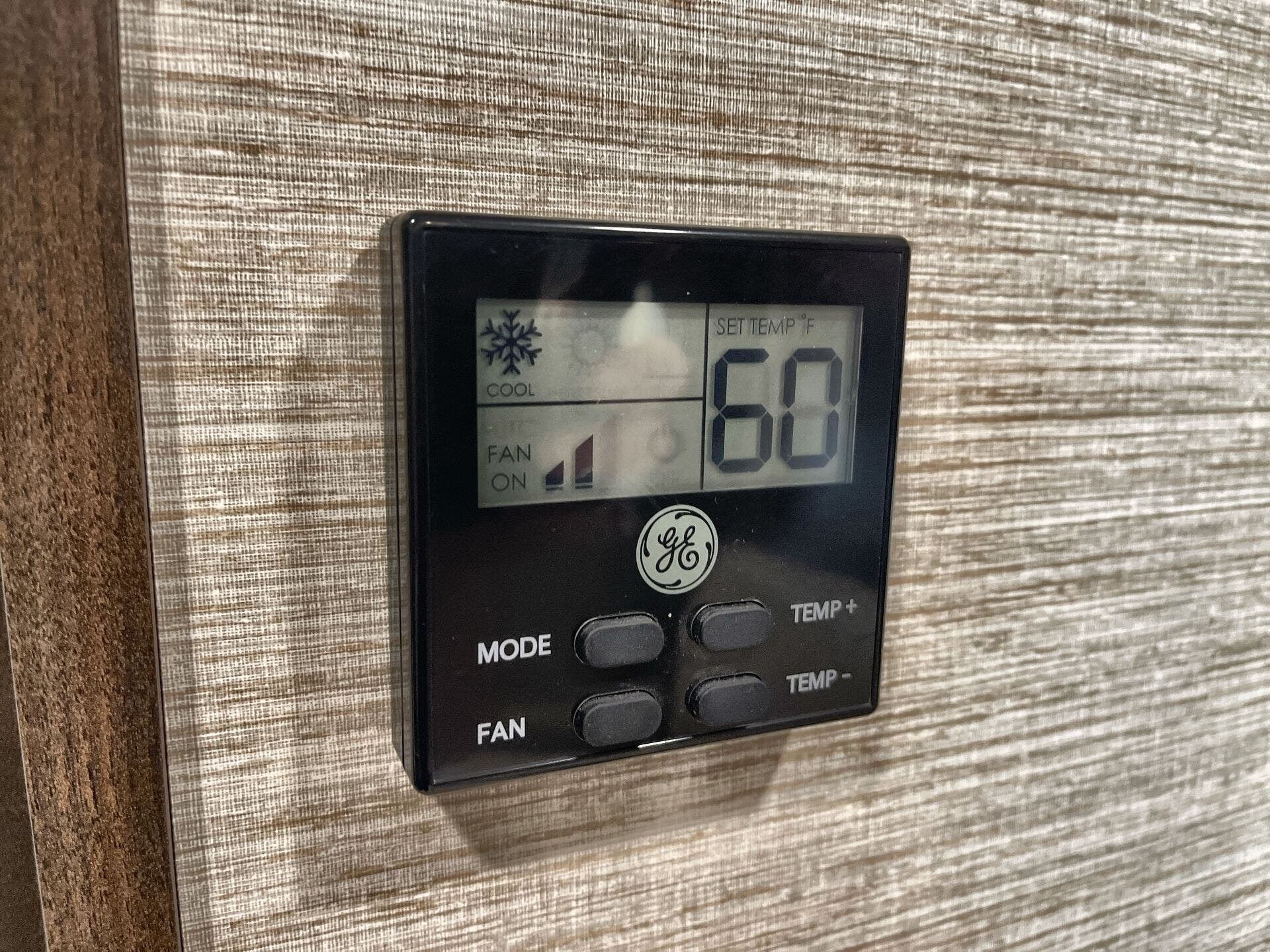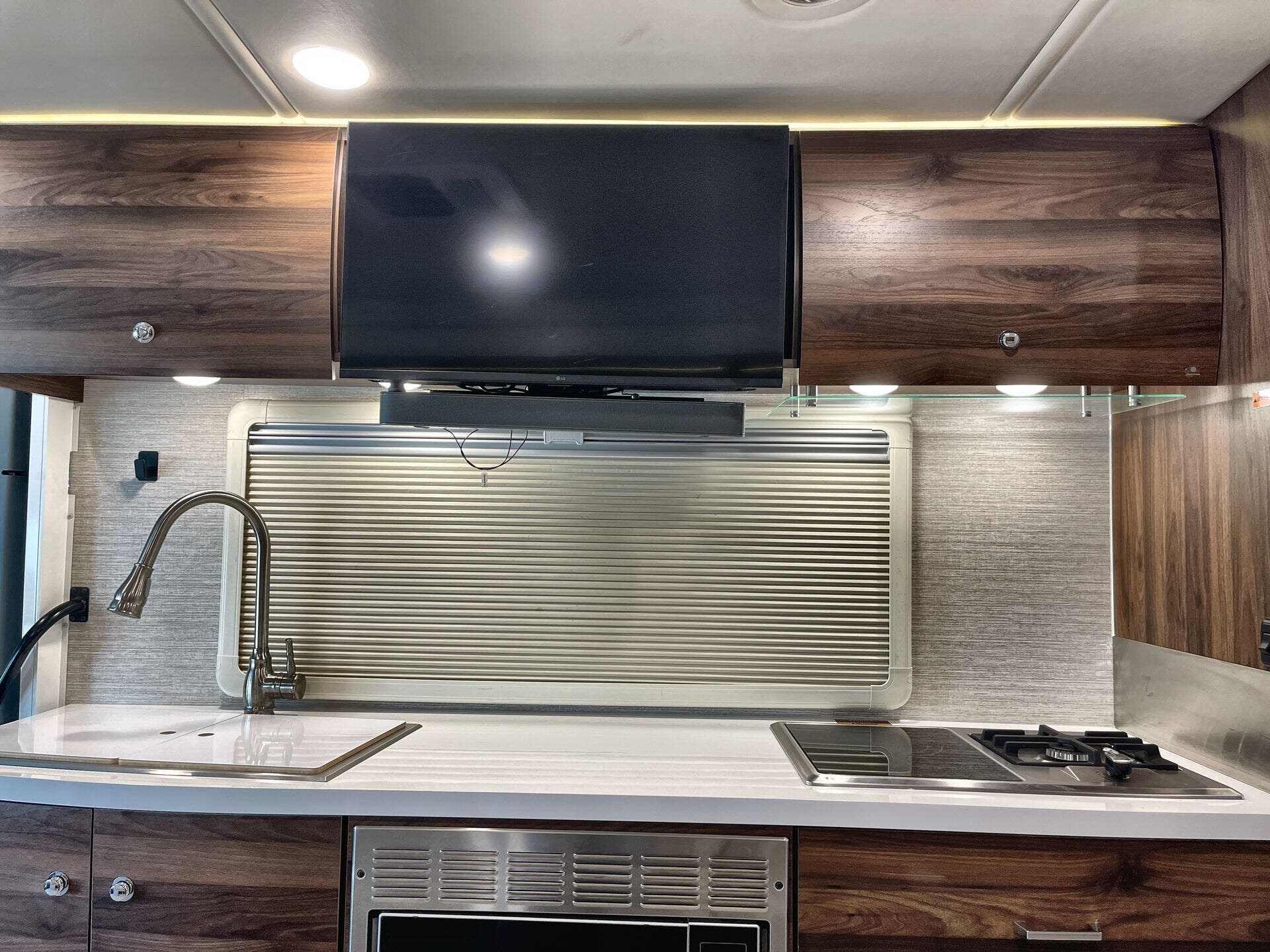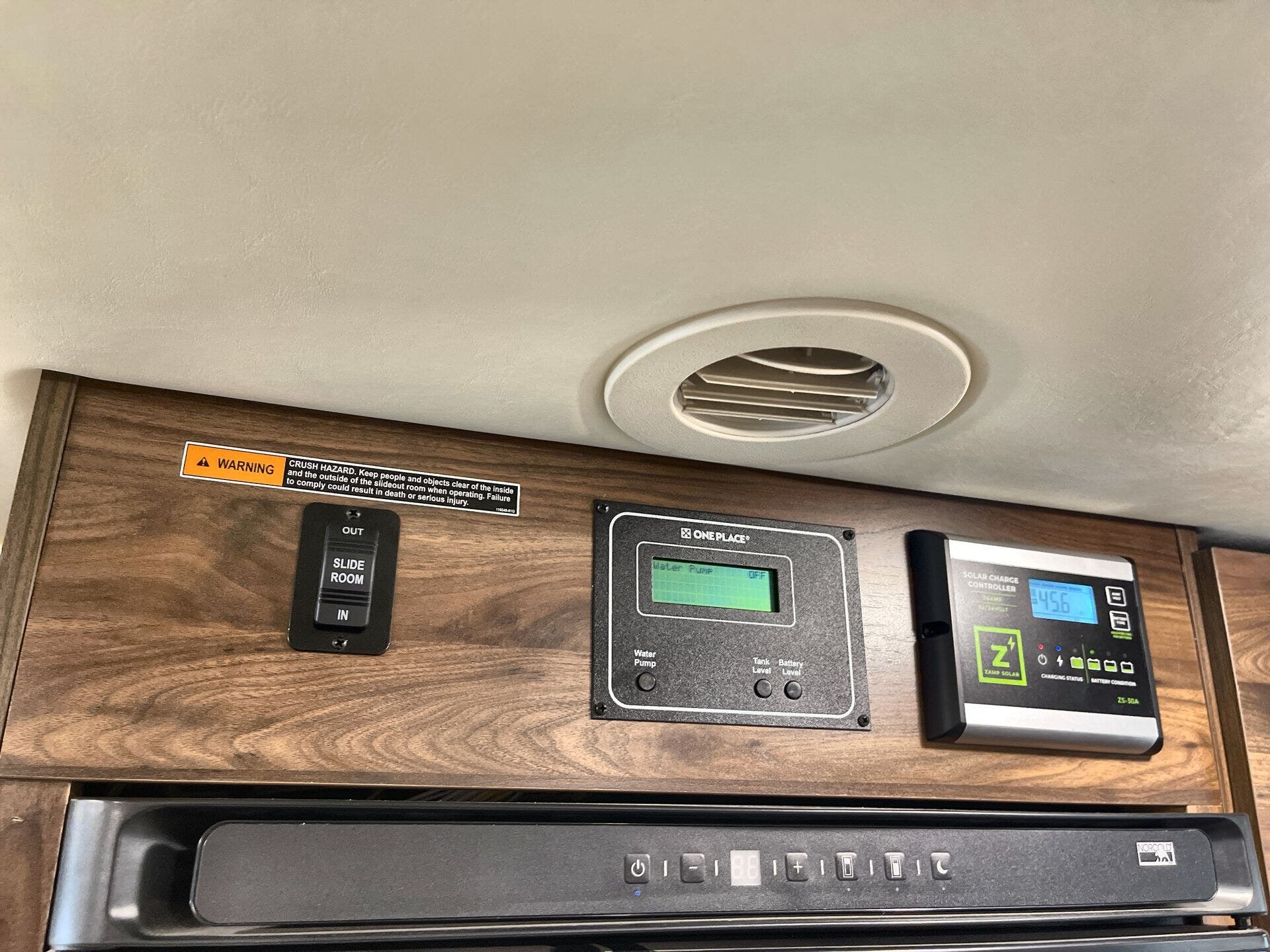 Inside, you’ll find a well-equipped galley with a convection microwave, refrigerator, stove top burner, and water heater, plus modern conveniences like air conditioning and a 15,000 BTU cooling system. Electrical and power options include an auxiliary battery, a converter, and a generator, ensuring you can camp off-grid with confidence. Safety comes first with a CO detector, LP detector, smoke detector, and a fire extinguisher. Entertainment and comfort are enhanced by a TV and well-planned storage, including a medicine cabinet and a full bath with a shower and toilet. Outdoor features like the expanding awning, automatic levelers, a ladder, hitch, screen door, and driver’s door add convenience and ease for setup and departure.