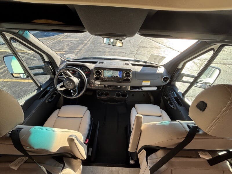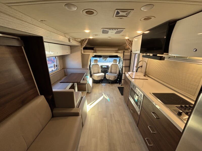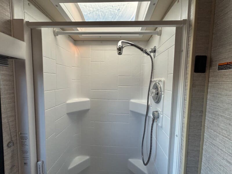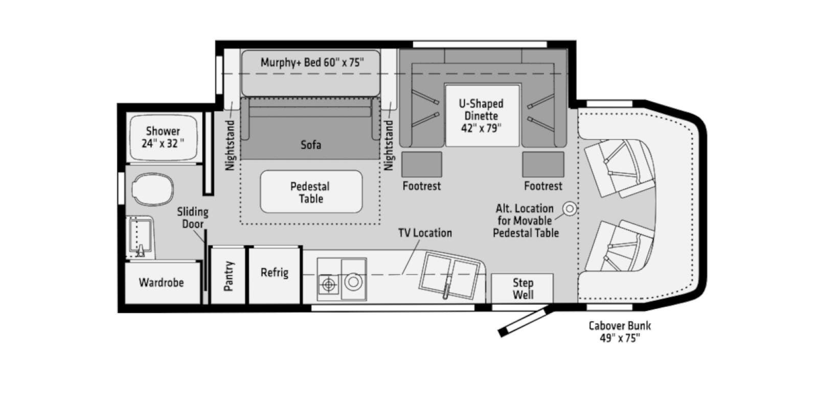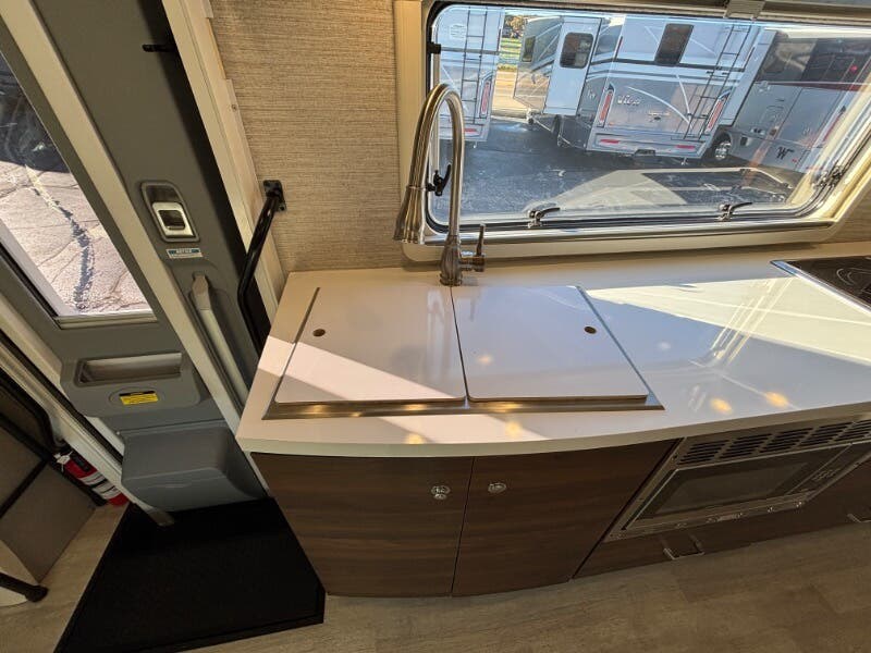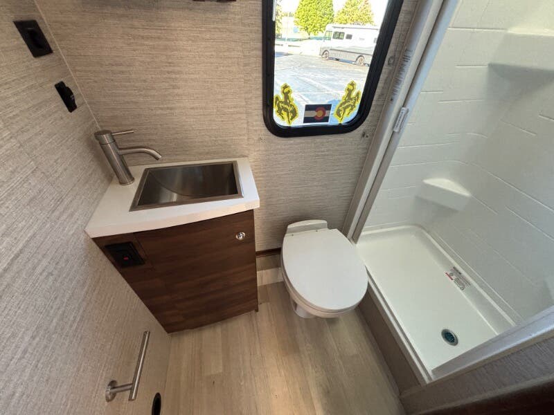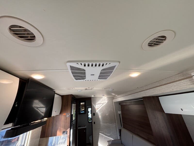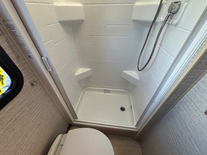 Features Include: 188 HP, 220-Amp Alternator, 3-Point Seat Belts, Color Touch Screen, Handheld Remote, Color Rear Camera, Power Windows, Power Mirrors, LED Headlights, Lane Keeping Assist, Running Board, Stepwell Light, Vinyl Flooring, Soft Vinyl Ceiling, Tinted Coach Windows, Galley Mini Blinds, Laminate Countertops, Stainless Steel Sink, USB Charger, Cable TV Input, LED HDTV, Privacy Curtain, Medicine Cabinet, Flexible Shower Head, Foot Pedal Toilet, 30-Amp Service Cord, 45-Amp 12v Converter, 15k AC, Lockable Water Fill, Fiberglass Roof