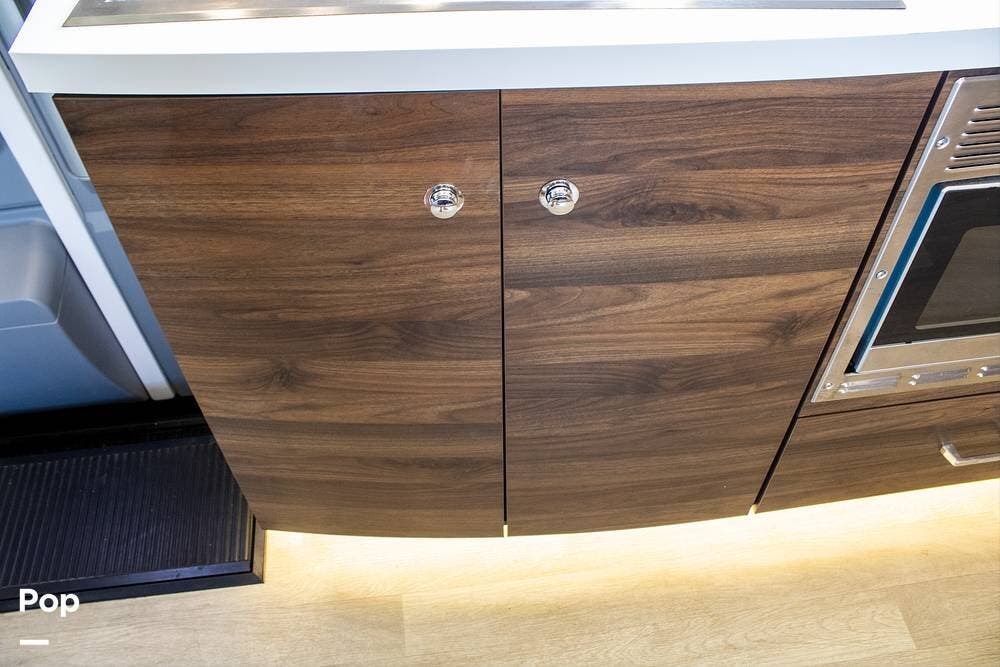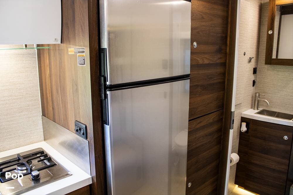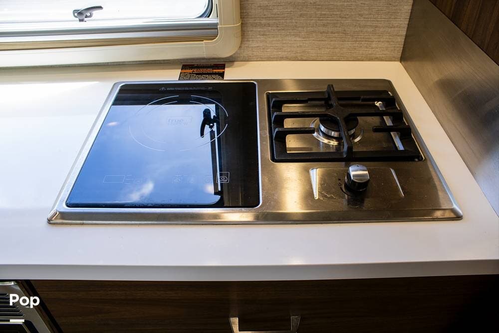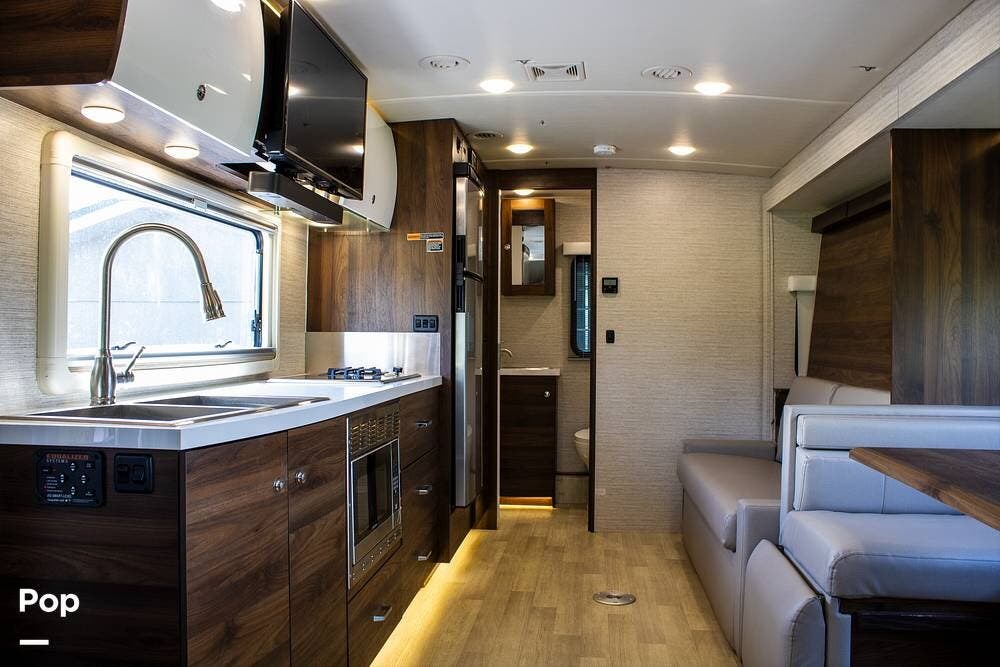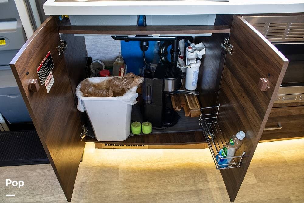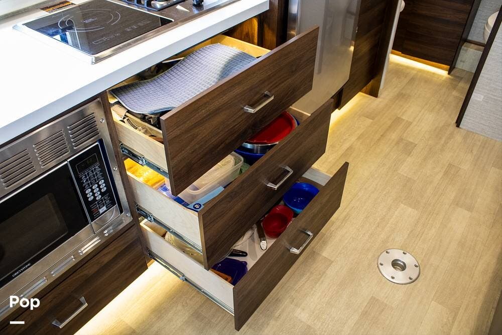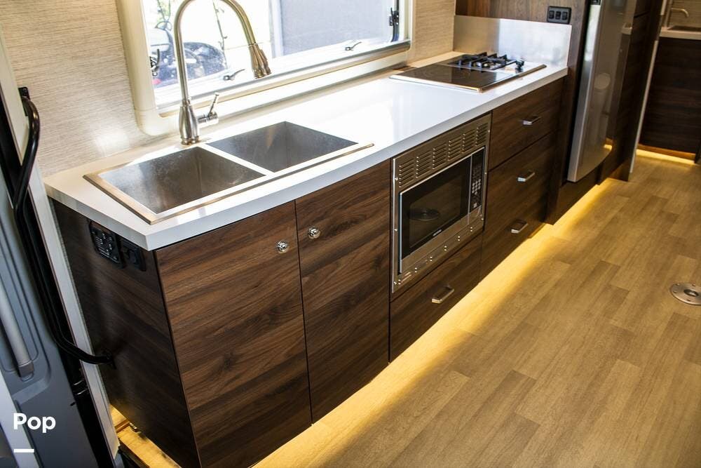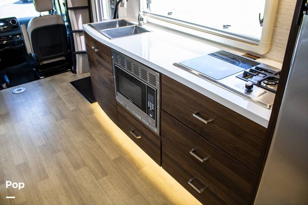 The kitchen is ideal for travelers who love to cook on the road, featuring a convection microwave, induction cooktop, pantry, and ample counter space.