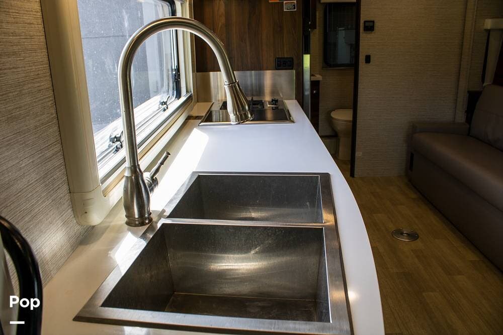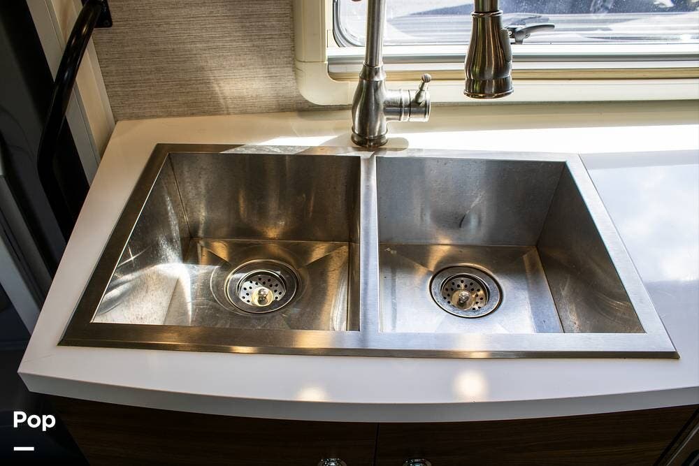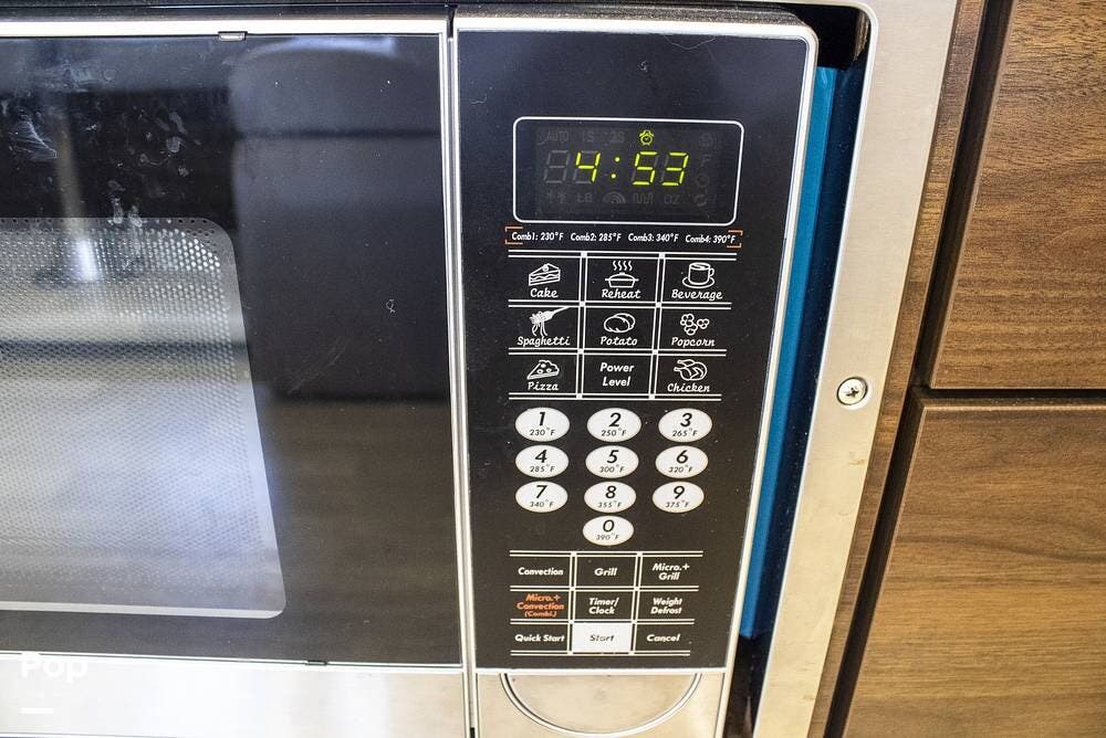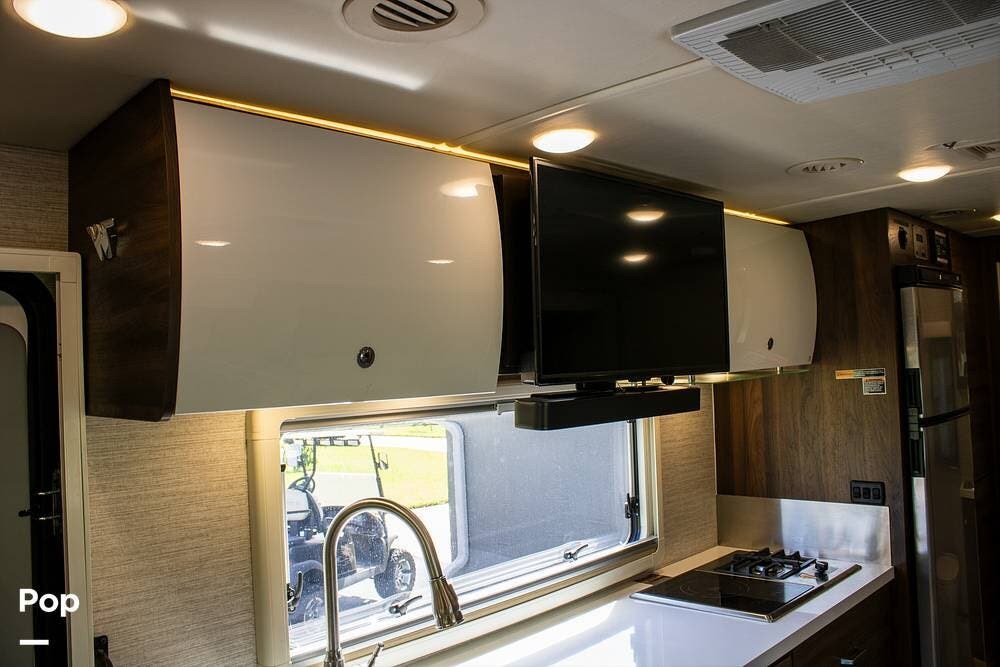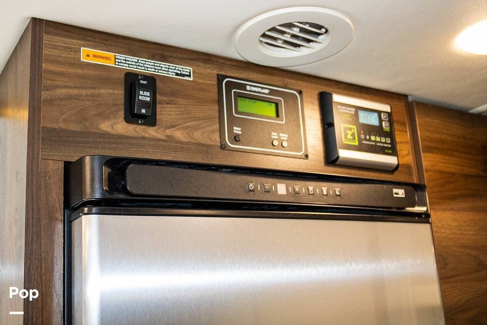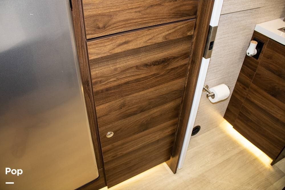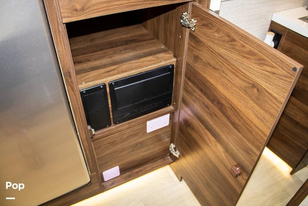 The kitchen is ideal for travelers who love to cook on the road, featuring a convection microwave, induction cooktop, pantry, and ample counter space.