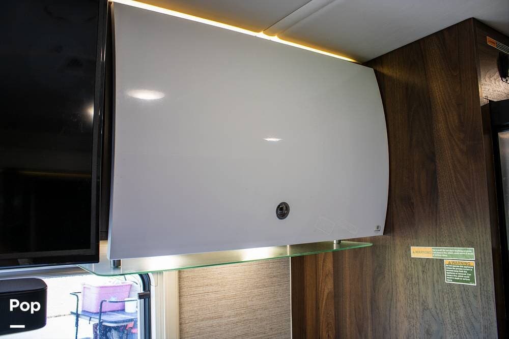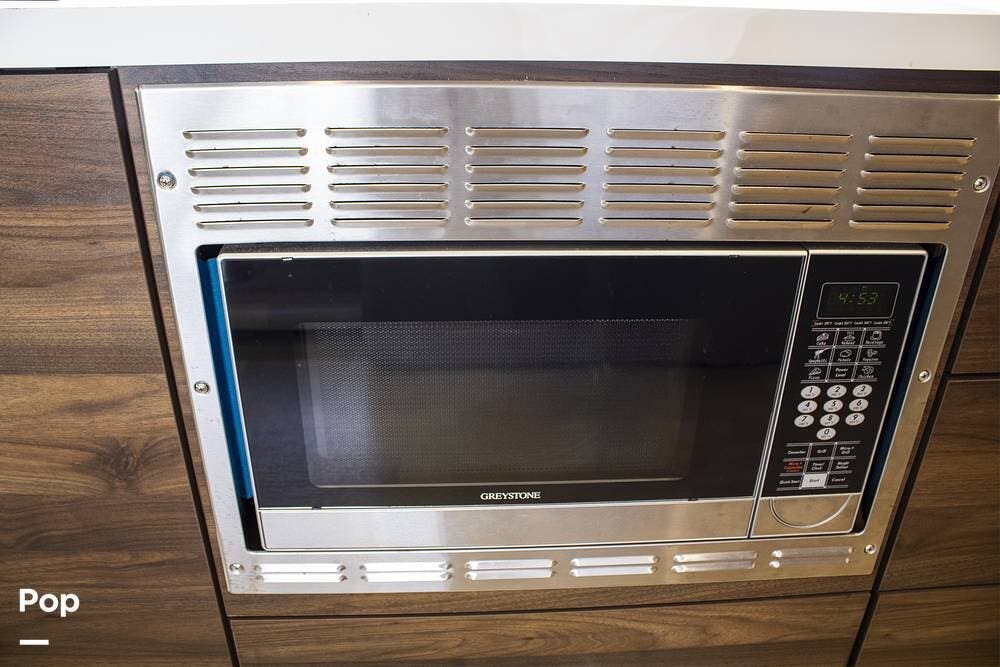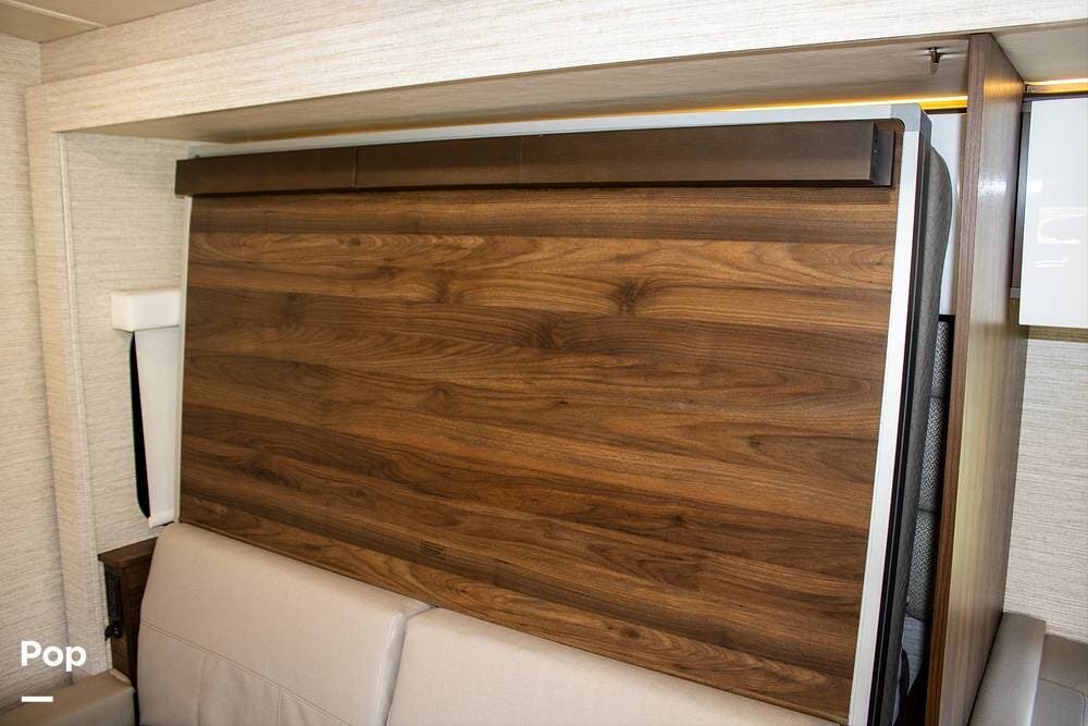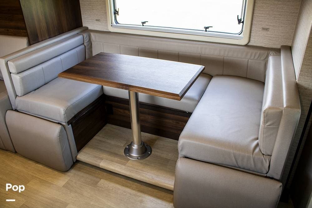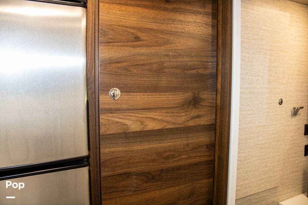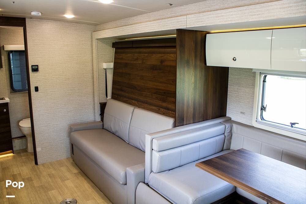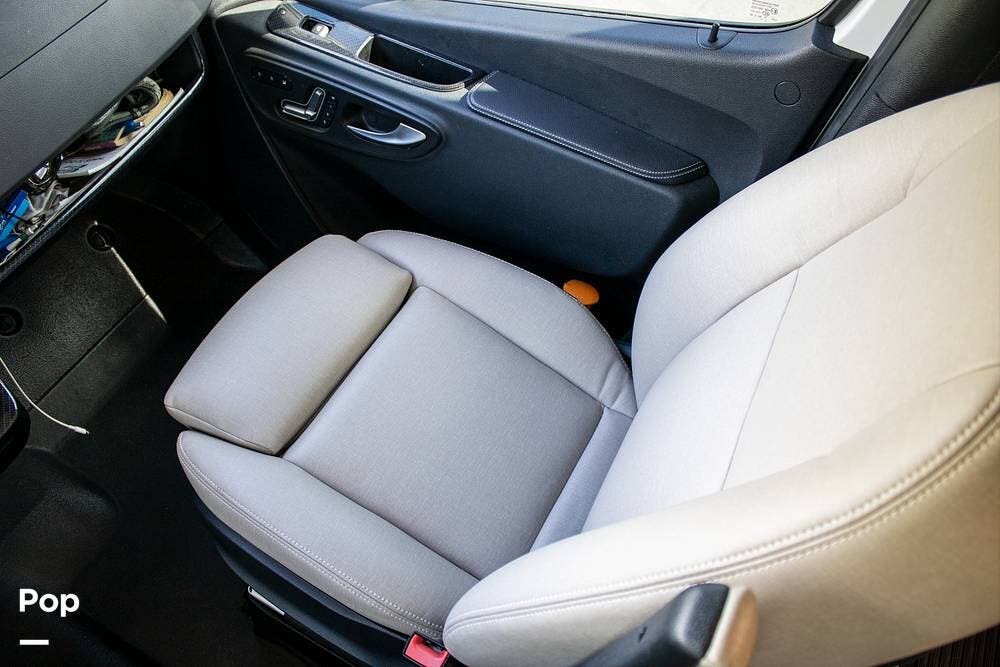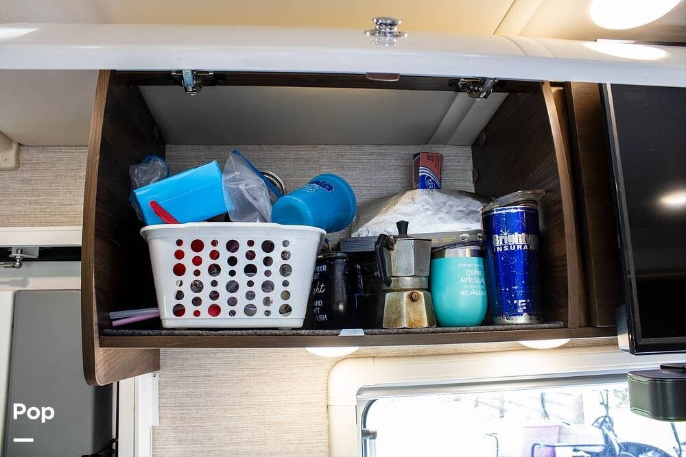 The kitchen is ideal for travelers who love to cook on the road, featuring a convection microwave, induction cooktop, pantry, and ample counter space.