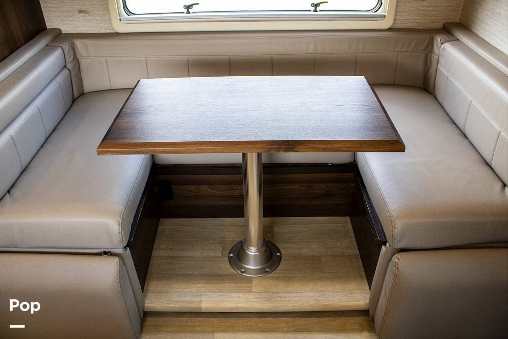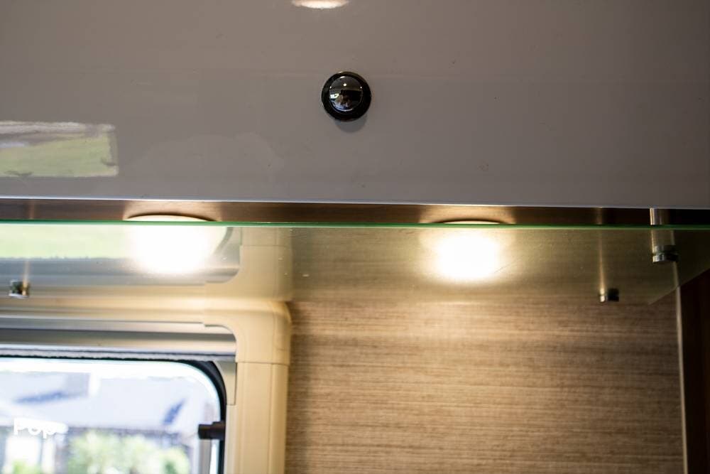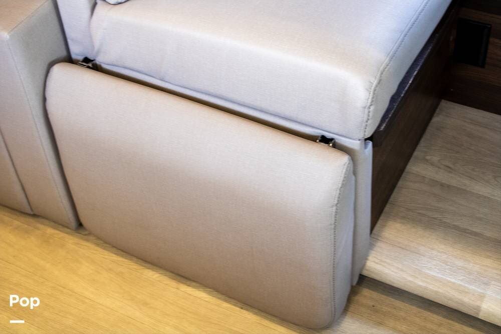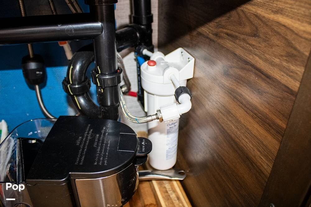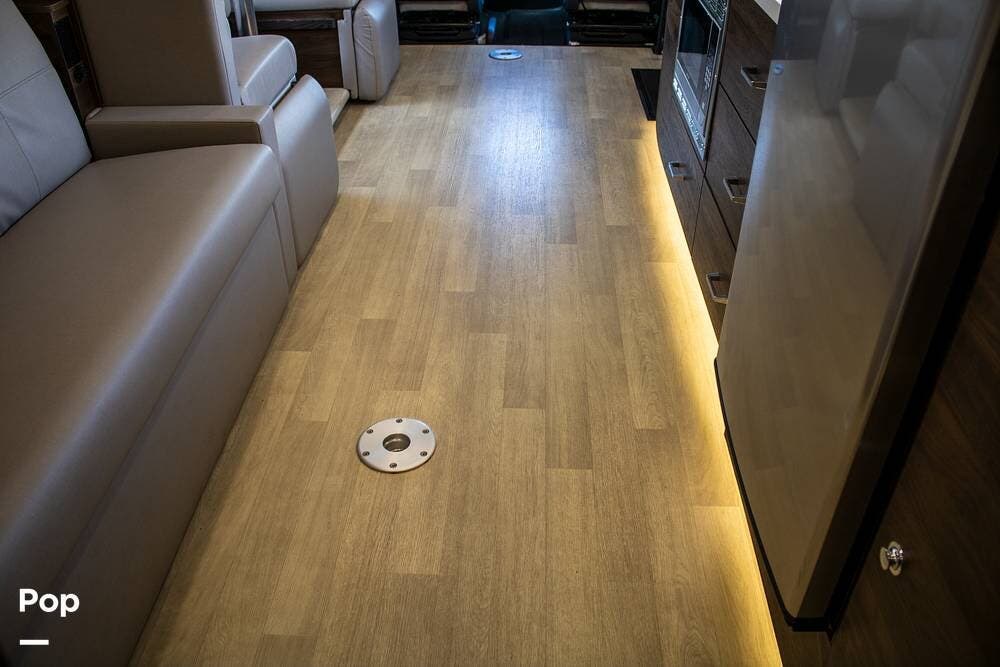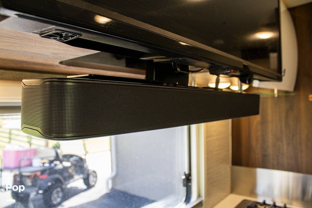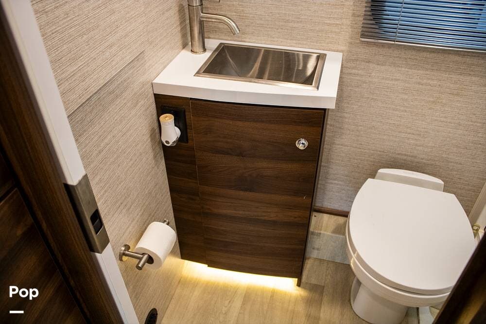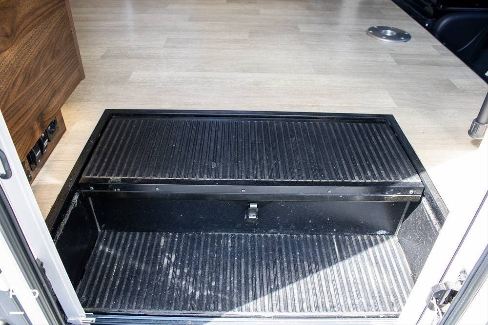 The kitchen is ideal for travelers who love to cook on the road, featuring a convection microwave, induction cooktop, pantry, and ample counter space.
