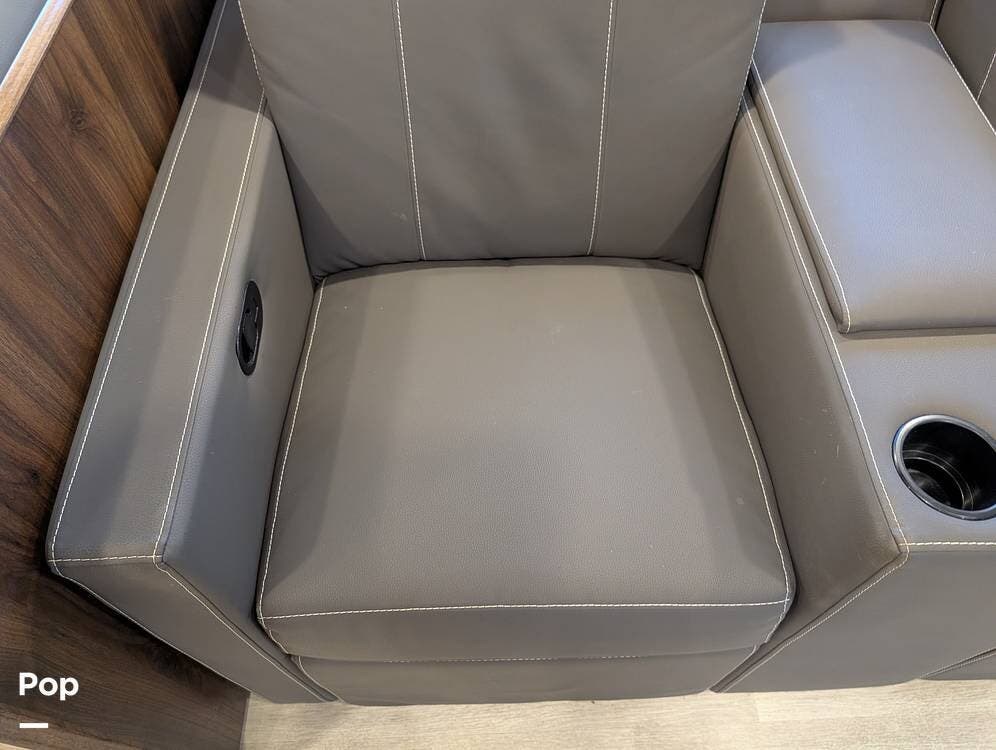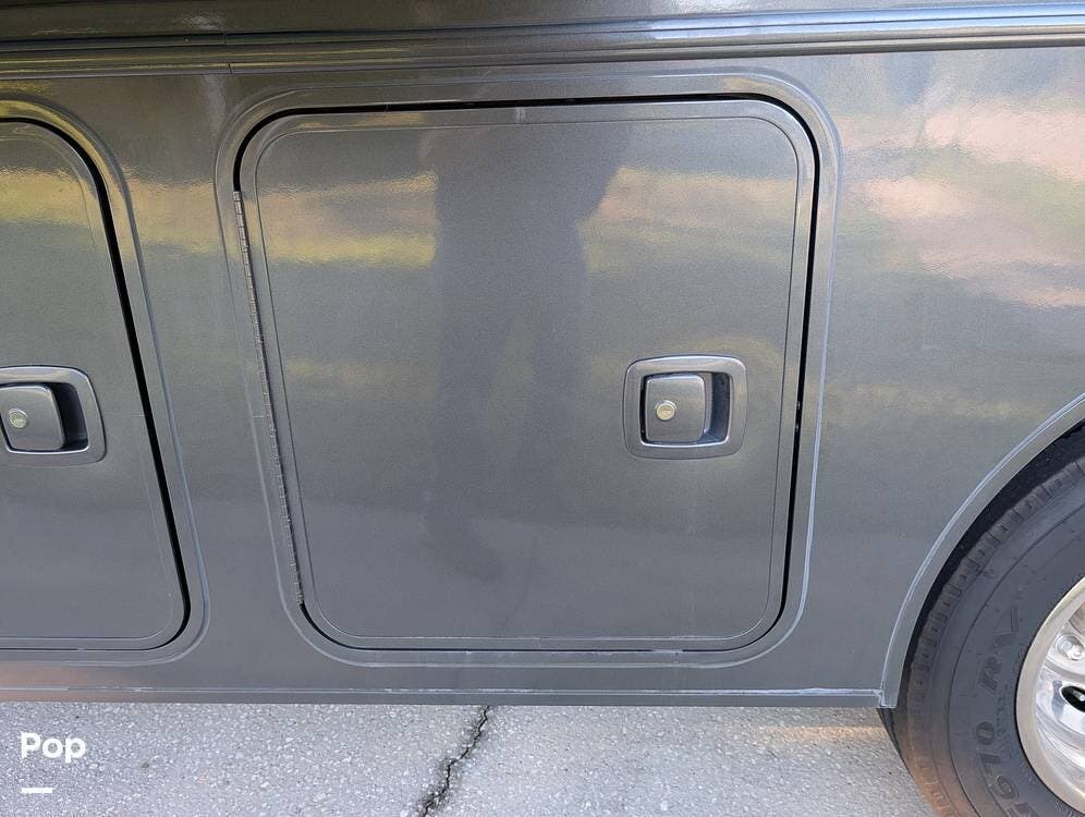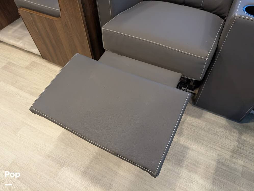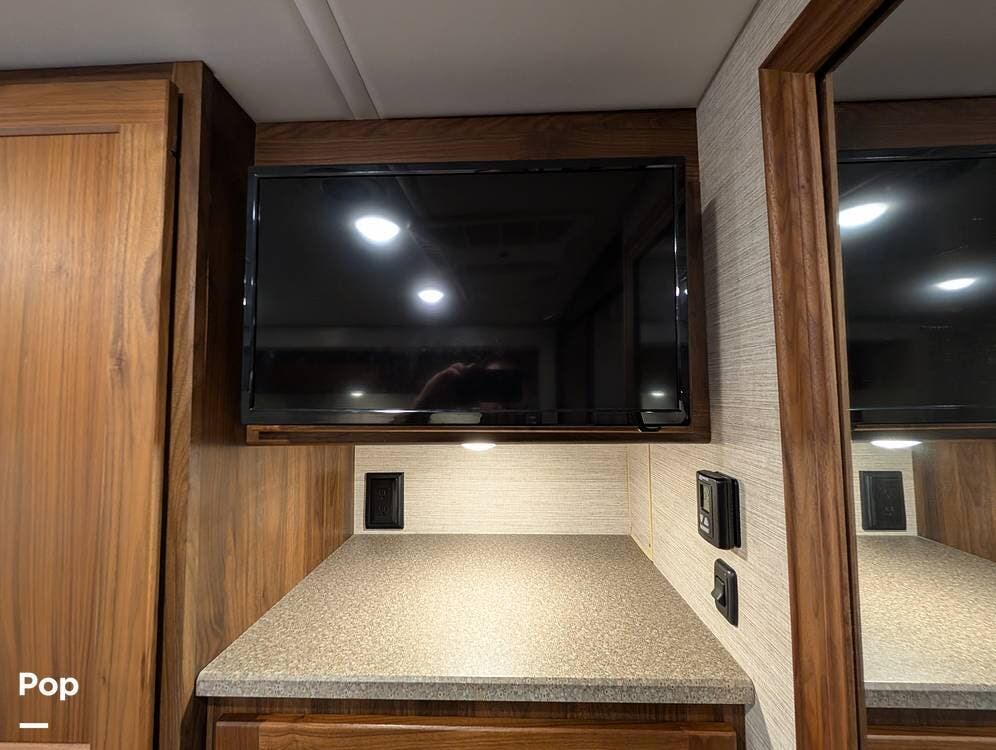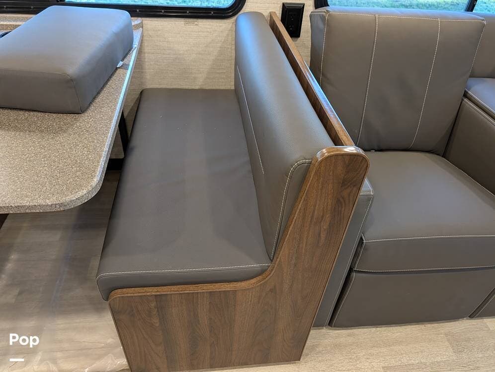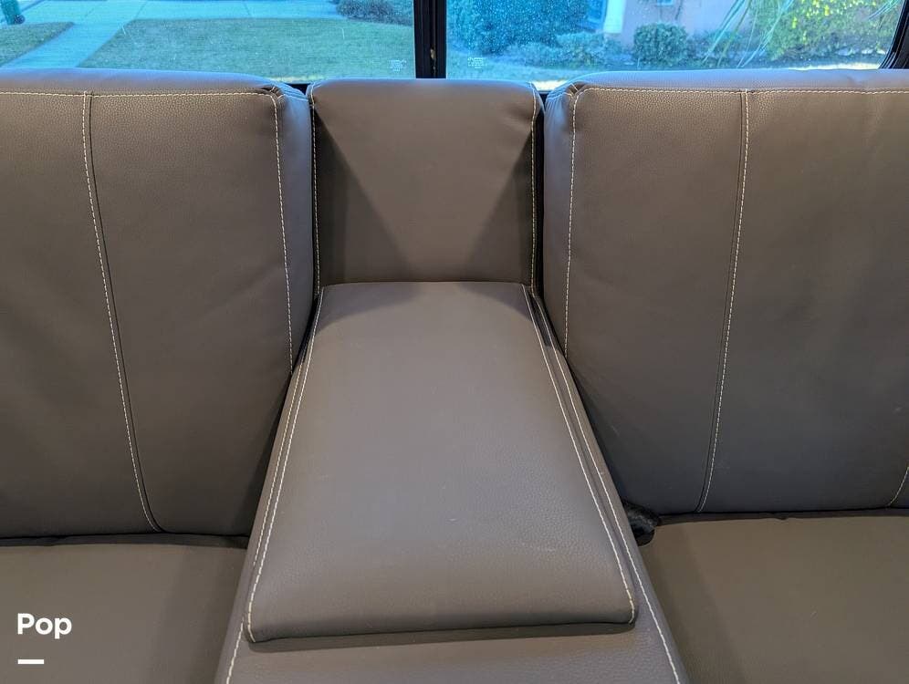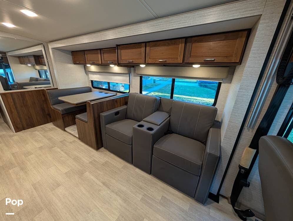 The exterior features partial full-body paint, a power awning, hydraulic leveling jacks, an exterior entertainment center, and ample basement storage for all your gear. Inside, the coach offers a comfortable, thoughtfully designed living space with swiveling captain's chairs, a power-retractable bunk above the cockpit, a reclining theater sofa, a convertible booth dinette, and a huge main TV, comfortably sleeping up to six people.
