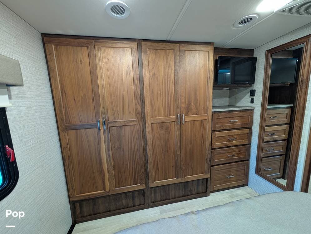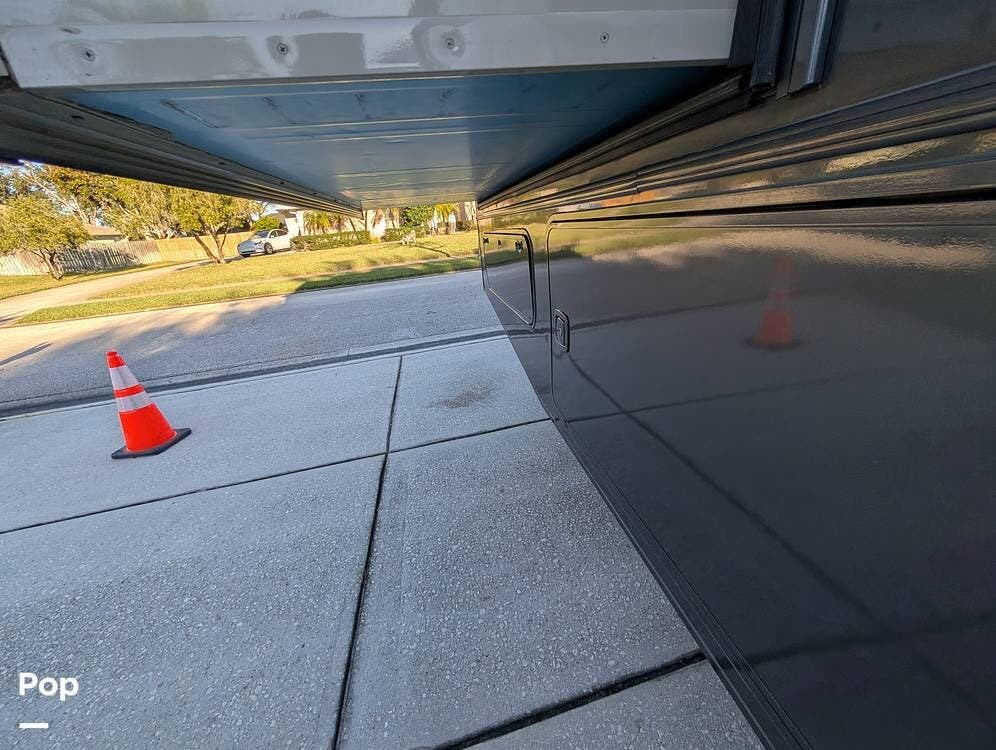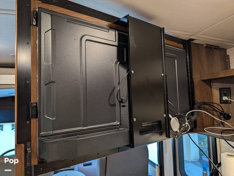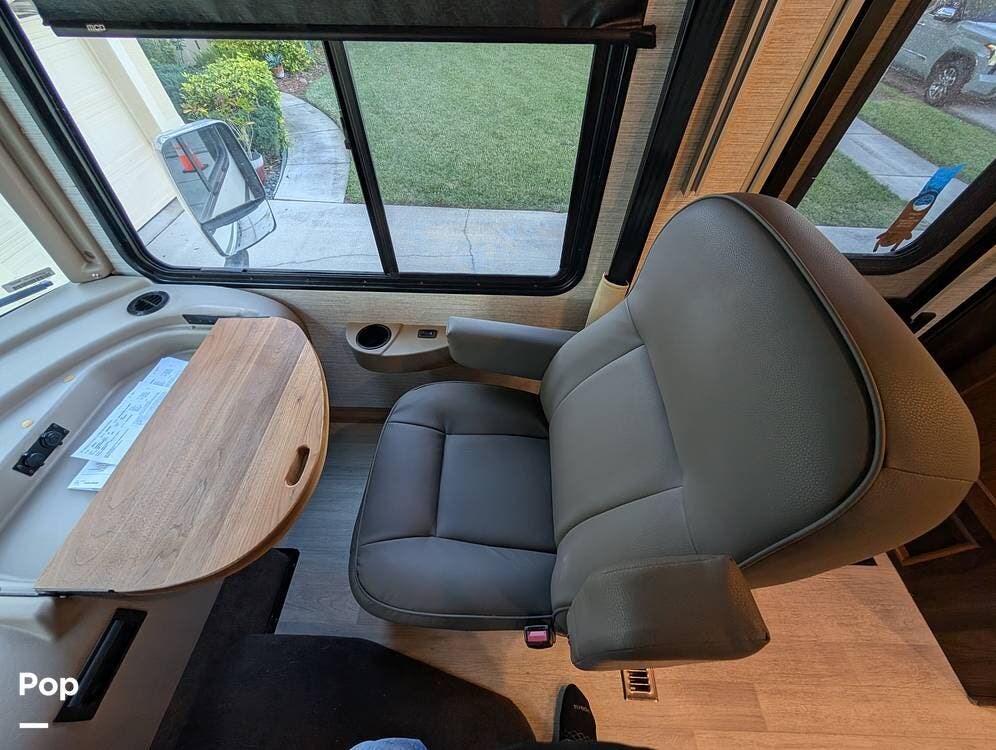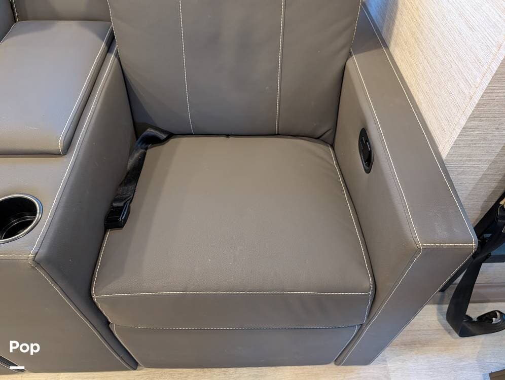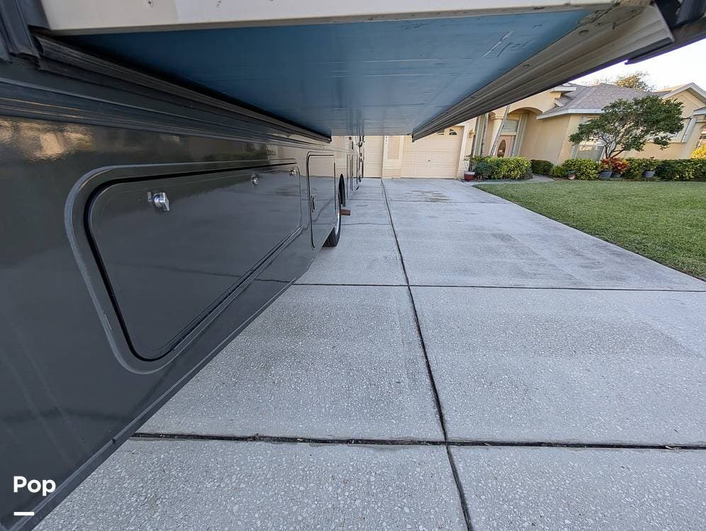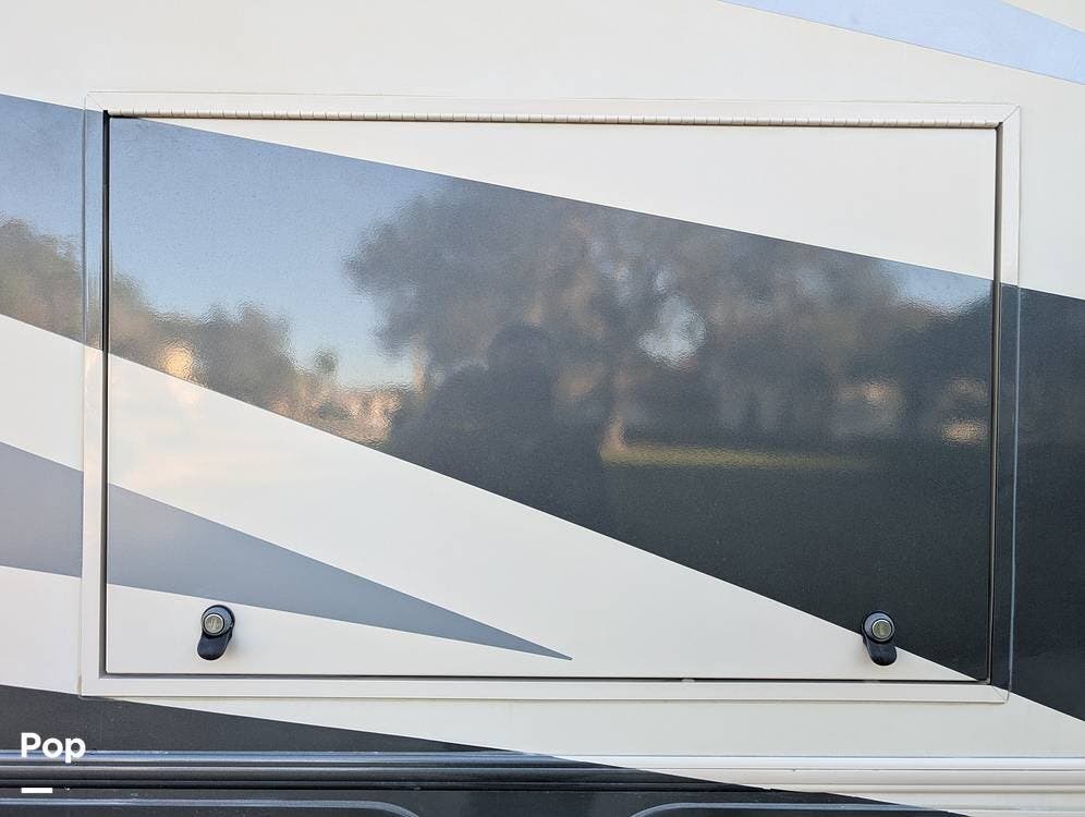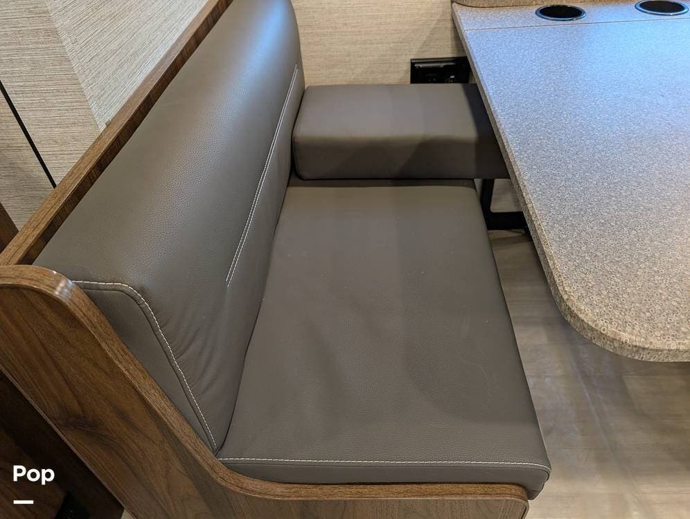 The exterior features partial full-body paint, a power awning, hydraulic leveling jacks, an exterior entertainment center, and ample basement storage for all your gear. Inside, the coach offers a comfortable, thoughtfully designed living space with swiveling captain's chairs, a power-retractable bunk above the cockpit, a reclining theater sofa, a convertible booth dinette, and a huge main TV, comfortably sleeping up to six people.