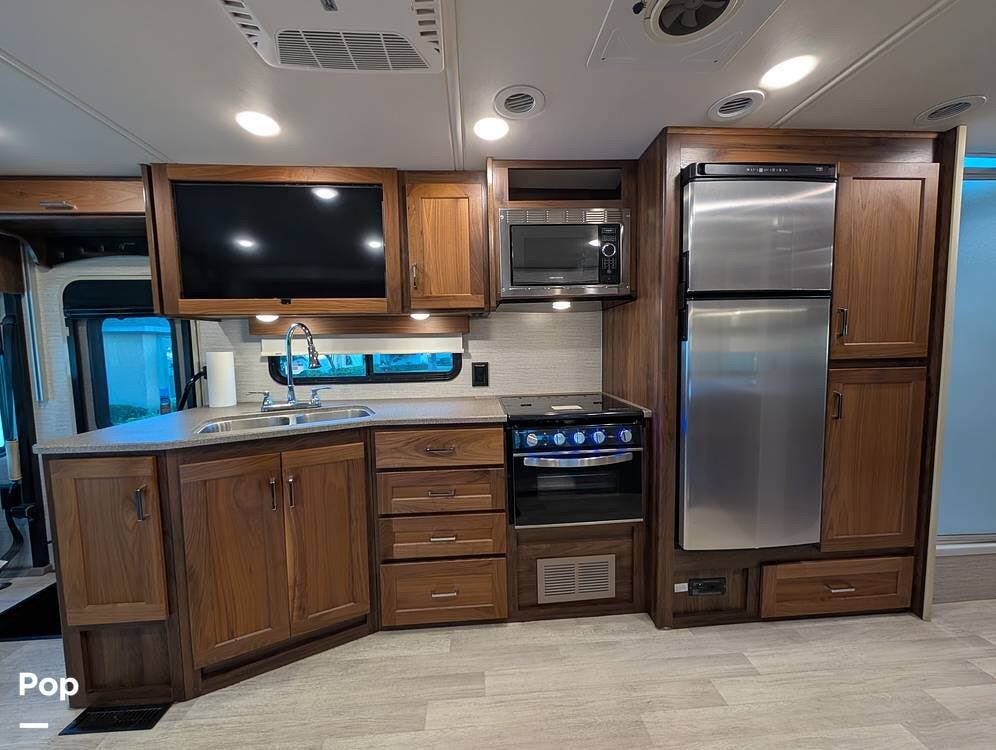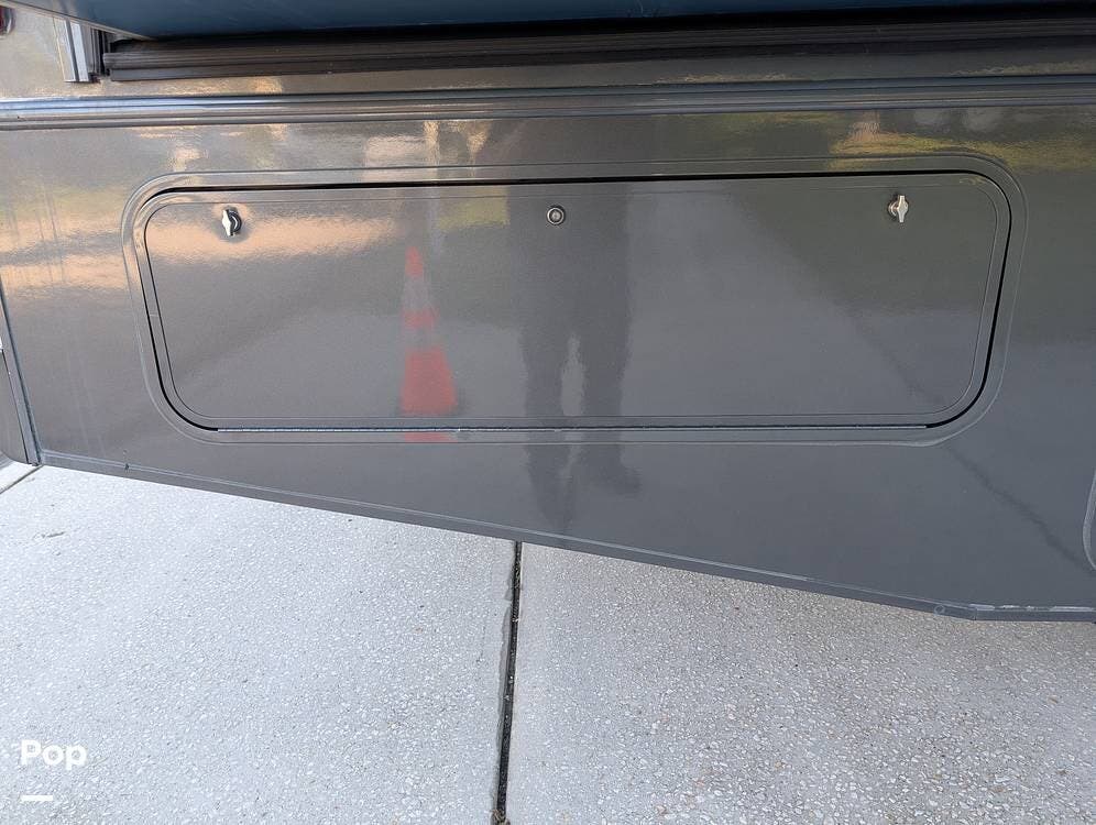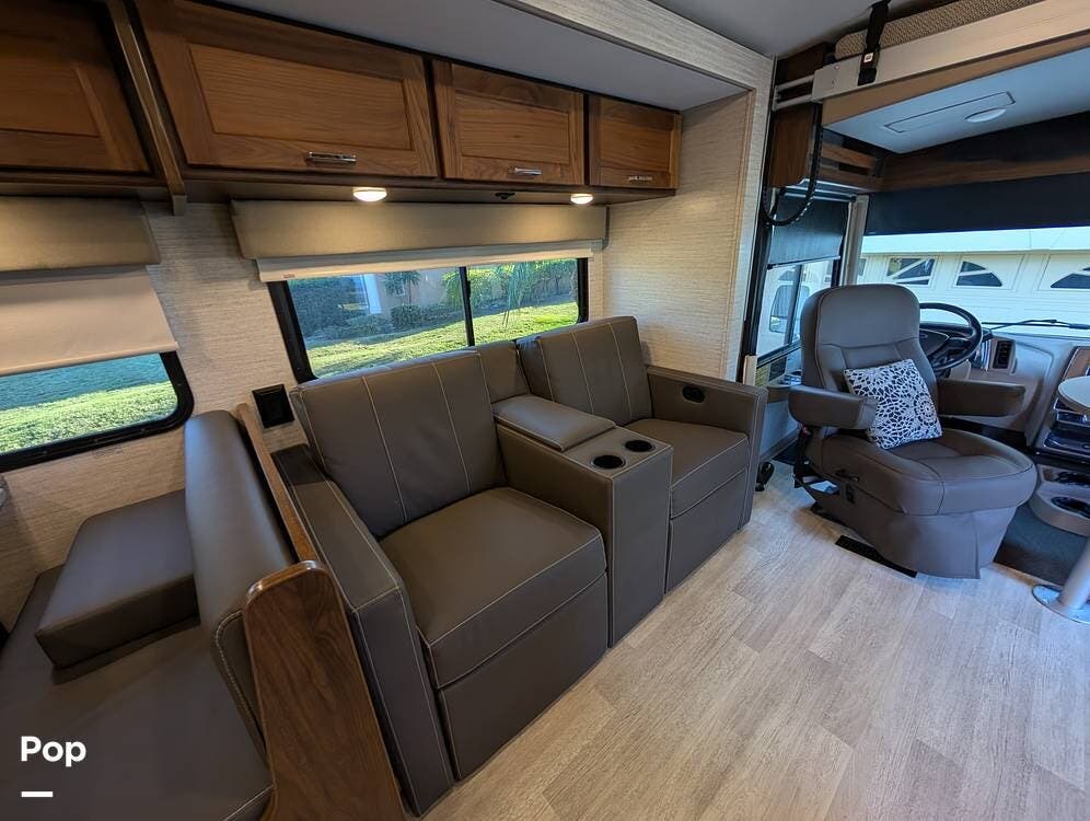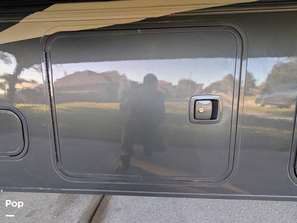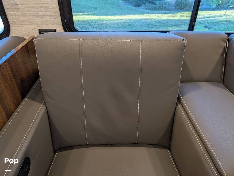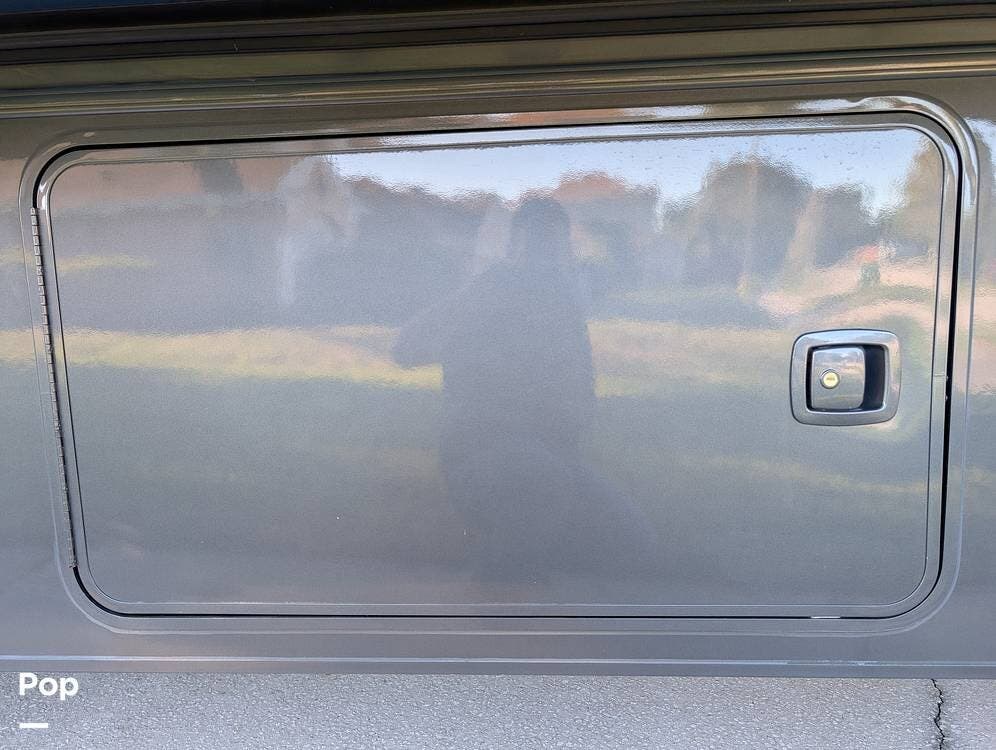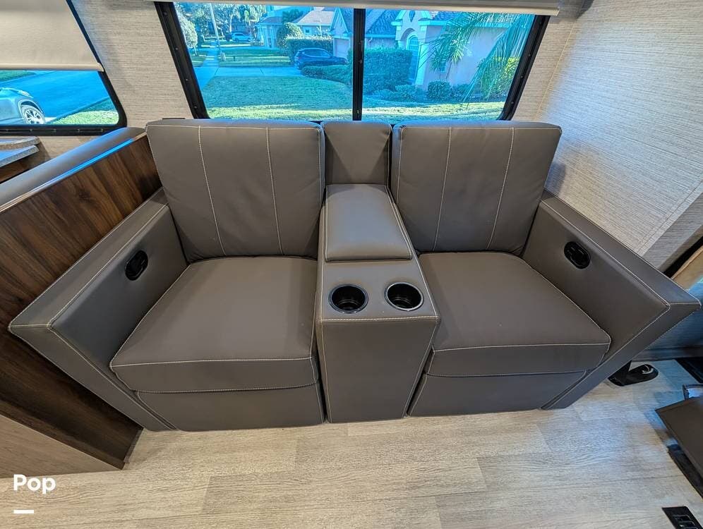 The exterior features partial full-body paint, a power awning, hydraulic leveling jacks, an exterior entertainment center, and ample basement storage for all your gear. Inside, the coach offers a comfortable, thoughtfully designed living space with swiveling captain's chairs, a power-retractable bunk above the cockpit, a reclining theater sofa, a convertible booth dinette, and a huge main TV, comfortably sleeping up to six people.
