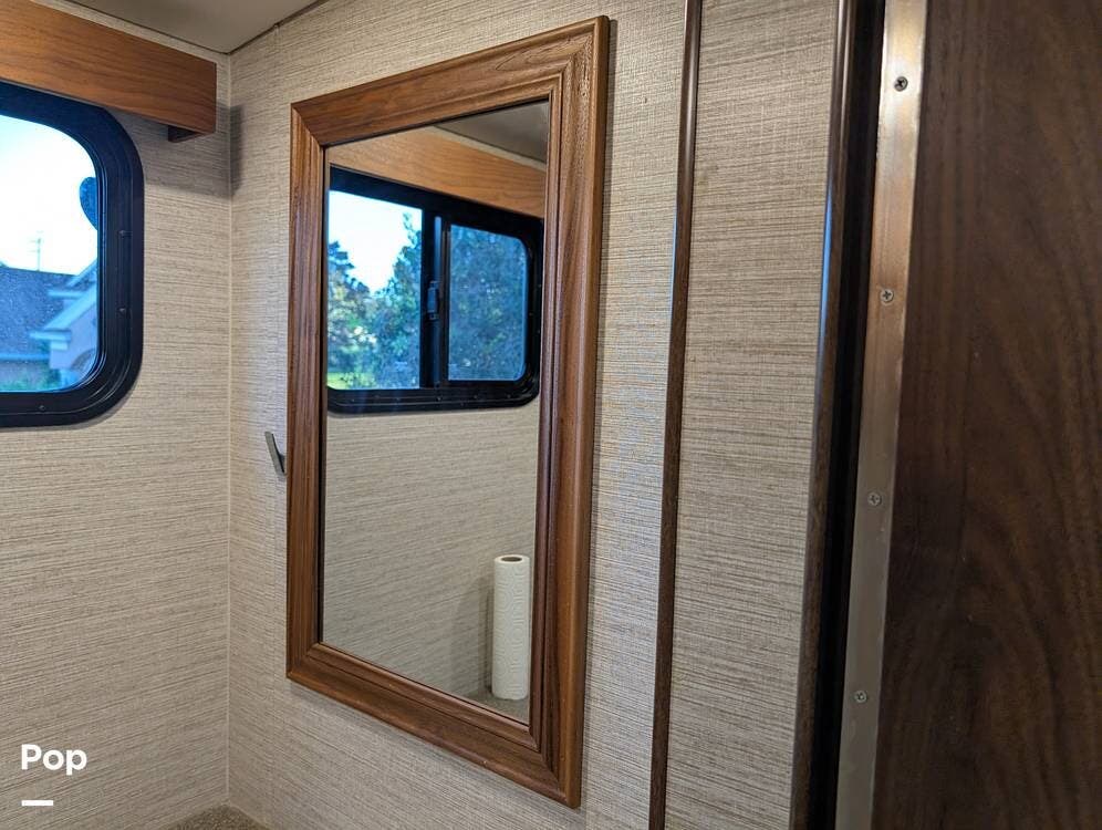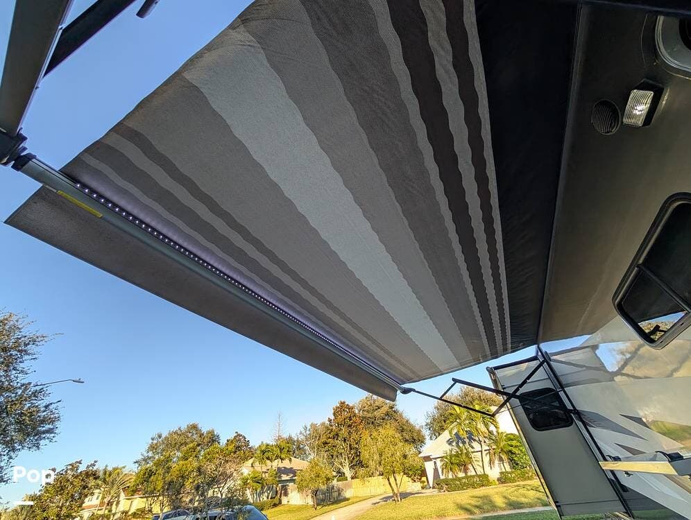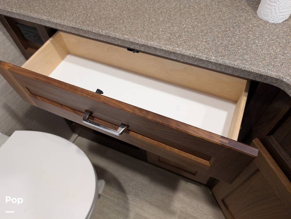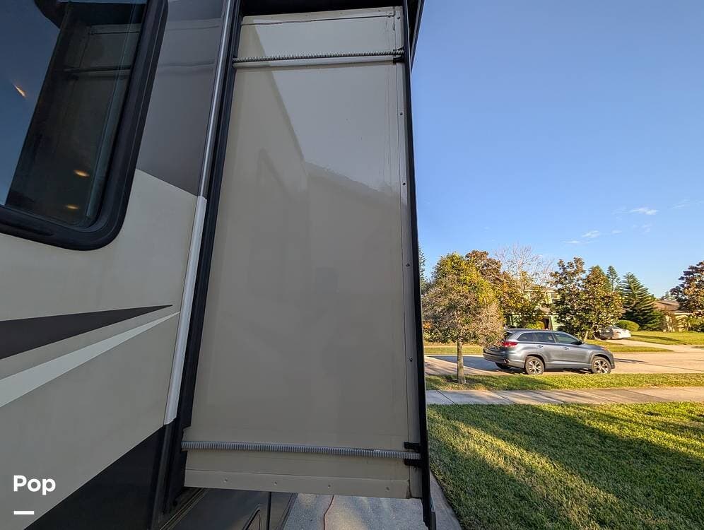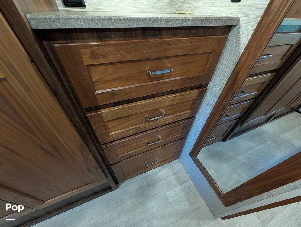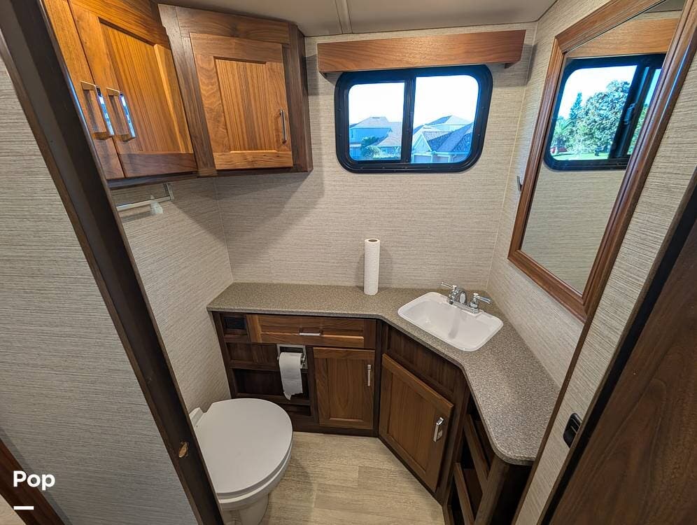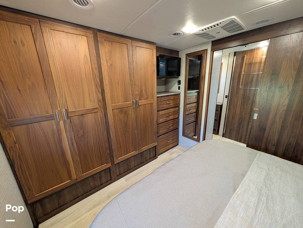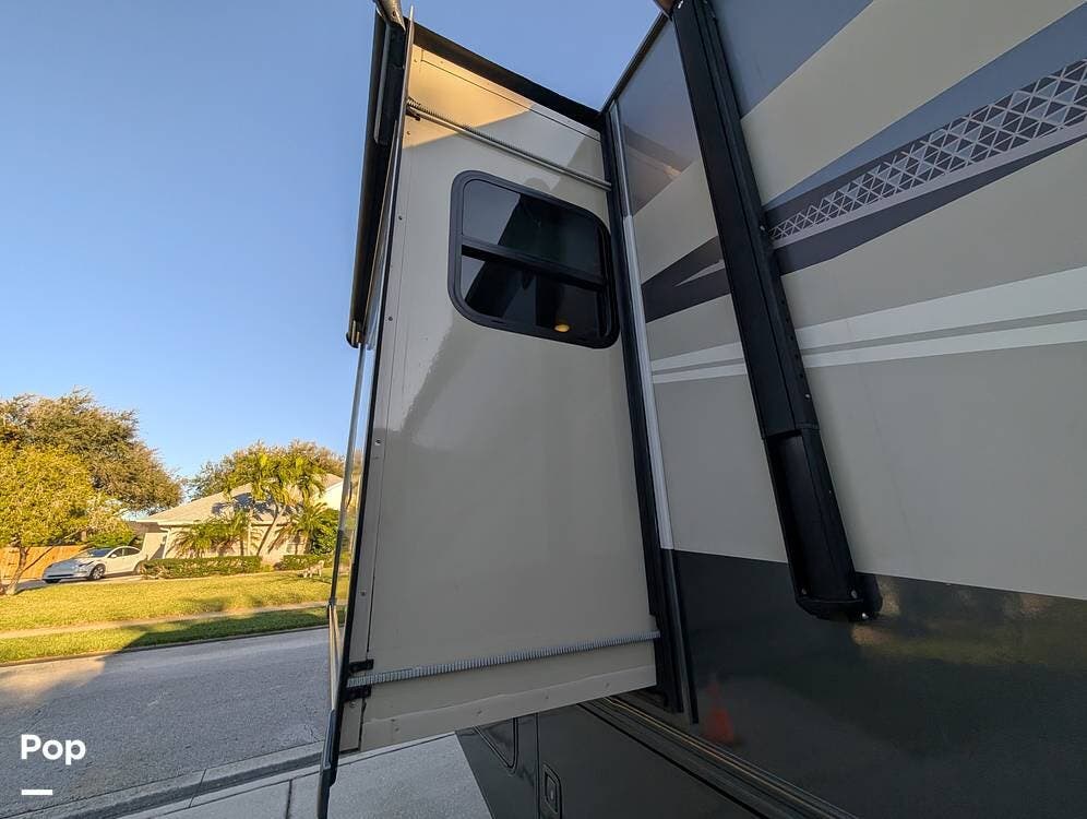 The exterior features partial full-body paint, a power awning, hydraulic leveling jacks, an exterior entertainment center, and ample basement storage for all your gear. Inside, the coach offers a comfortable, thoughtfully designed living space with swiveling captain's chairs, a power-retractable bunk above the cockpit, a reclining theater sofa, a convertible booth dinette, and a huge main TV, comfortably sleeping up to six people.