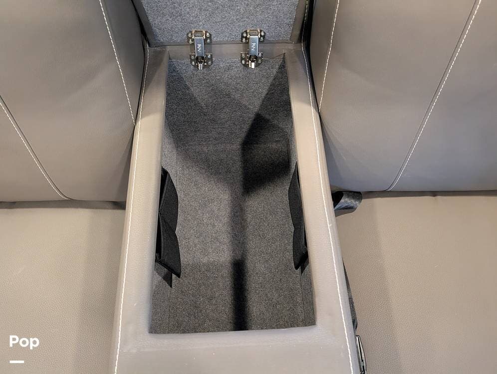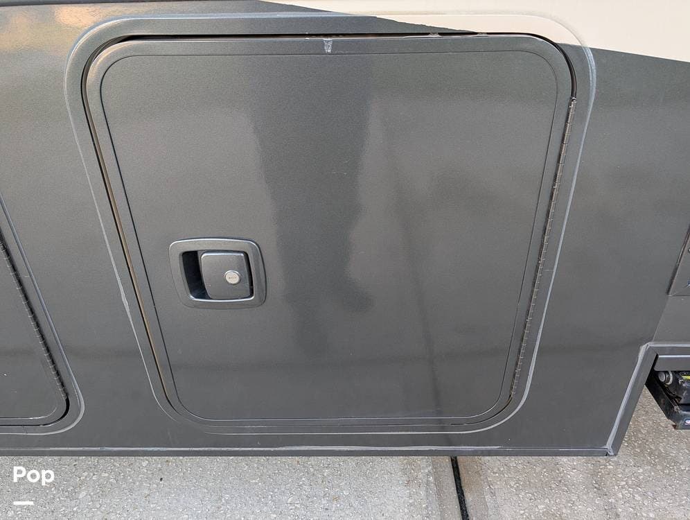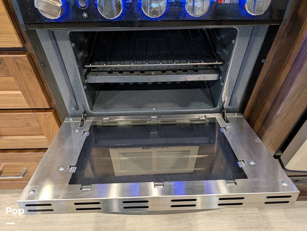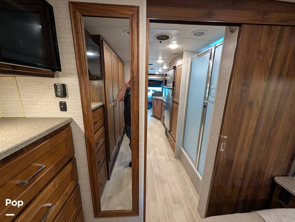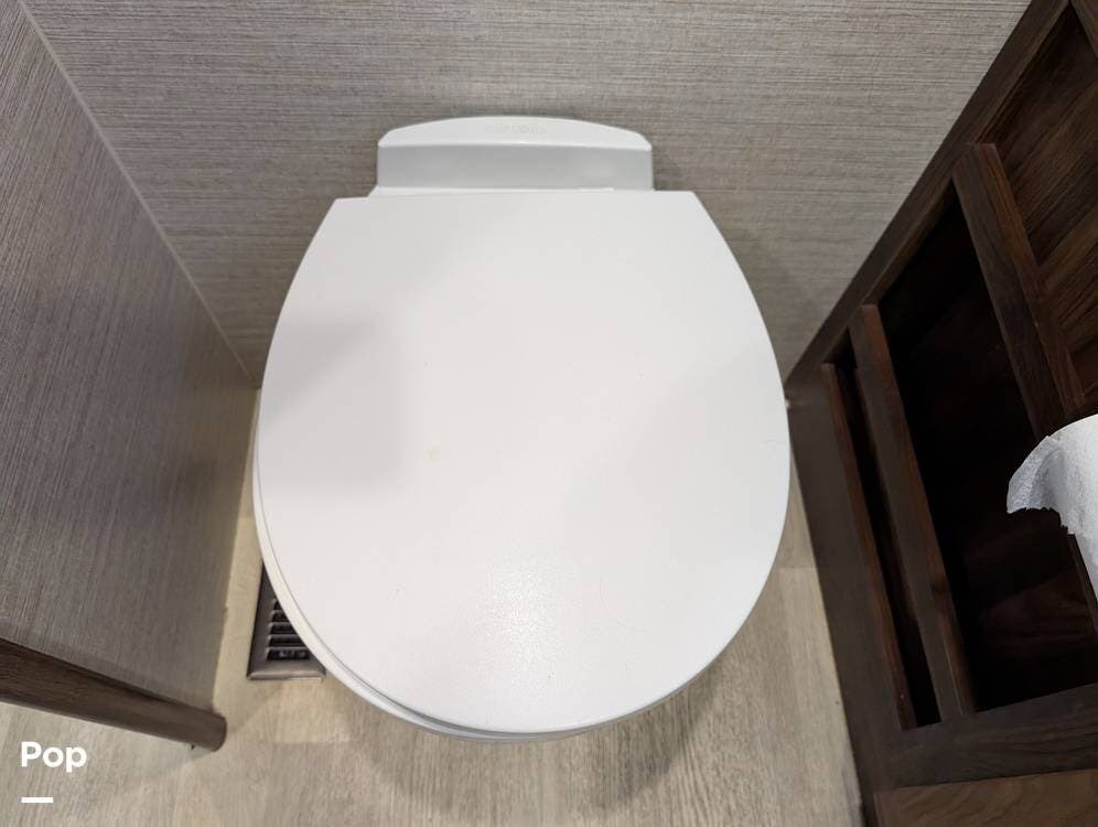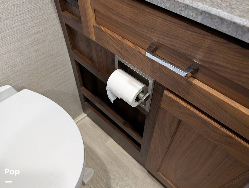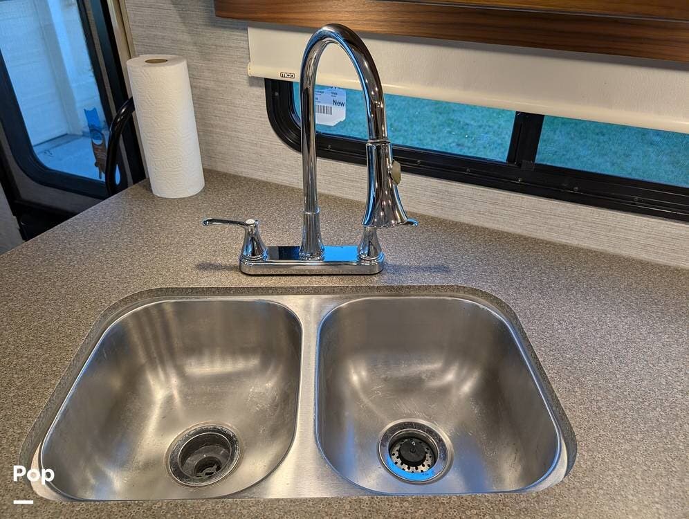 The exterior features partial full-body paint, a power awning, hydraulic leveling jacks, an exterior entertainment center, and ample basement storage for all your gear. Inside, the coach offers a comfortable, thoughtfully designed living space with swiveling captain's chairs, a power-retractable bunk above the cockpit, a reclining theater sofa, a convertible booth dinette, and a huge main TV, comfortably sleeping up to six people.
