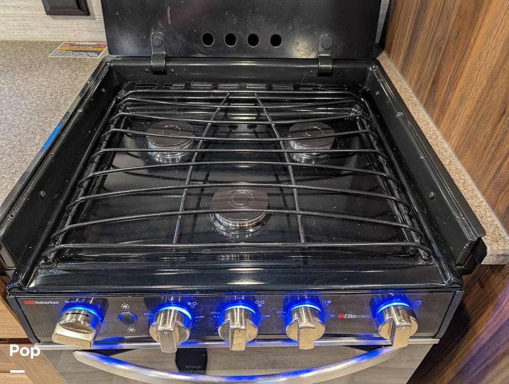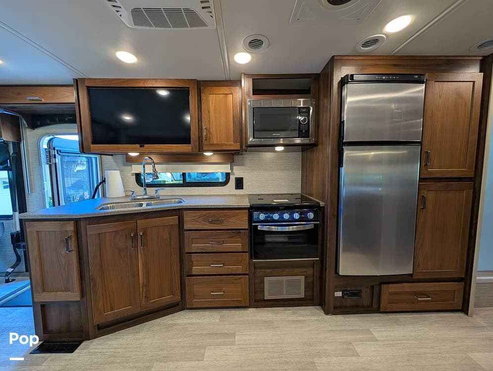 The kitchen is fully equipped with a dual stainless steel sink, microwave, three-burner gas stove with oven, and a 12-volt refrigerator/freezer, making meal prep easy on the road.