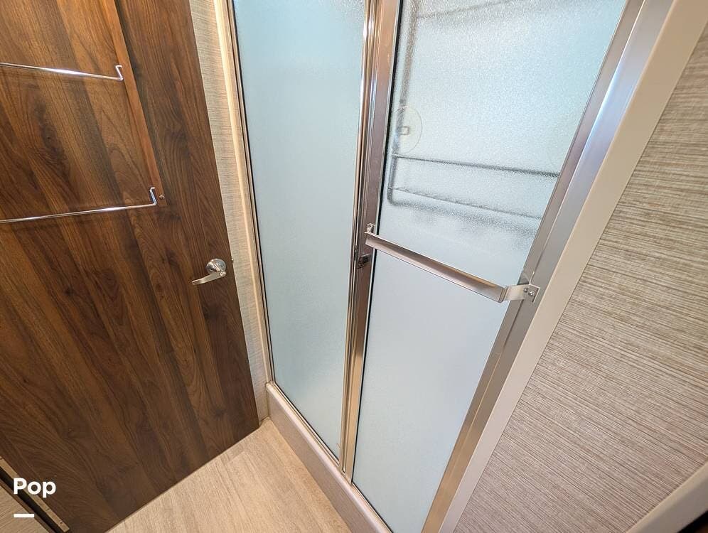 The mid-bath layout includes a large fiberglass shower with a frosted glass door, plus a separate private toilet room with its own vanity, sink, and storage.