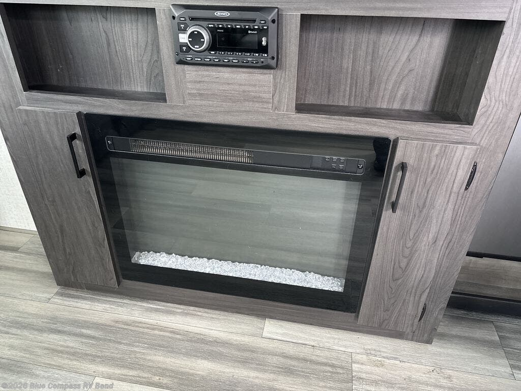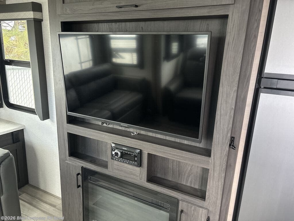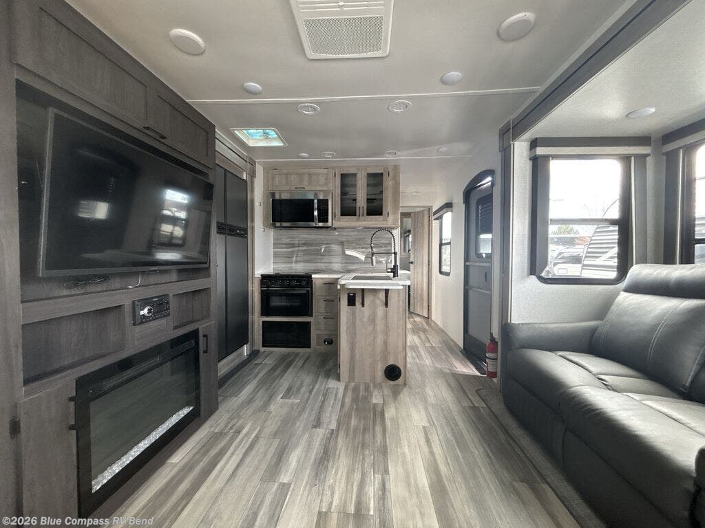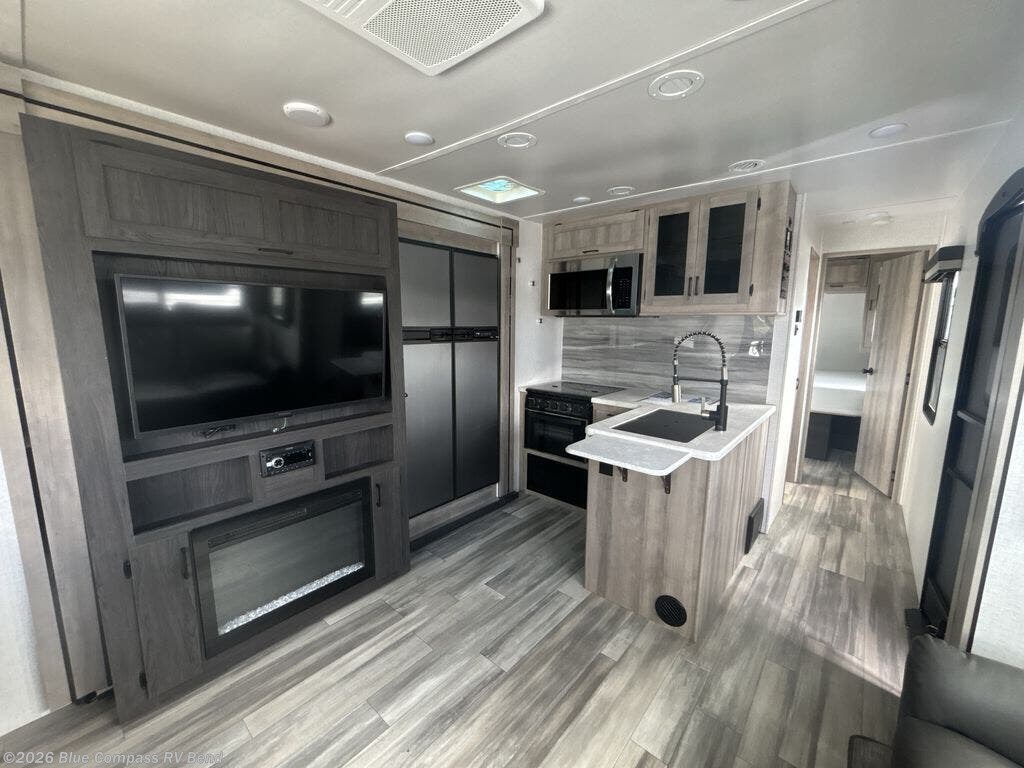 Looking to unwind indoors when you aren't hiking around the trails? This trailer has extra gathering space in the rear living area because of the opposing slides that hold the theater seating on one side, and the hidden pantry behind the entertainment center and LED TV with fireplace below and the 10.3-cubic foot refrigerator on the other side. There is also a tri-fold sofa in the rear with end tables on either side so that you can easily keep your drinks nearby. As you get cleaned up in the full bathroom, you'll love that the large skylight brings in some extra illumination, and you can use the front private bedroom to change your clothes throughout the day.
