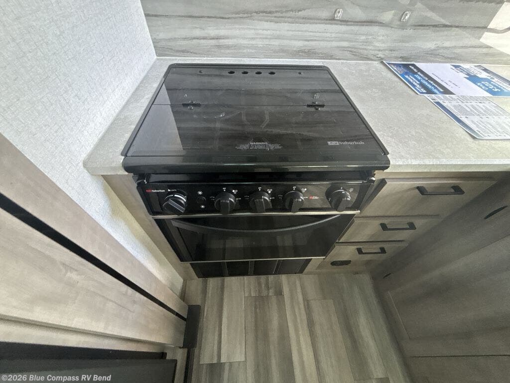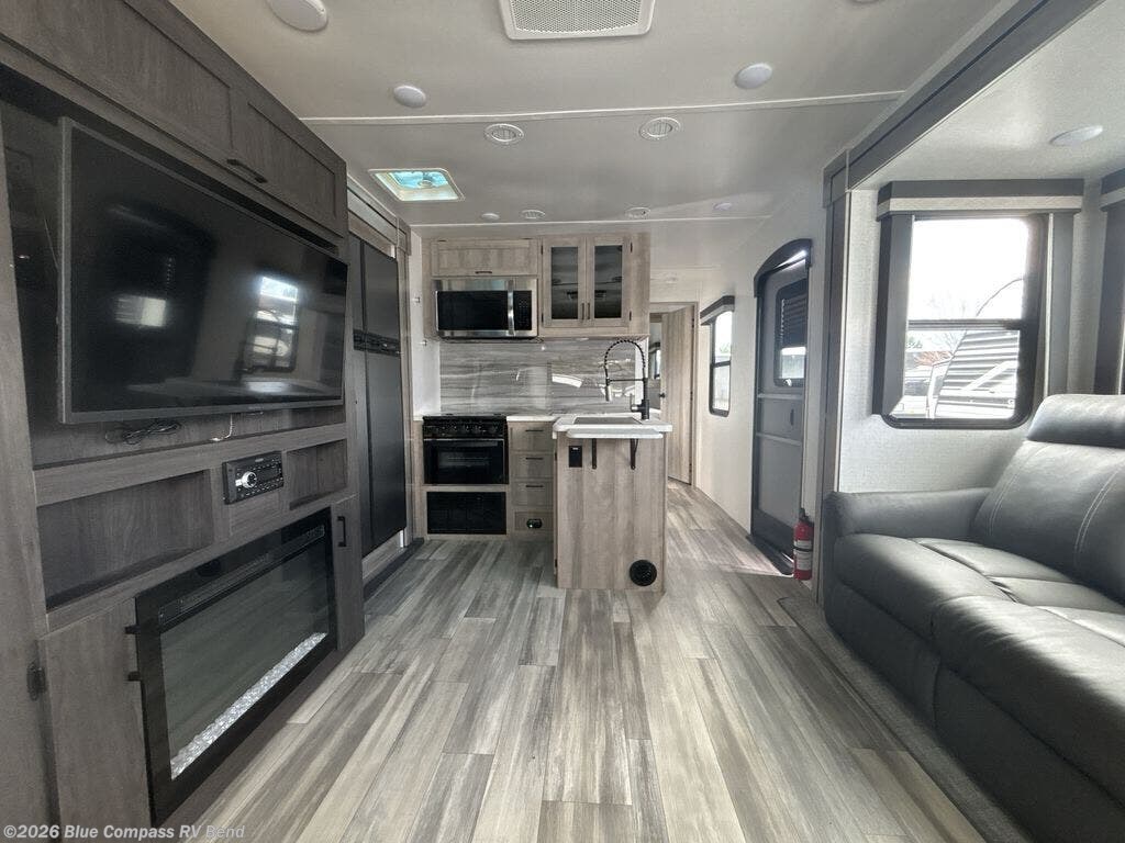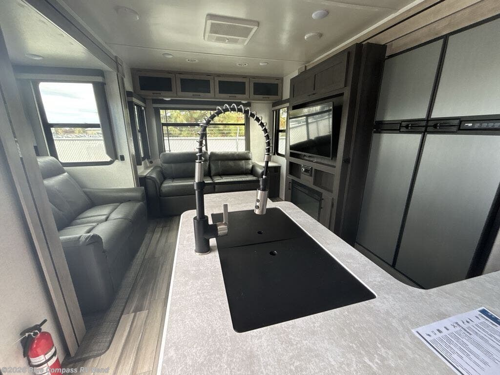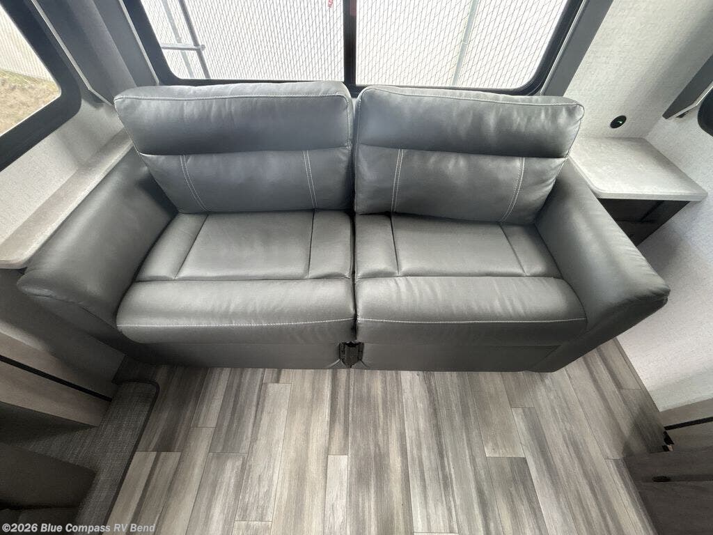 Looking to unwind indoors when you aren't hiking around the trails? This trailer has extra gathering space in the rear living area because of the opposing slides that hold the theater seating on one side, and the hidden pantry behind the entertainment center and LED TV with fireplace below and the 10.3-cubic foot refrigerator on the other side. There is also a tri-fold sofa in the rear with end tables on either side so that you can easily keep your drinks nearby. As you get cleaned up in the full bathroom, you'll love that the large skylight brings in some extra illumination, and you can use the front private bedroom to change your clothes throughout the day.