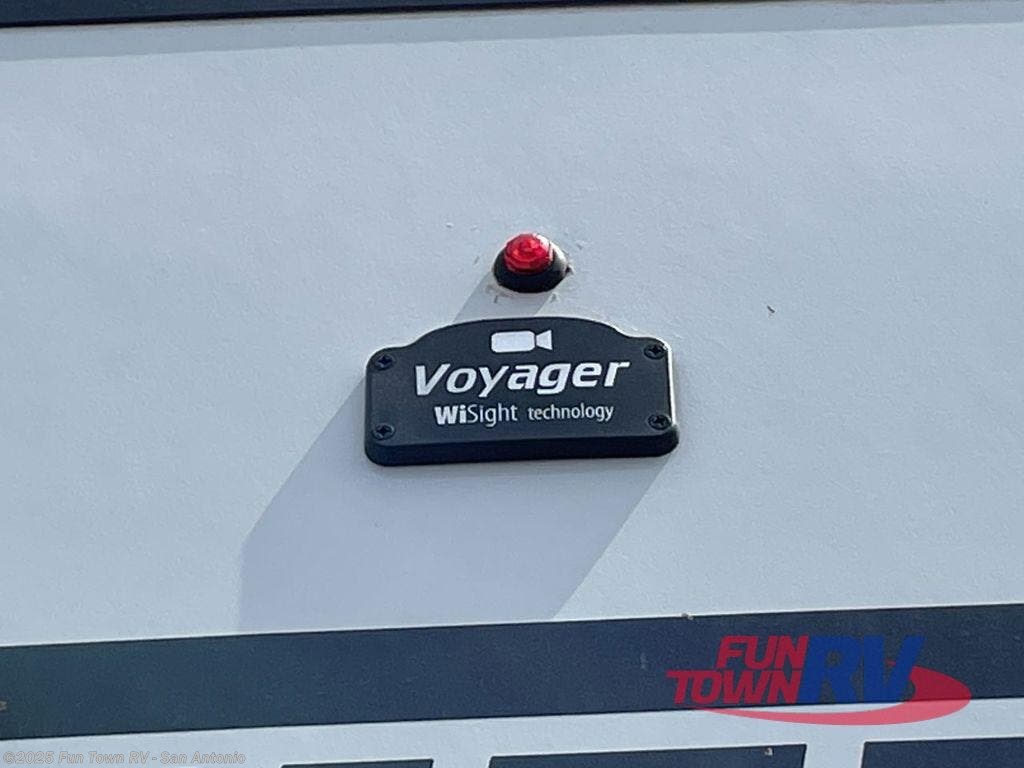 Each Voyage travel trailer by Winnebago Industries Towables includes two 100-watt solar panels with a charge control monitor so you can camp off-grid, satellite and antenna connections, and an antenna with wifi prep. Also included is a heated and enclosed underbelly with thermo foil insulation for four seasons of travel, a gel coat fiberglass front cap with integrated LED lighting, walk-on roof decking, plus four-point power/electric stabilizers for easy setup and stability. The interior offers comforts of home, large windows, ceiling LED lights, ductless flooring throughout, and full kitchen amenities. No voyage is better than the one taken in the Voyage travel trailer!
