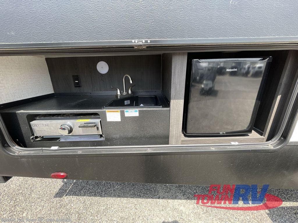 Whatever reason you get away from your daily schedule, you'll want to sleep in a little bit longer each morning since you will have your own private bedroom in the front with a queen bed or choose the king option, and since the bedroom has the second exterior entry door, you can come and go as you please. Your guests or your kids will also have a comfortable place to spend the night with the double-size bunks in the back. And if you do happen to have even more people traveling with you, there is a tri-fold sofa and booth dinette slide out that can provide more sleeping space. The indoor kitchen is fully equipped with a recessed three-burner cooktop and convection microwave for delicious meals, but there is also an exterior kitchen that you can use for some summertime fun.