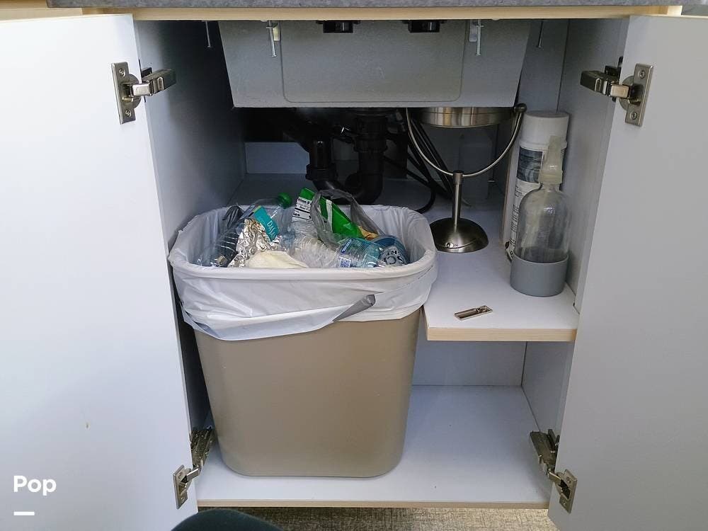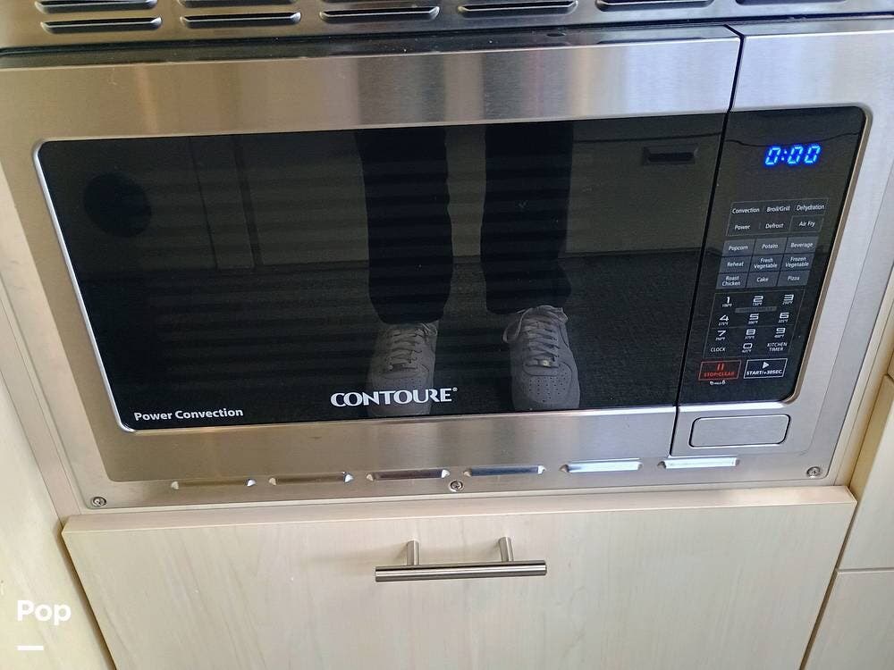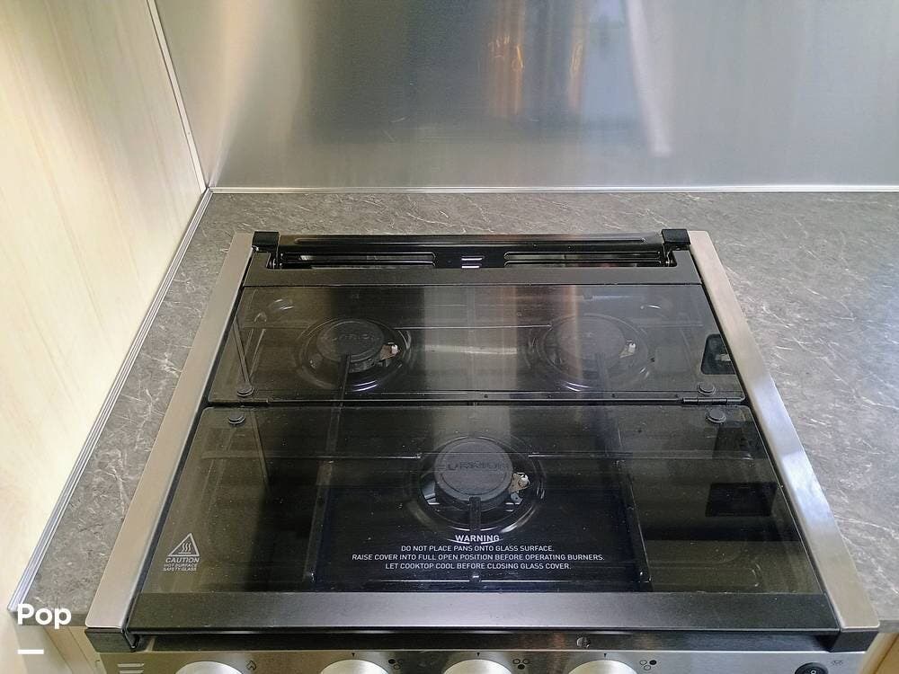 Inside, large panoramic windows let in plenty of natural light. The lounge area has soft, premium seating, great for relaxing or dining. The kitchen has a three-burner gas stove, a convection microwave, a deep stainless-steel sink, and a large fridge. Solid-surface countertops add a modern touch.