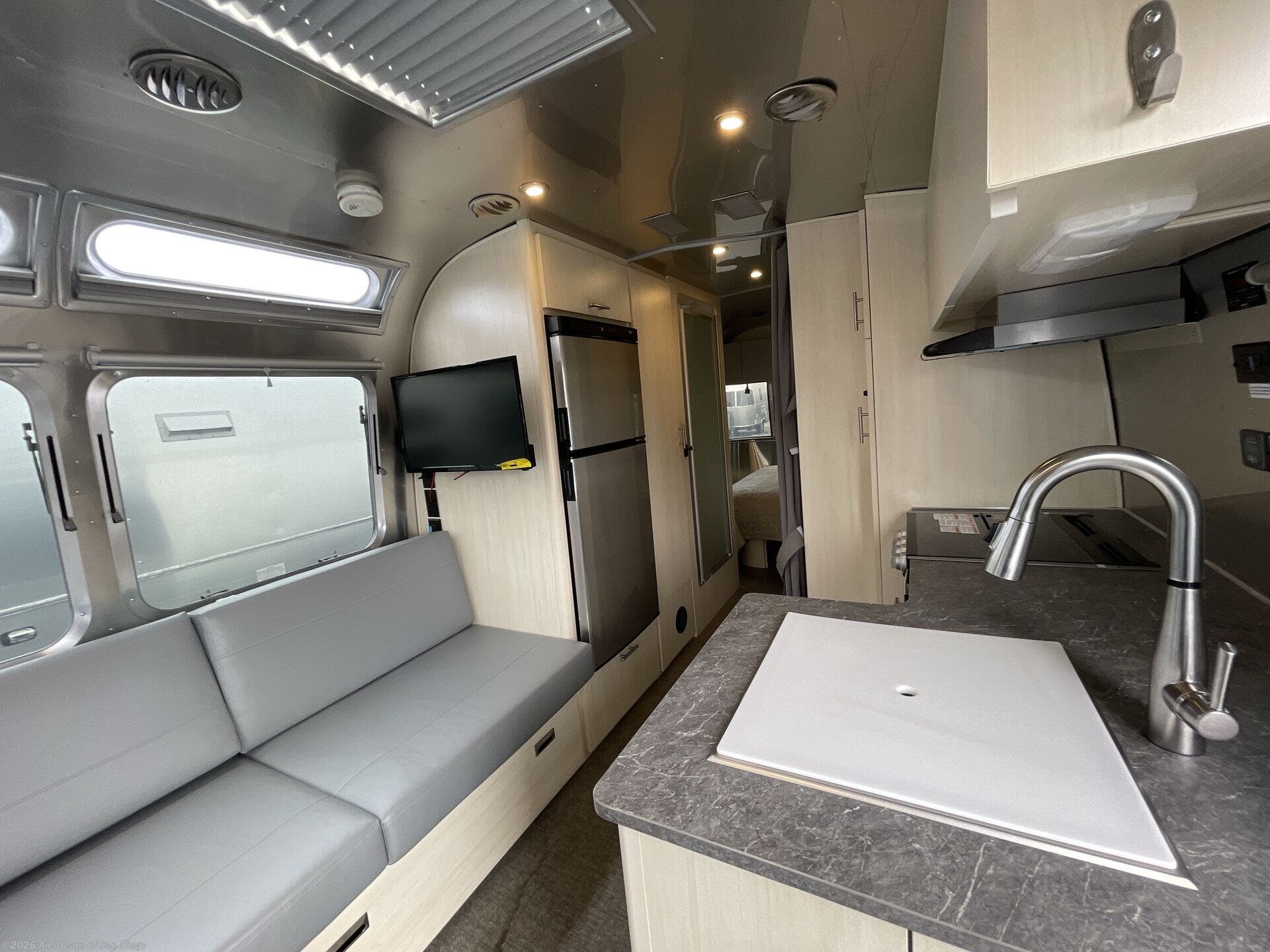 With each Flying Cloud travel trailer by Airstream, there are two axles, and each is built for ease of towing, plus there is a rear-view camera to make reversing and parking easier, and stainless steel front stone guards to protect the lower segments from road debris. The iconic Airstream design is created outside and inside by the semi-monocoque aluminum superstructure, the temperature reducing one-piece white aluminum roof, the panoramic front windows, and the stylish aluminum wheels. The interior will have you feeling right at home with handcrafted cabinetry, plenty of storage and counter space, sleek roller blinds and blackout curtains, plus residential style faucets!
