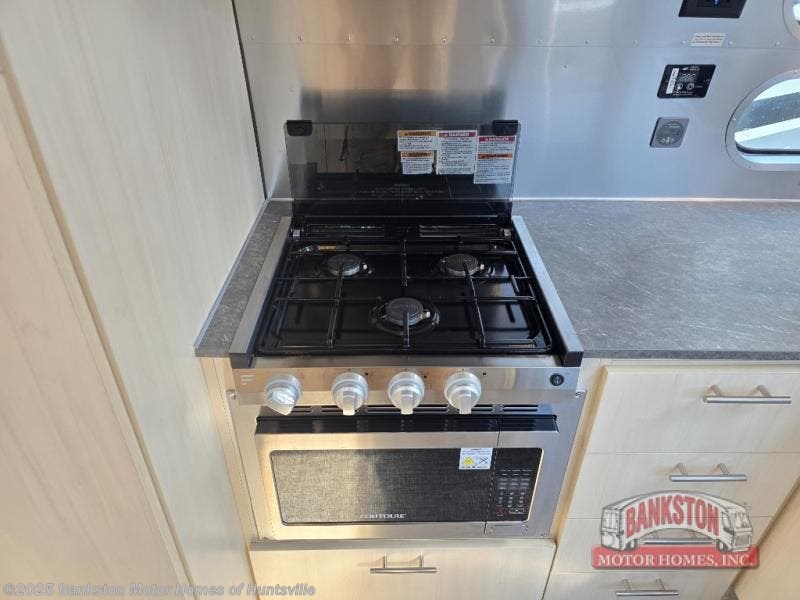 With each Flying Cloud travel trailer by Airstream, there are two axles, and each is built for ease of towing, plus there is a rear-view camera to make reversing and parking easier, and stainless steel front stone guards to protect the lower segments from road debris. The iconic Airstream design is created outside and inside by the semi-monocoque aluminum superstructure, the temperature reducing one-piece white aluminum roof, the panoramic front windows, and the stylish aluminum wheels. The interior will have you feeling right at home with handcrafted cabinetry, plenty of storage and counter space, sleek roller blinds and blackout curtains, plus residential style faucets!
