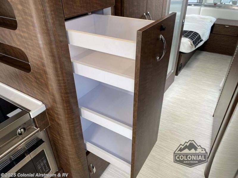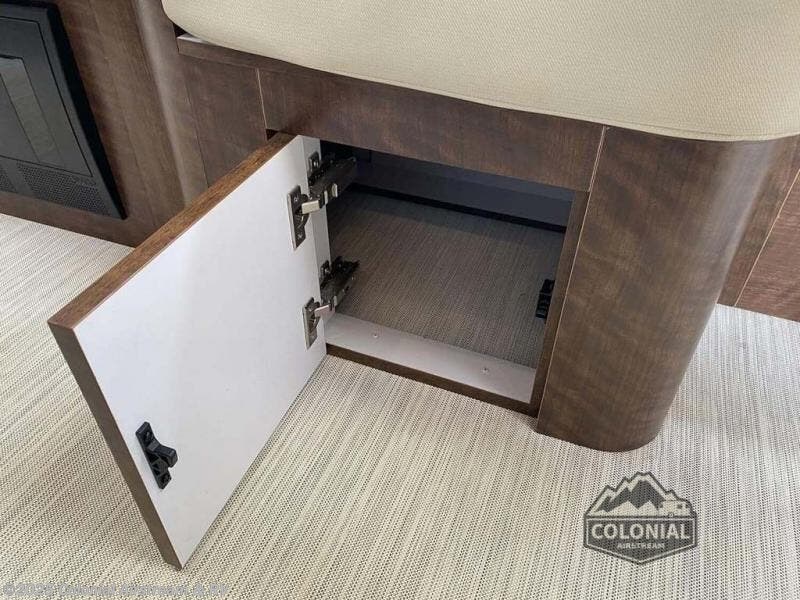 Start traveling the country in true luxury with this travel trailer! It features a front wrap around lounge with stain resistant Spradling Hitch fabric that can be pulled out and the table lowered to create a 38" x 78" bed. A separated bathroom makes it easy for one person to freshen up in the shower with a seat while another is across the way utilizing the private toilet and vanity. The rear queen bed has an AdaptaFlex memory foam mattress to enjoy a good night's rest, nightstands to set your glass of water, and an HD 12V TV to watch your favorite movie in bed. You will find plenty of storage throughout between the upper and lower kitchen cabinets, a slide-out pantry, multifunctional storage bins that are flush to the surface behind the deep stainless steel Moen sink, under-the-bed storage, and a closet to hang your clothes.