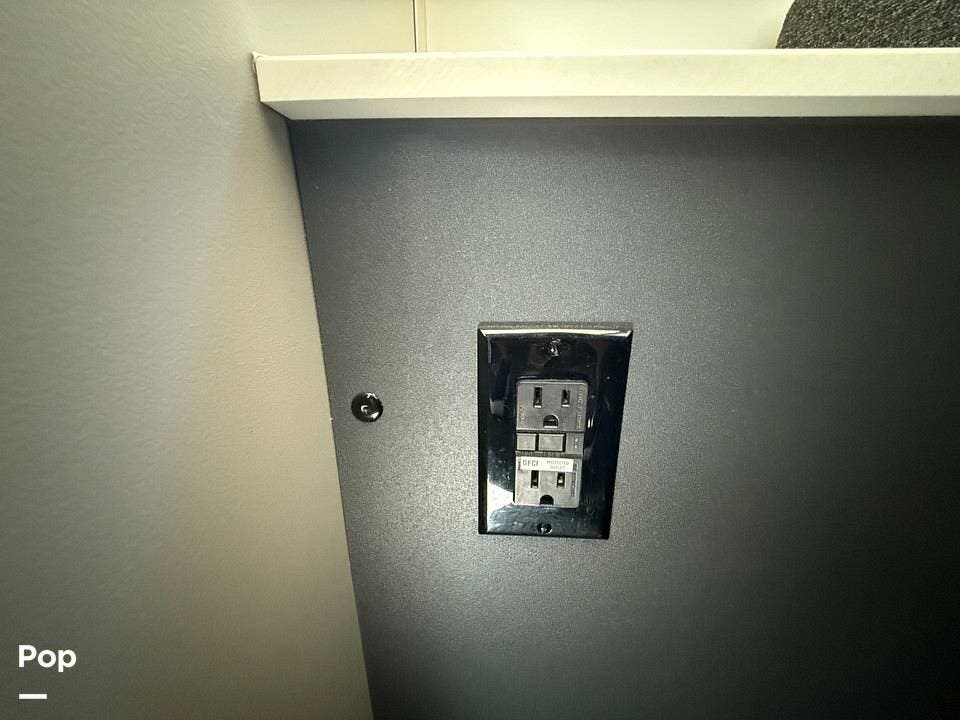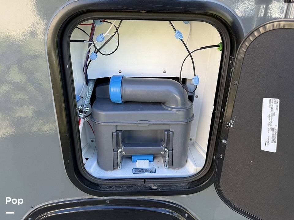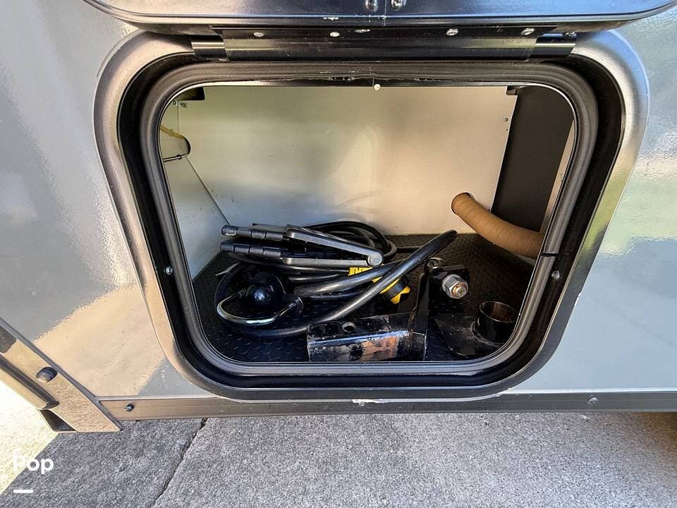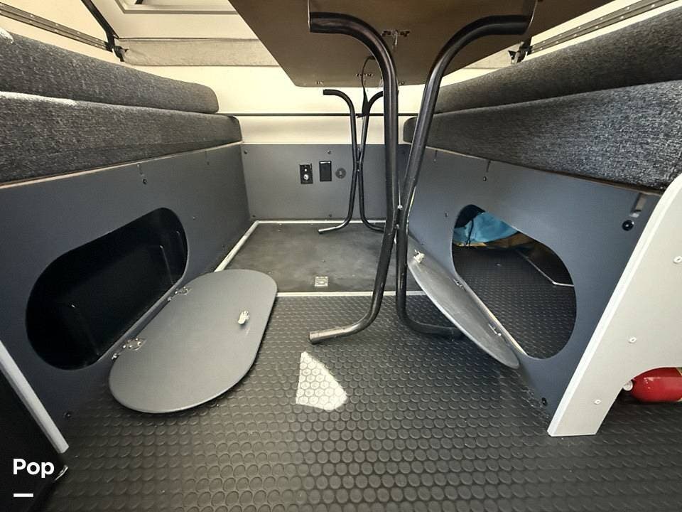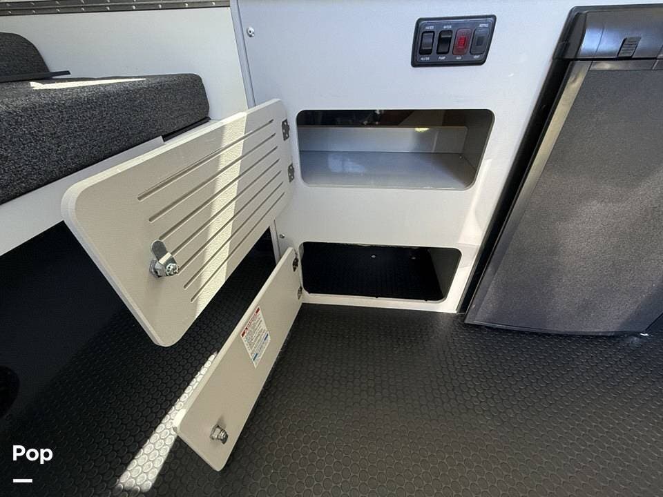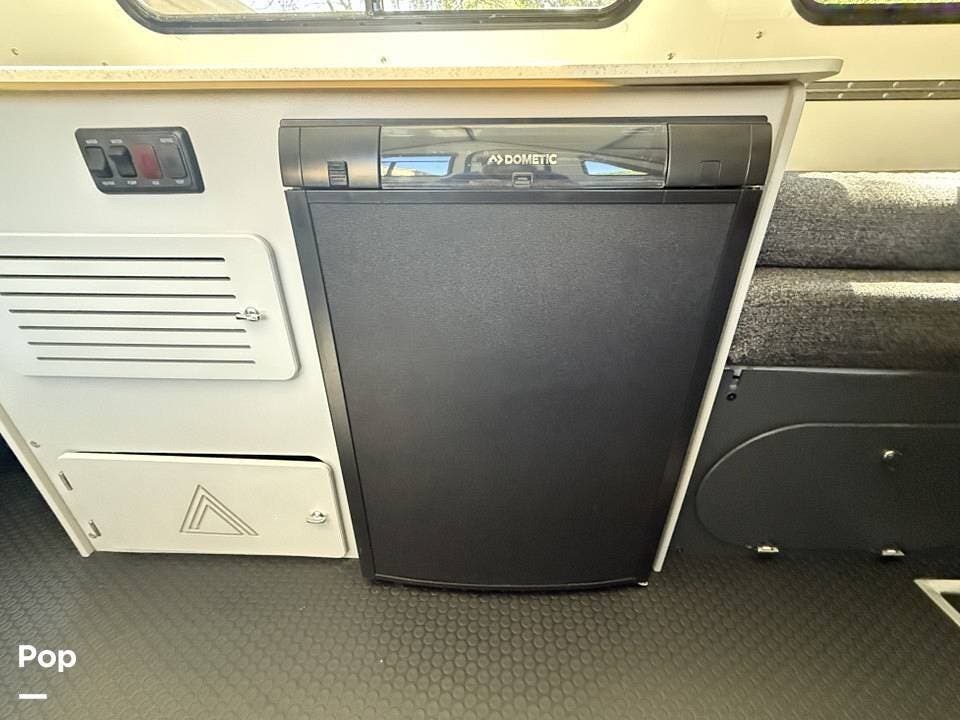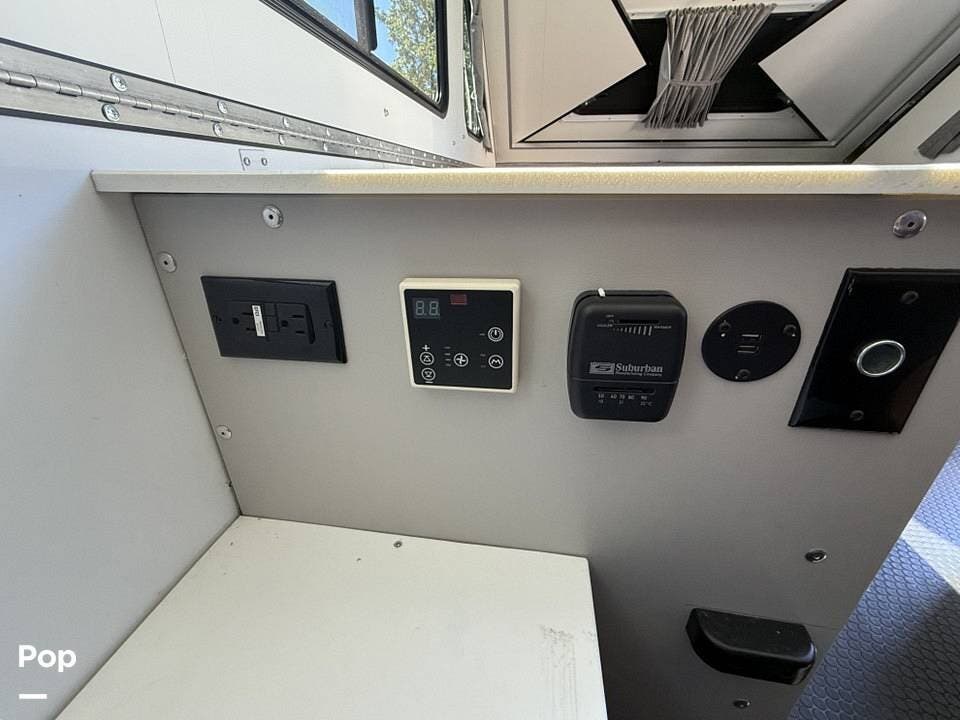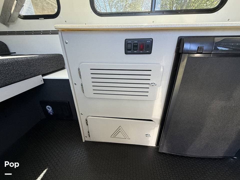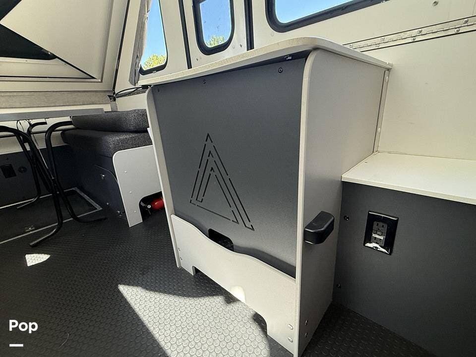 Year-round comfort is ensured with a heat pump A/C unit and a 16,000 BTU furnace. The interior features durable slate gray fiberglass, Azdel composite walls, upgraded upholstery, commercial-grade flooring, and aluminum-framed cabinetry with SIMONA BOATBOARD panels.