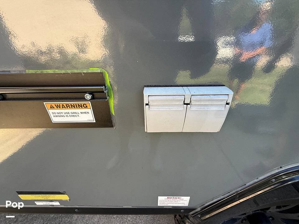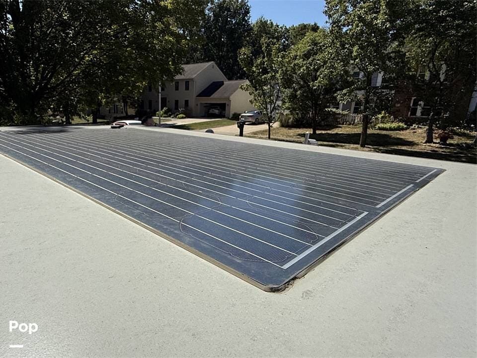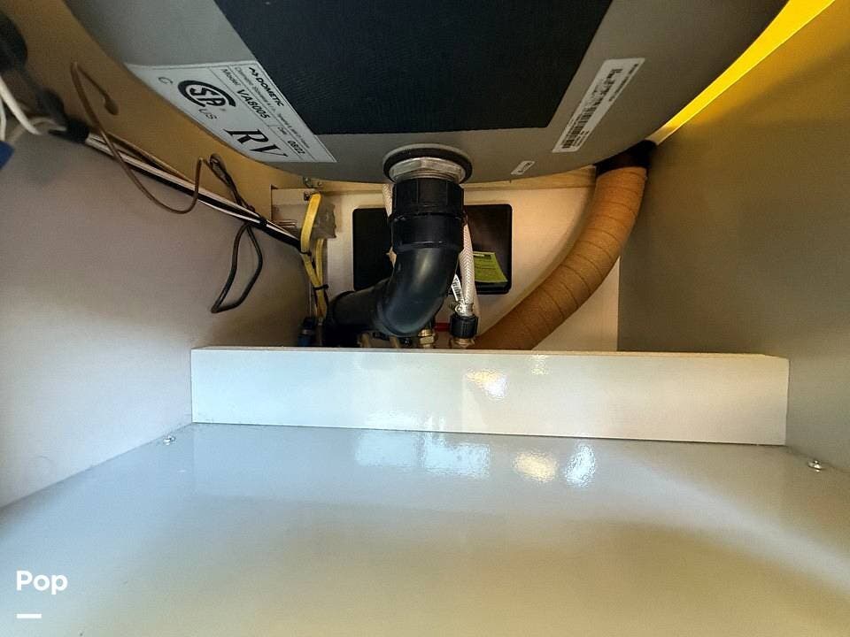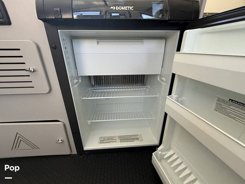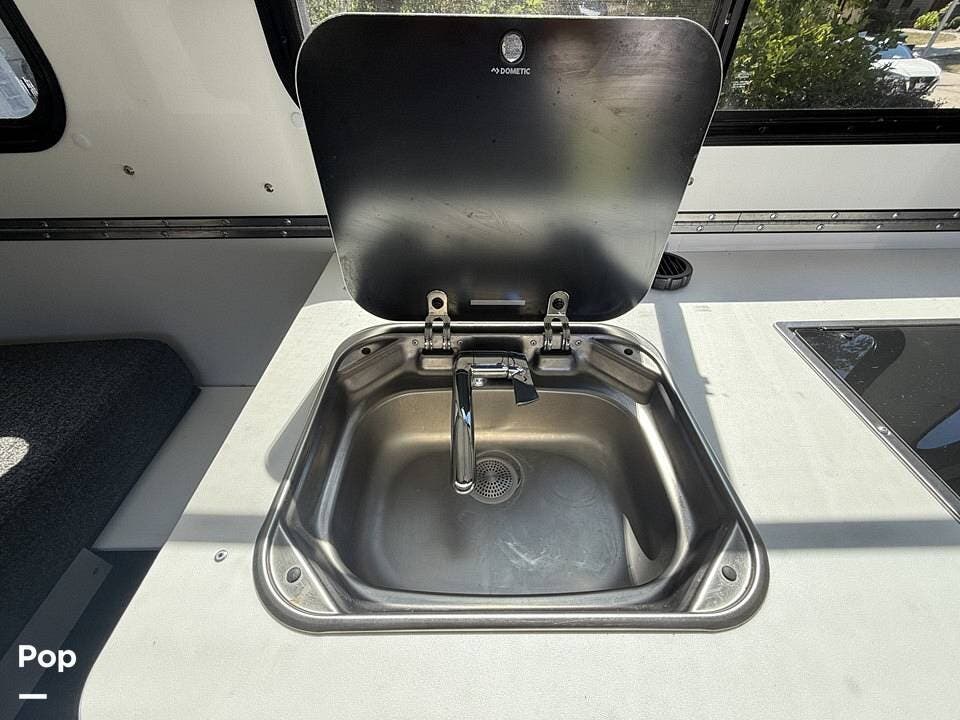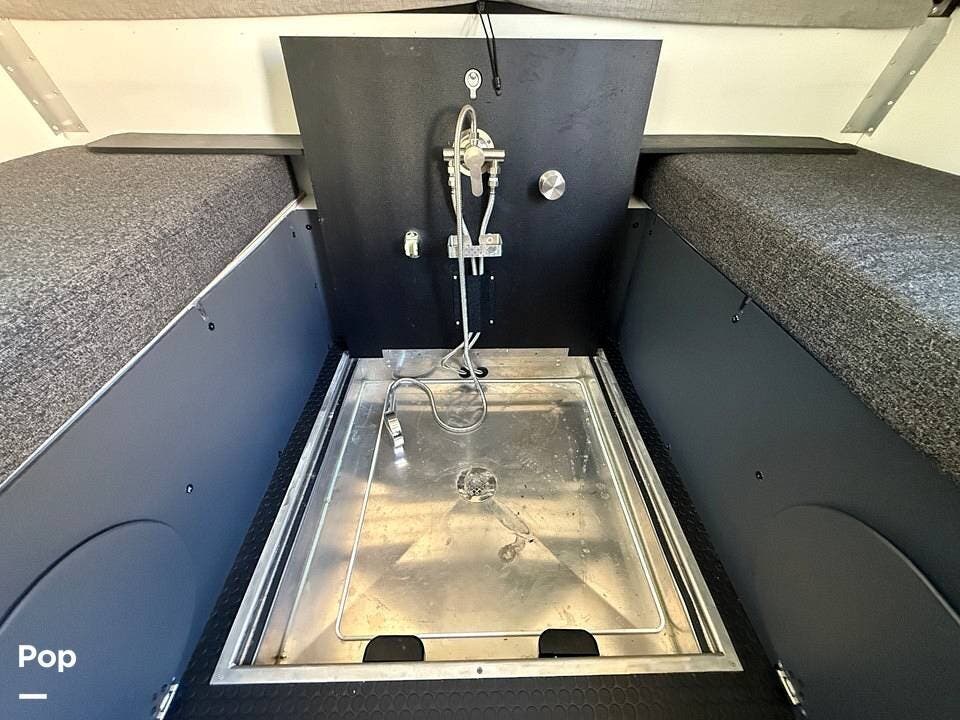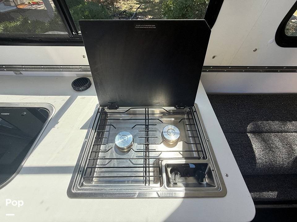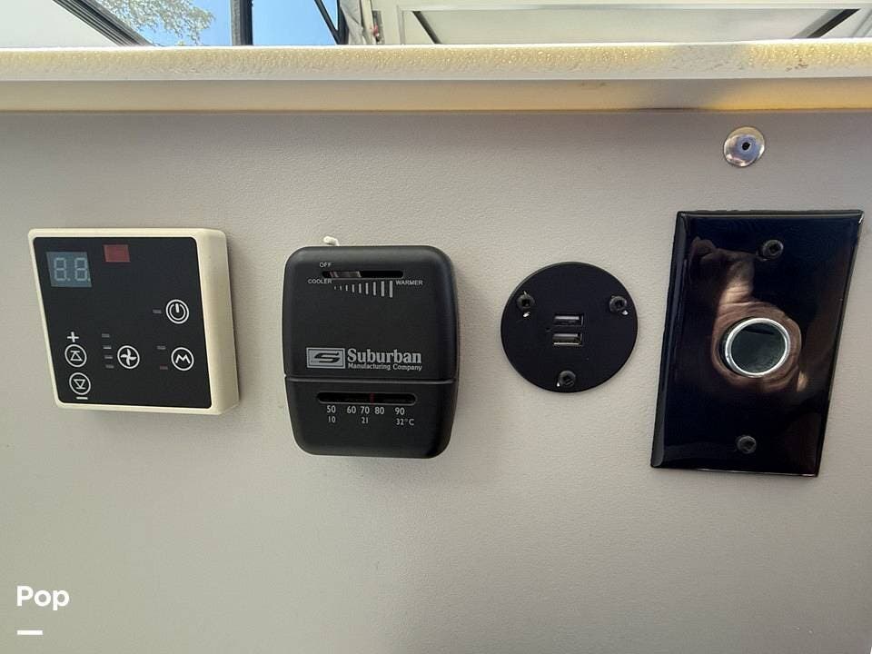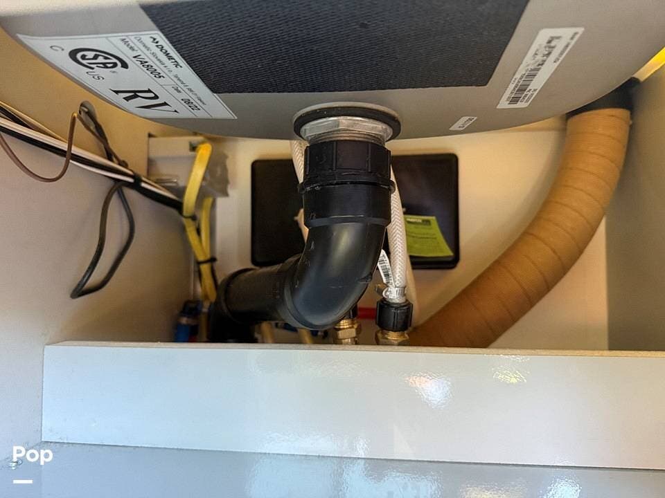 Year-round comfort is ensured with a heat pump A/C unit and a 16,000 BTU furnace. The interior features durable slate gray fiberglass, Azdel composite walls, upgraded upholstery, commercial-grade flooring, and aluminum-framed cabinetry with SIMONA BOATBOARD panels.